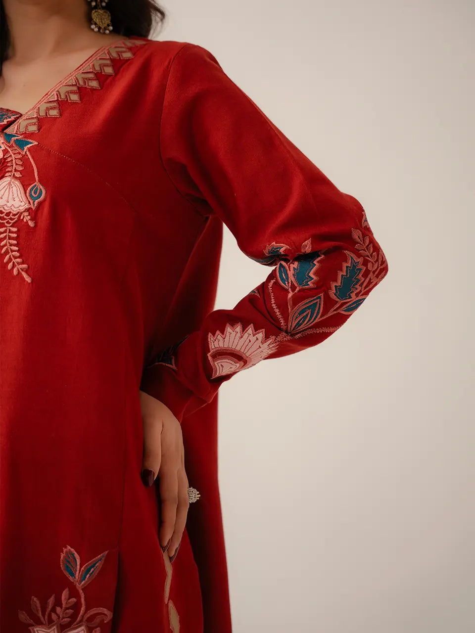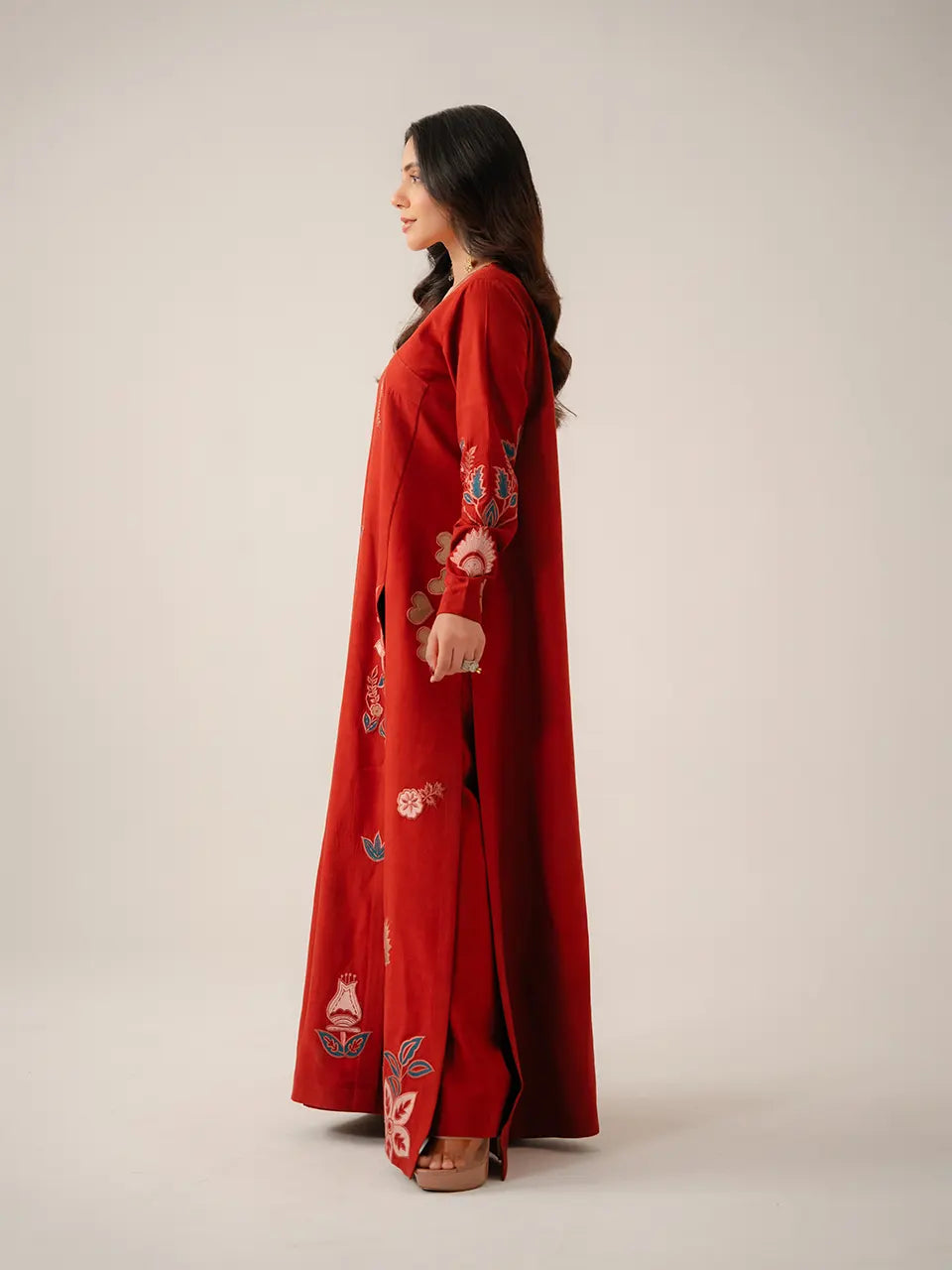 Key Details: Floor-length maxi silhouette, chevron neckline embroidery, multicolour folk appliqué throughout, full-sleeve floral appliqué, large hem appliqué motifs, tassel tie closure.