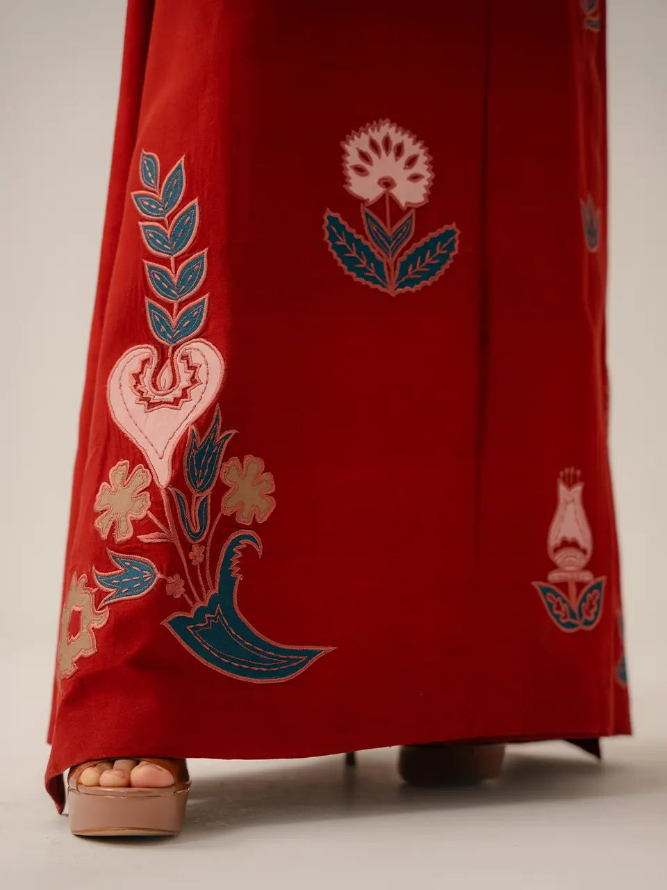 A sweeping floor-length maxi dress in a warm rust red, crafted on a solid base and brought to life through richly detailed multicolour appliqué work scattered across the entire garment. Large-scale folk-inspired motifs — lotus flowers, tulips, leafy botanicals, heart forms, and ornamental vases — are placed deliberately across the skirt in teal, blush, and beige tones, creating a hand-crafted, artisanal quality. The V-neckline features a chevron-patterned embroidered border in teal and blush, with a trailing floral and leaf embroidery motif descending from the collar, finished with a delicate tassel tie. Sleeves are adorned with a flowing all-over floral and leaf appliqué in teal and rose tones, while the hem and front slit carry large statement appliqué blooms for a dramatic, floor-grazing finish.