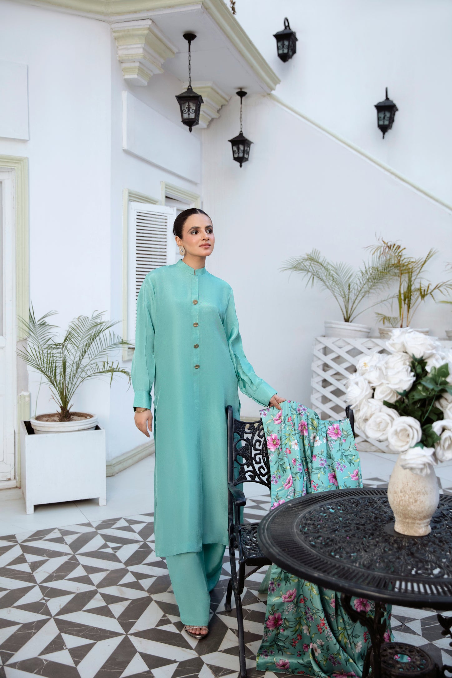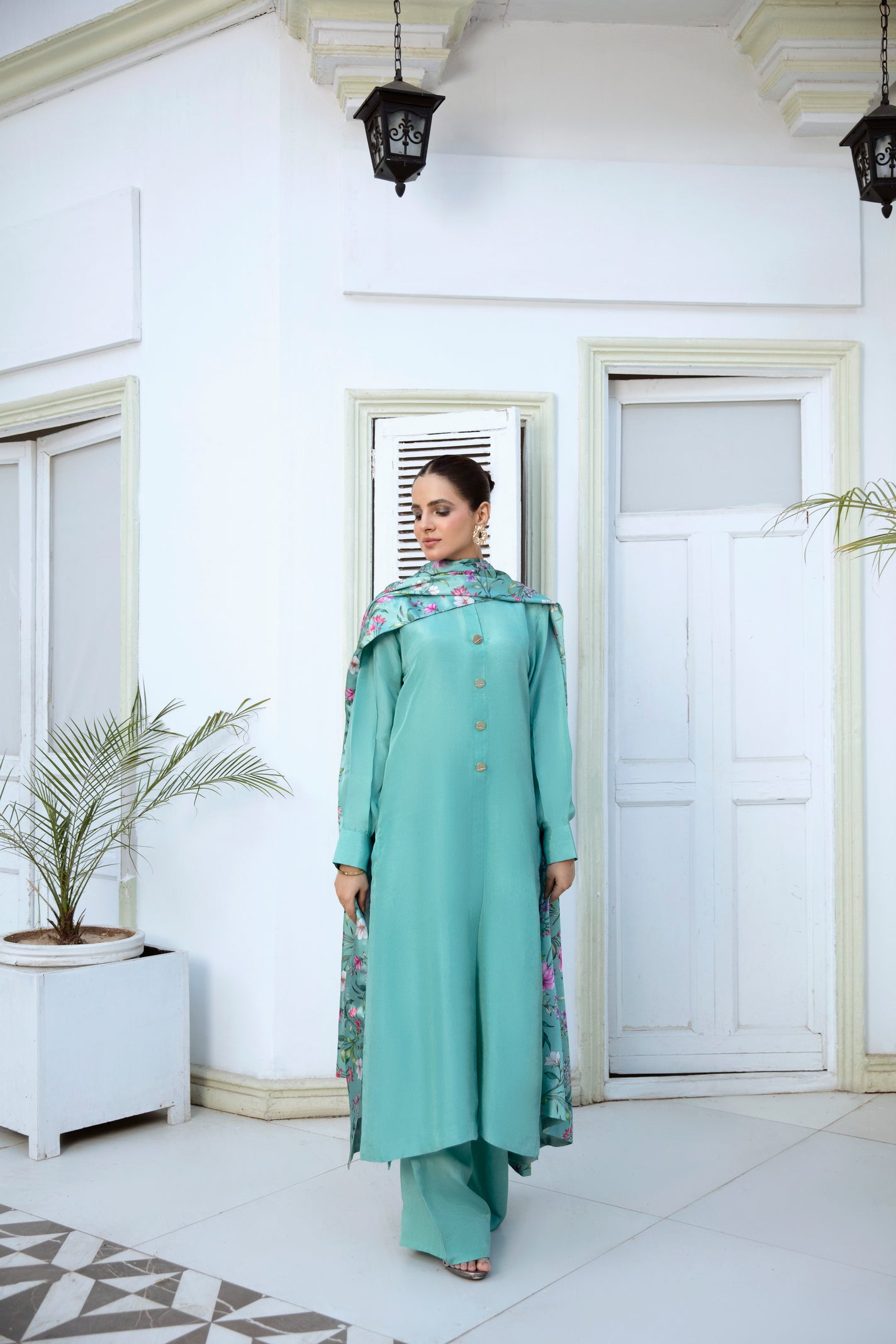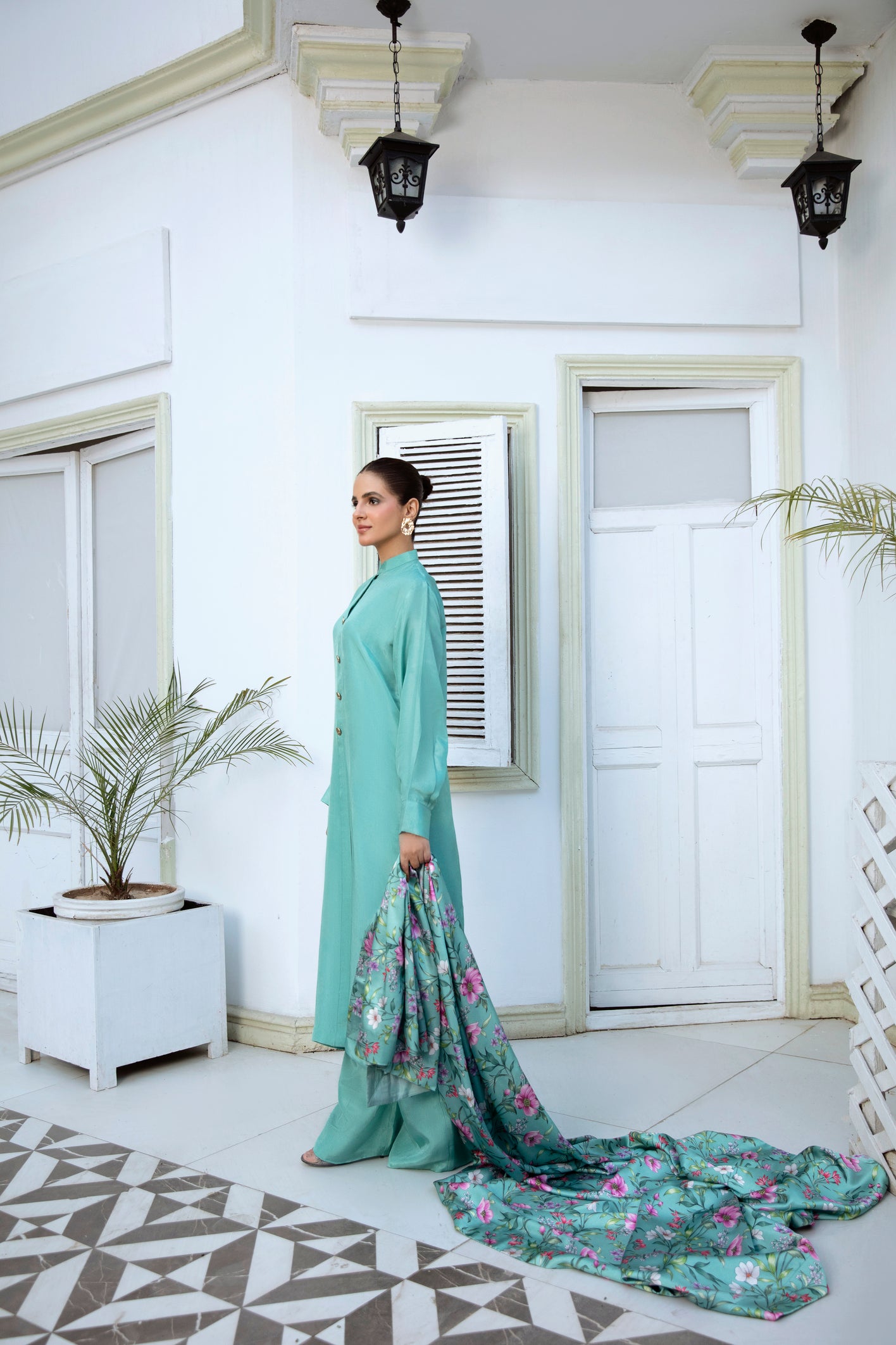 🌊 Aquamarine - Aqua 3-Piece Pure Silk Suit with Button-Down Shirt & Printed Dupatta | Elegant Everyday & Festive Wear