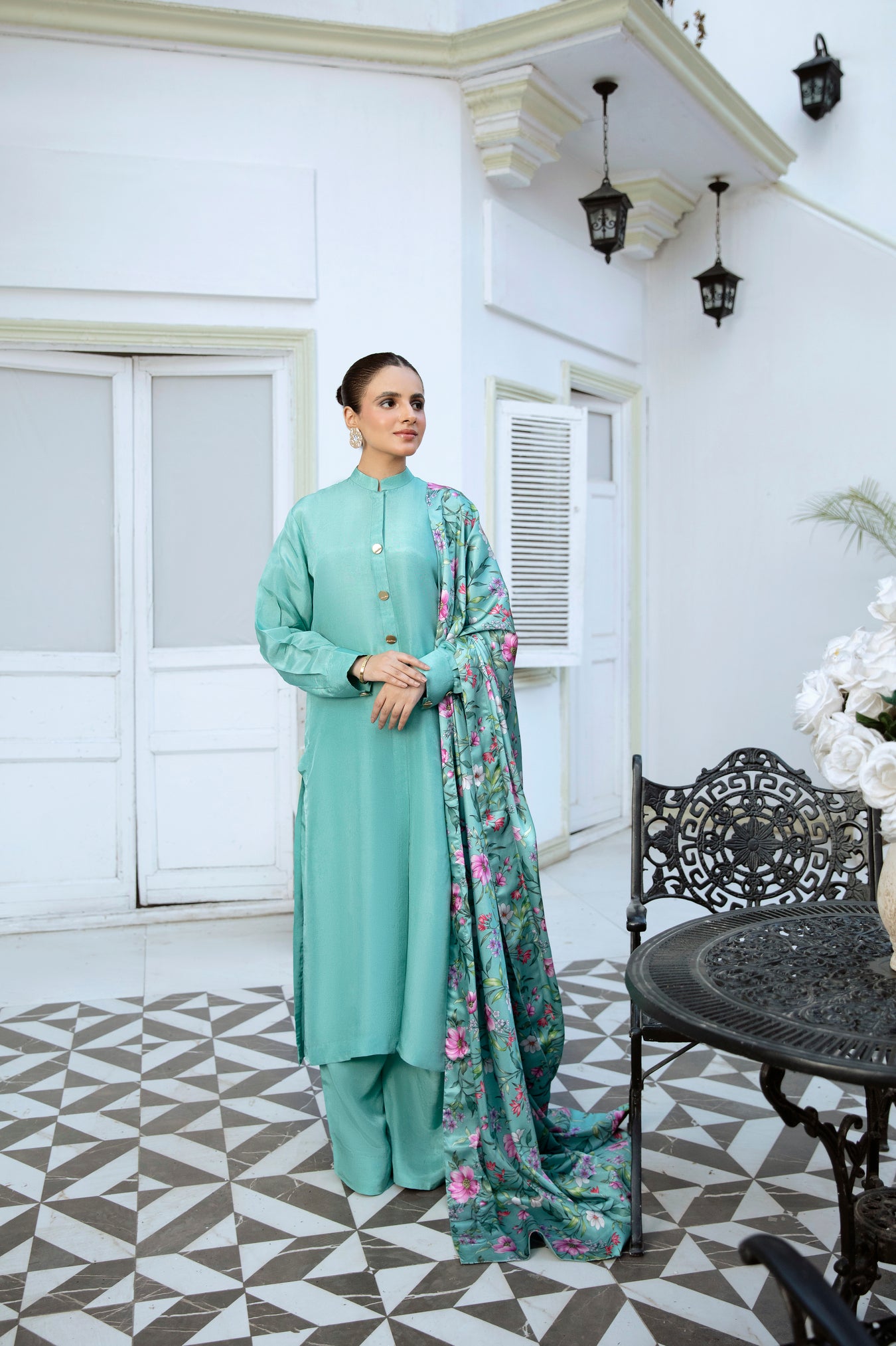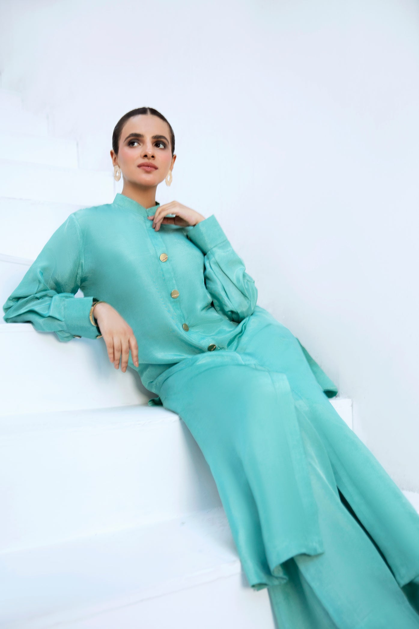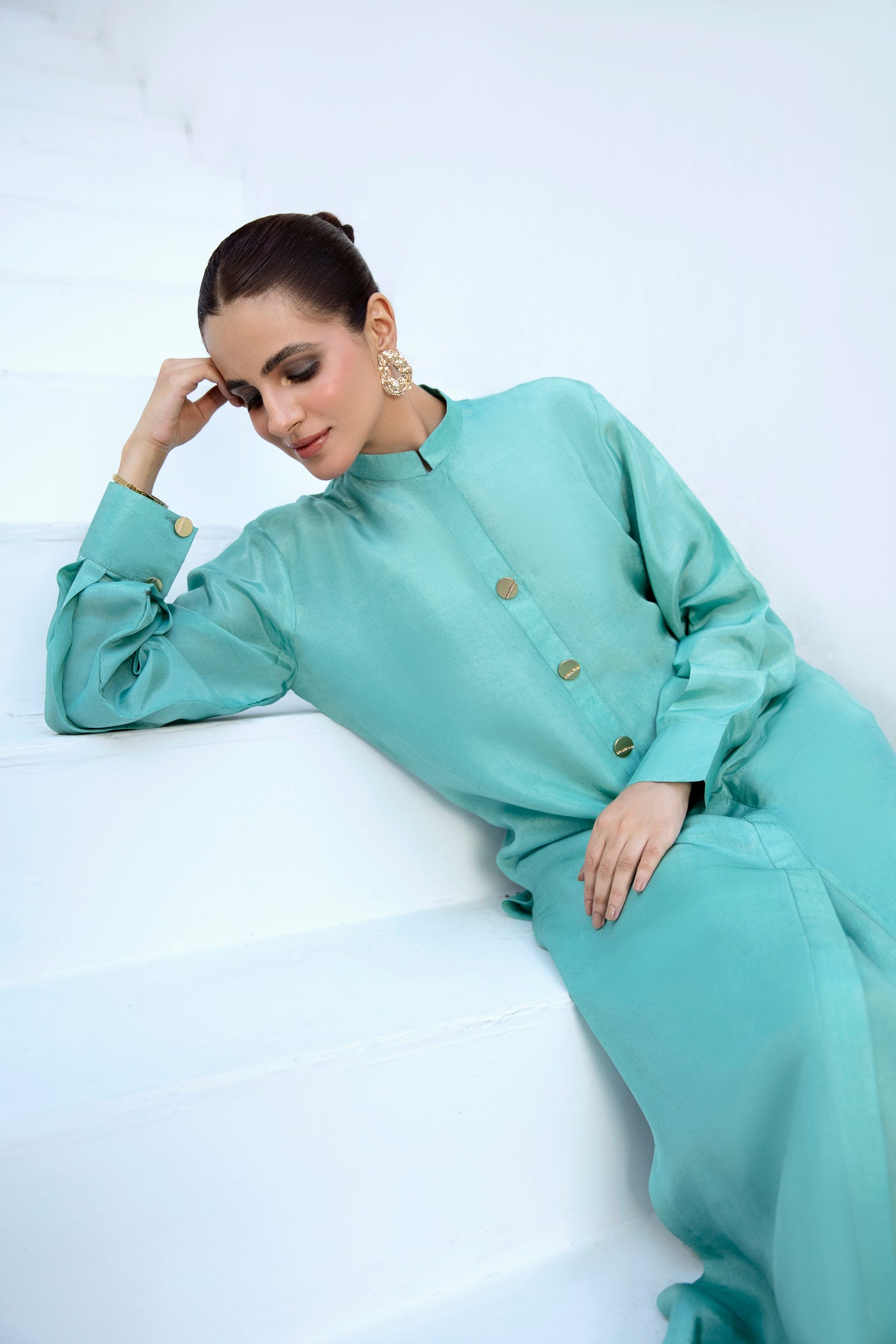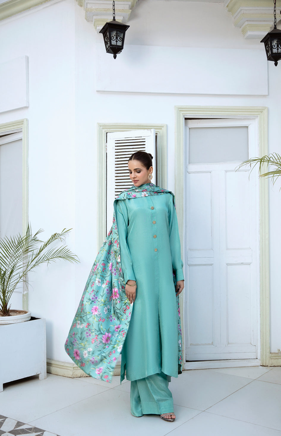 🌊 Aquamarine - Aqua 3-Piece Pure Silk Suit with Button-Down Shirt & Printed Dupatta | Elegant Everyday & Festive Wear