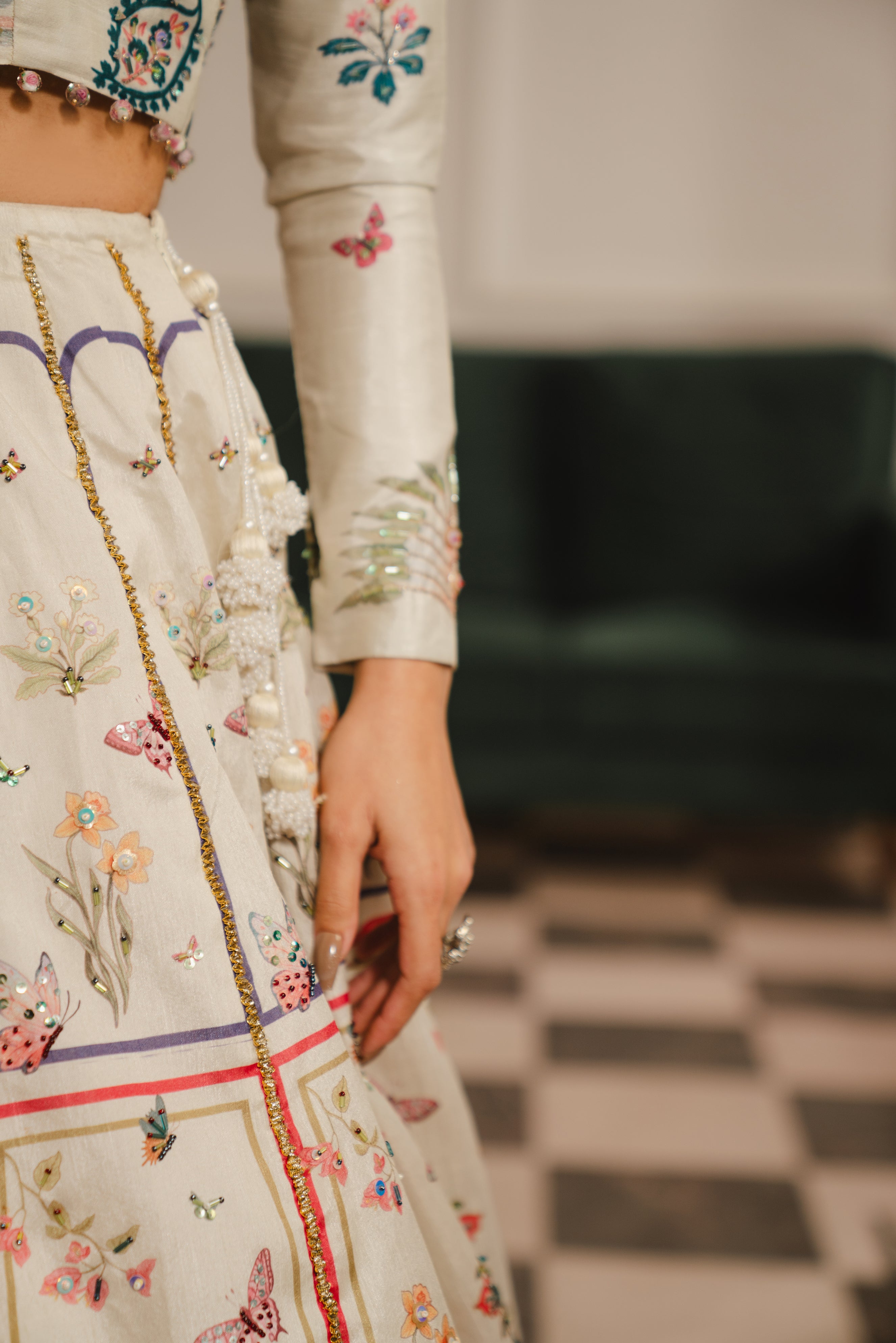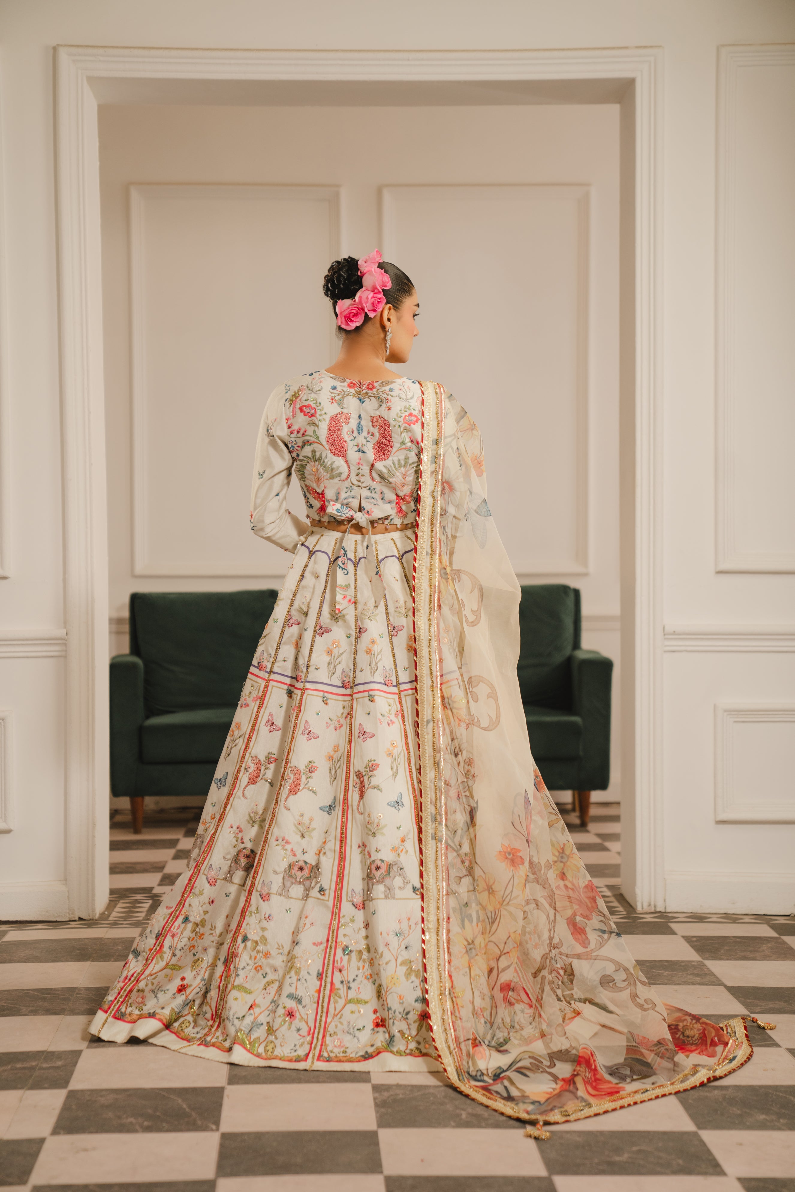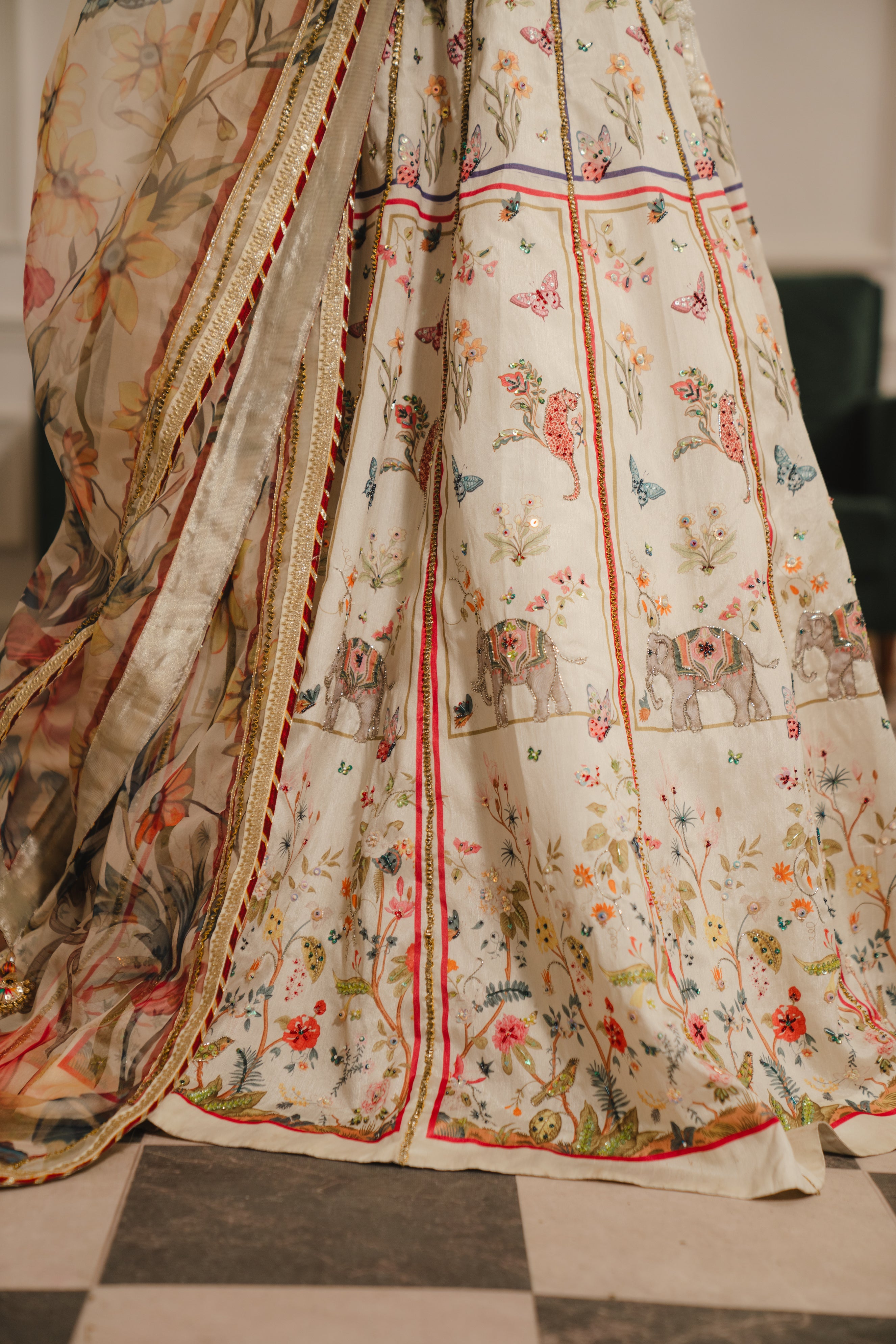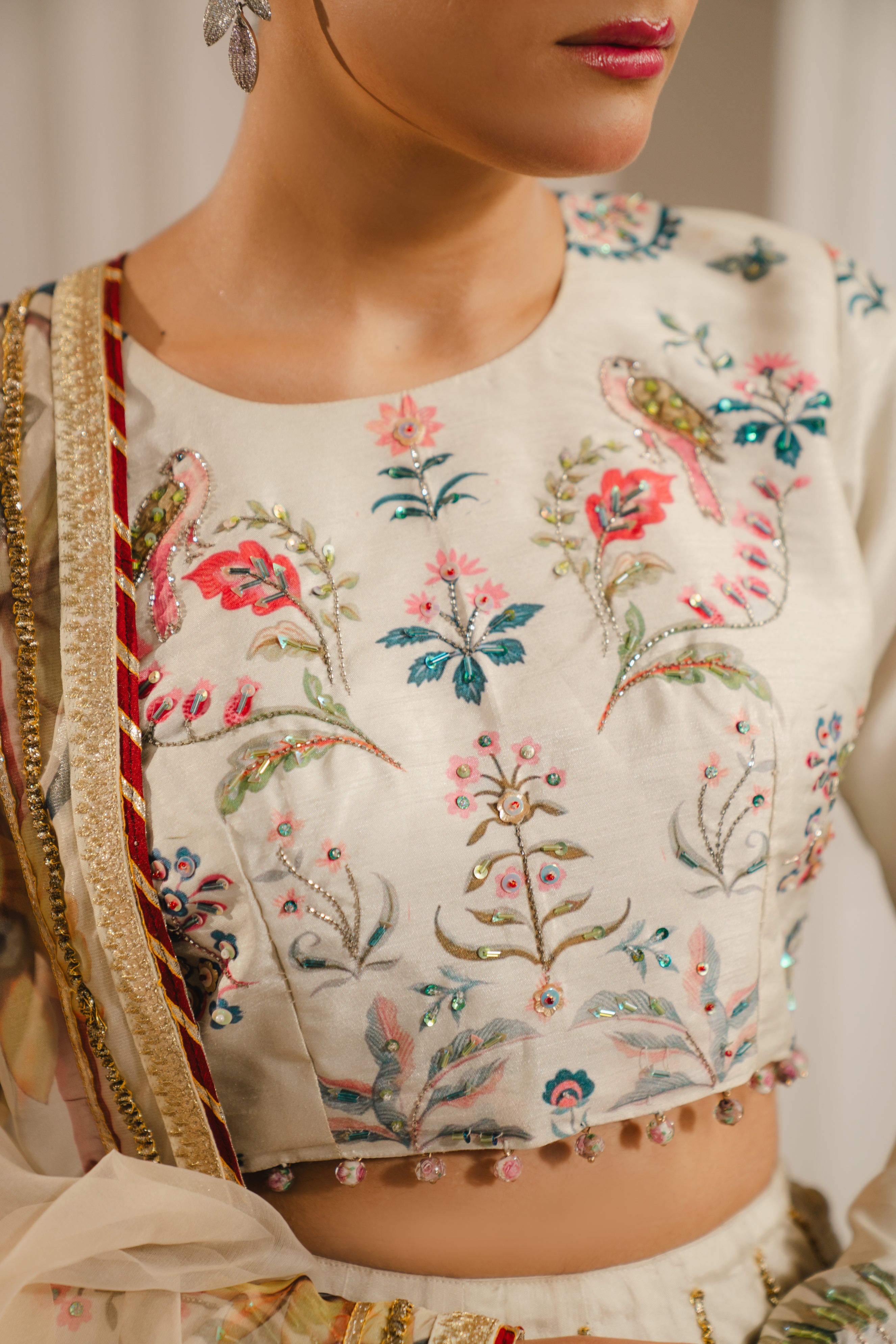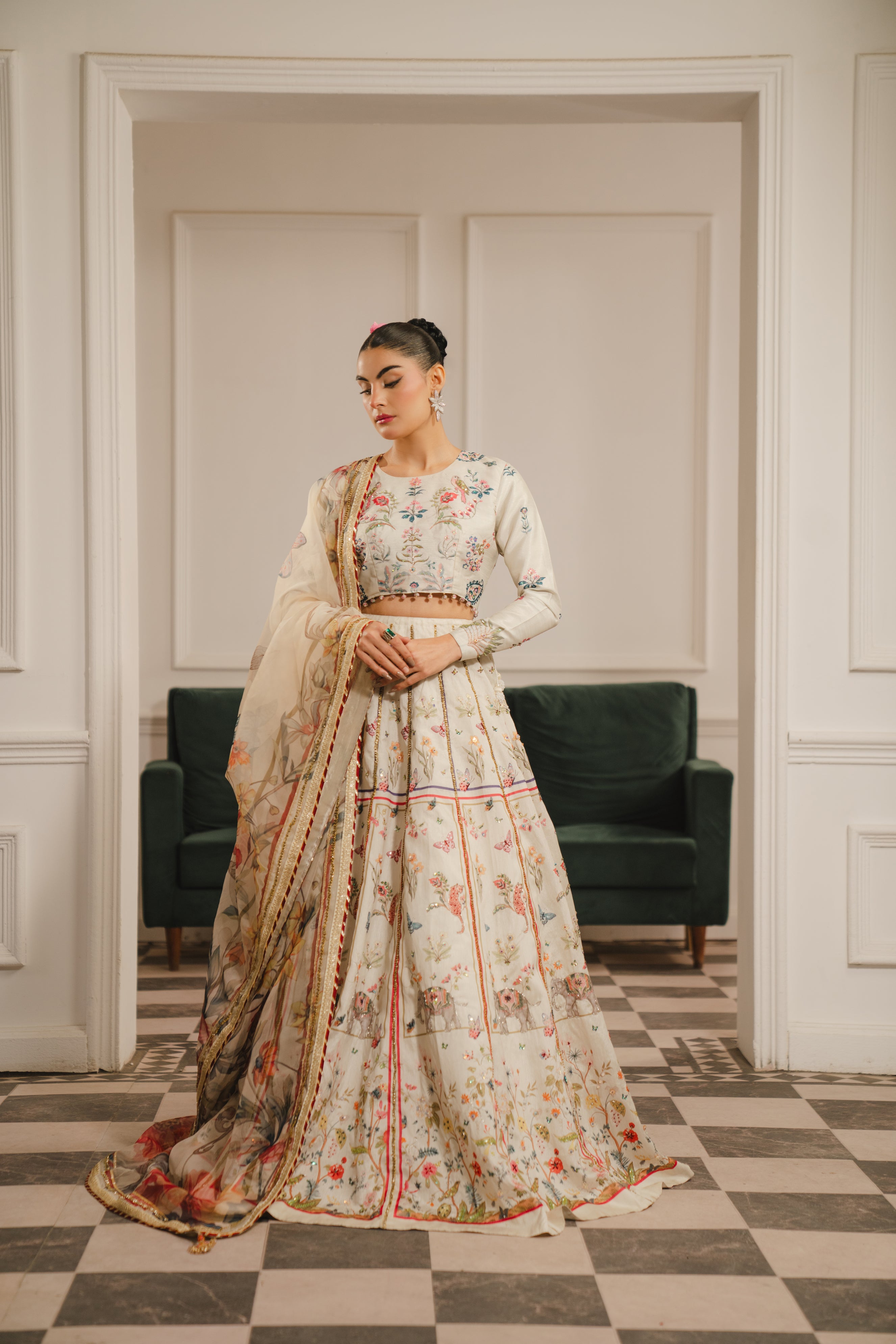 A romantic three-piece lehenga set that feels like walking through a spring garden. The ivory lehenga skirt is covered in delicate all-over floral printing, with red geometric borders along the hem that ground the softness with structure. The cropped blouse features intricate hand-embroidery concentrated at the neckline and cuffs, showing off just the right amount of midriff. The grey-green dupatta is heavily embroidered with trailing floral motifs that seem to cascade down like blooming vines—drape it over your shoulder and let it pool at your feet for maximum romance.