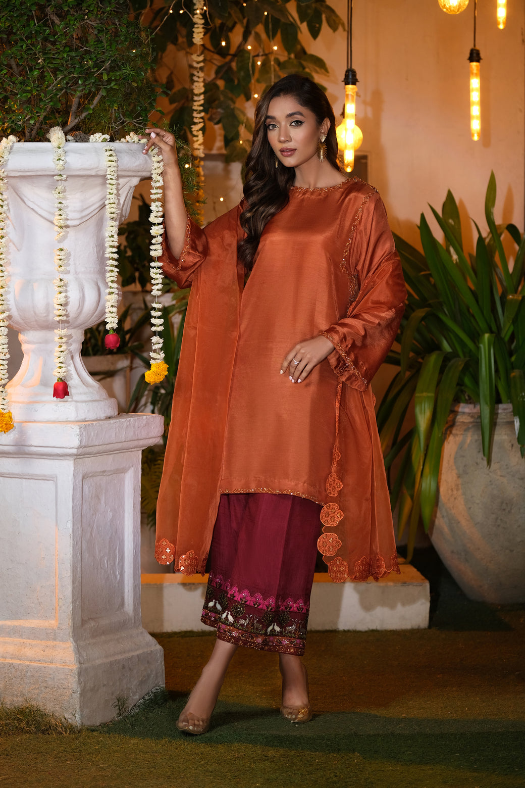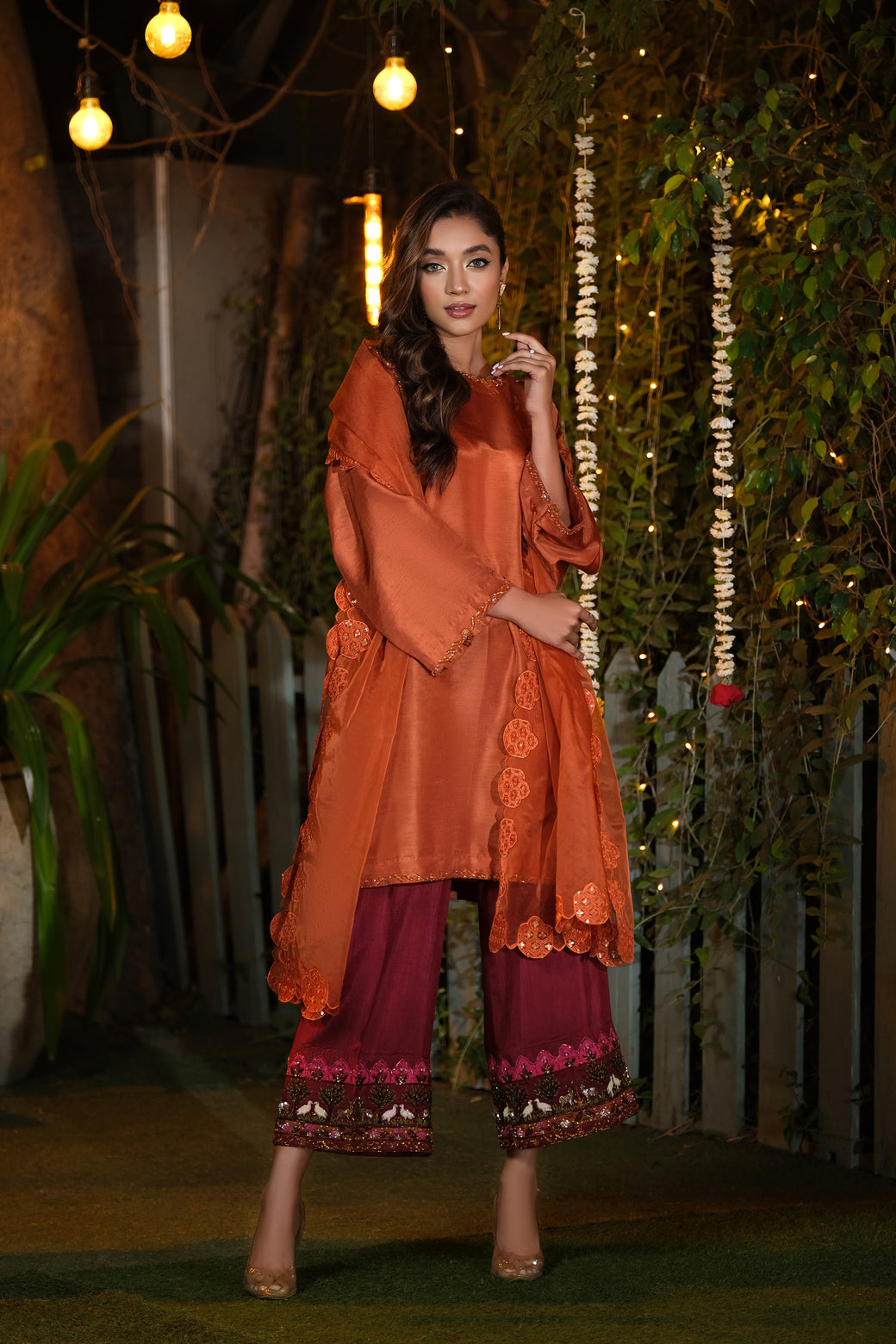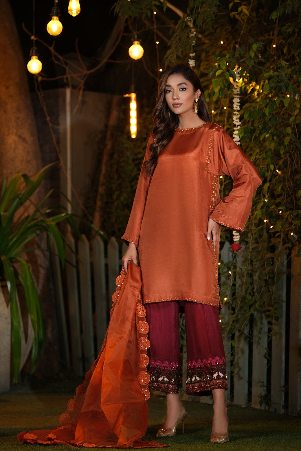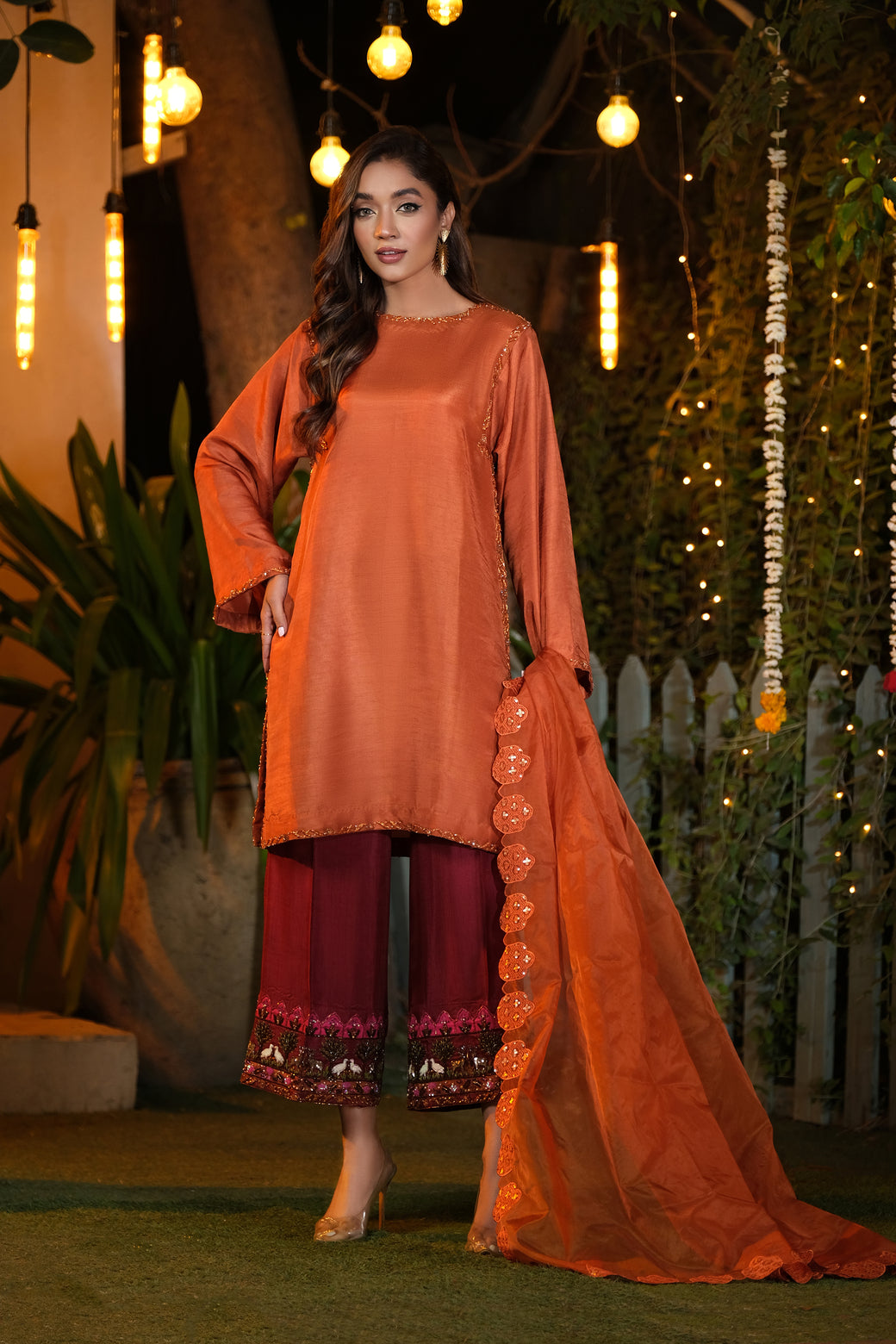 Sheer Dupatta: A lightweight, sheer dupatta with a four-sided embroidered border adds graceful movement and depth, completing this refined look with a whisper of delicacy.