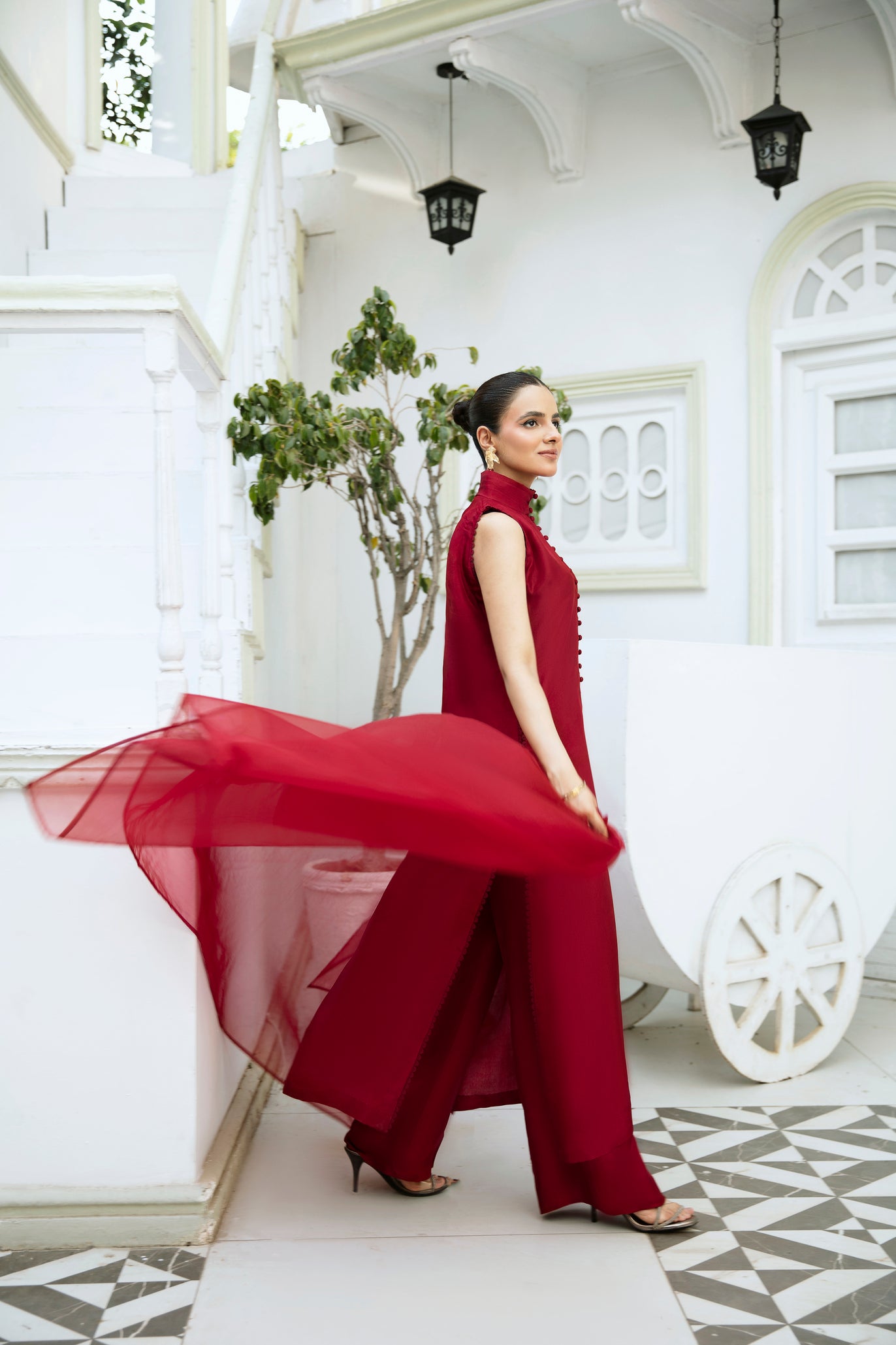 Step into timeless elegance with Crimson — a sophisticated maroon three-piece suit set crafted from luxurious pure tussle silk. Designed for the modern woman who values grace and refinement, this ensemble blends classic detailing with a contemporary silhouette.