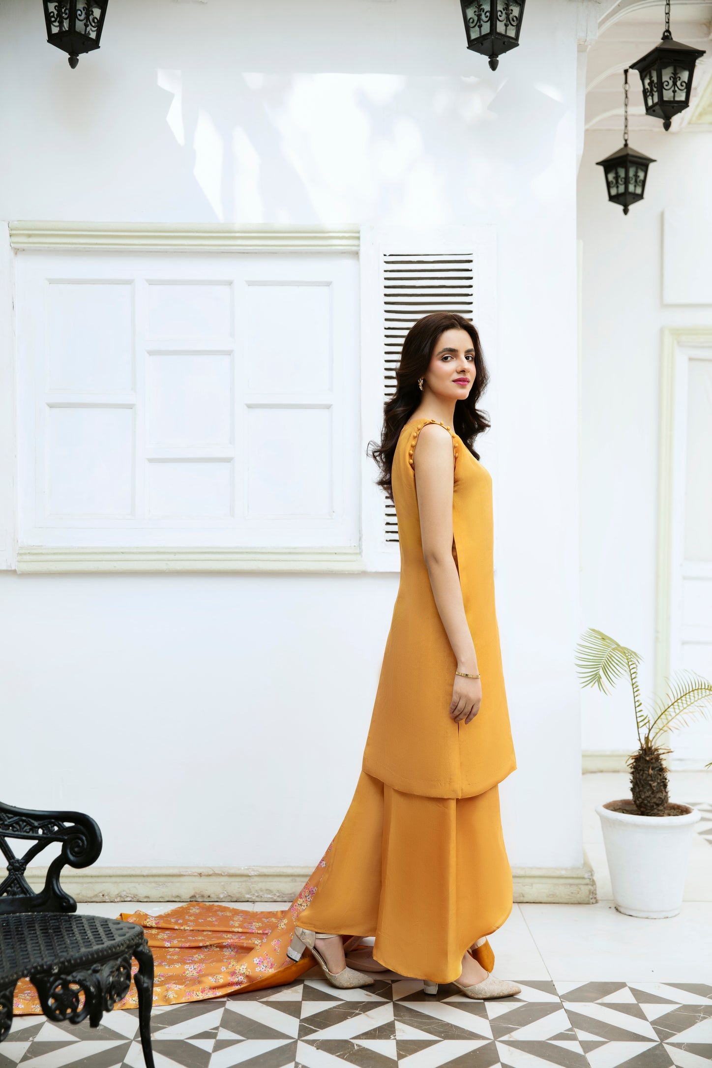Make a bold yet refined statement with Goldenrod, a mustard-hued three-piece suit that blends contemporary charm with traditional elegance. Crafted from premium pure tussle silk, this outfit is designed to stand out at every special occasion.