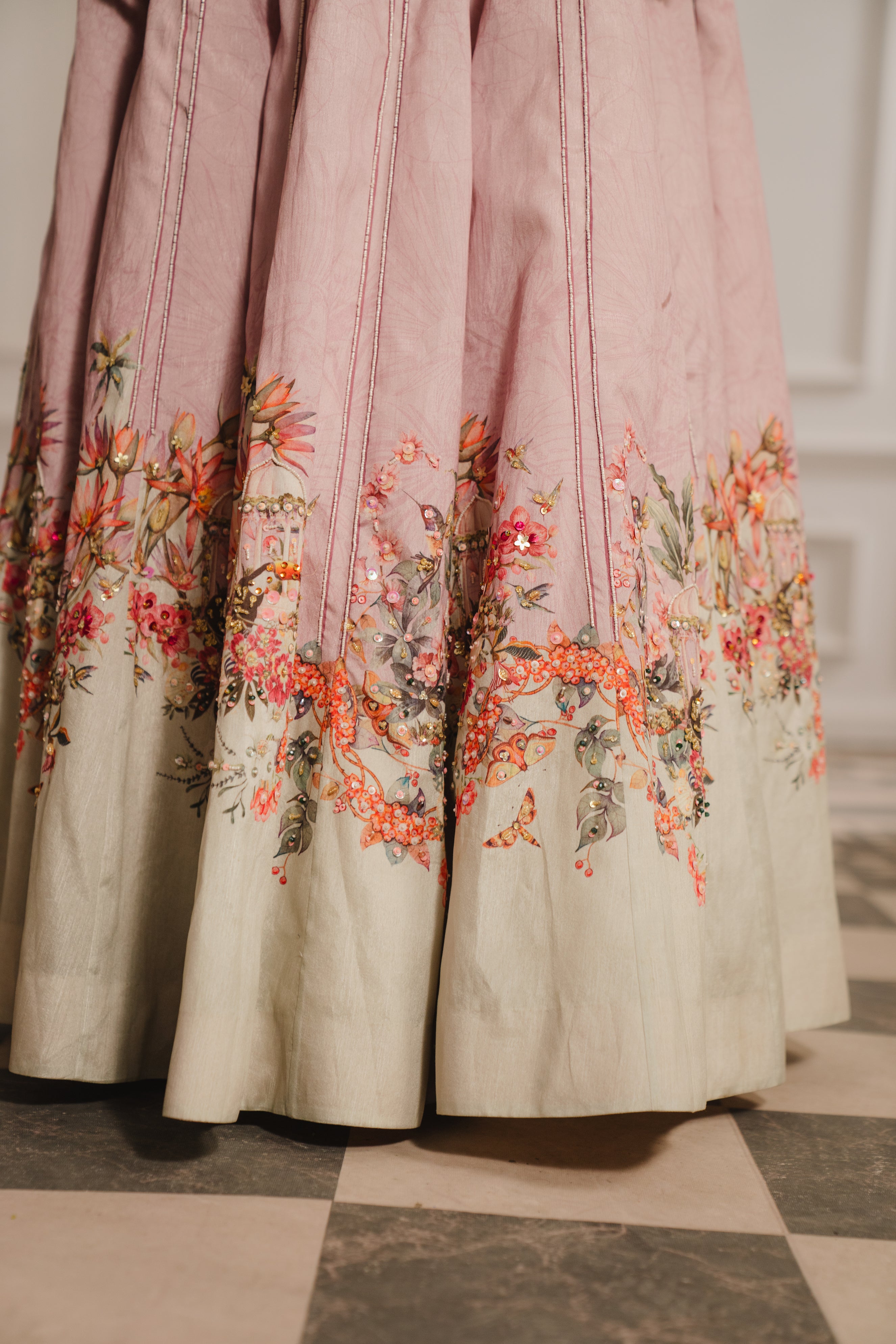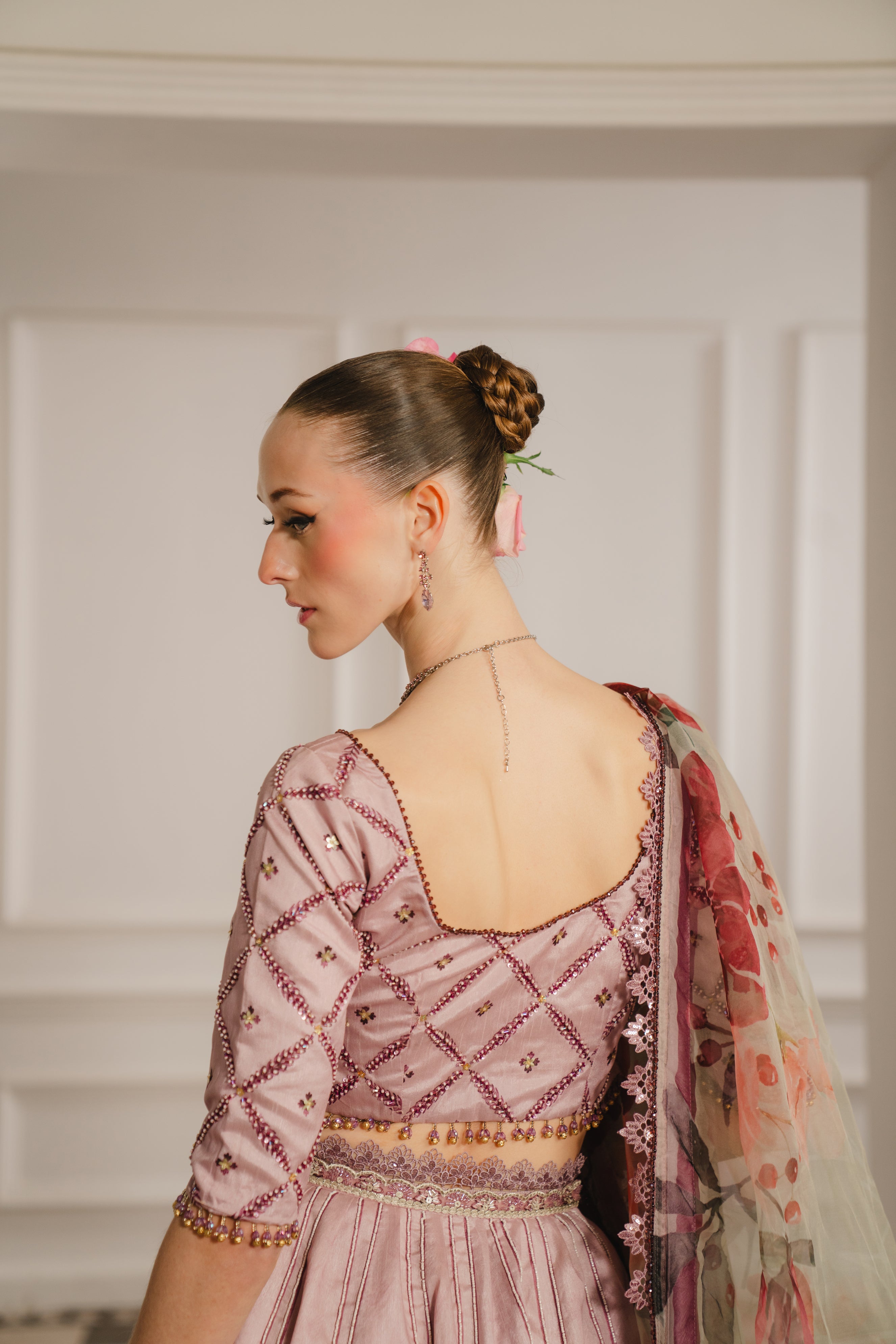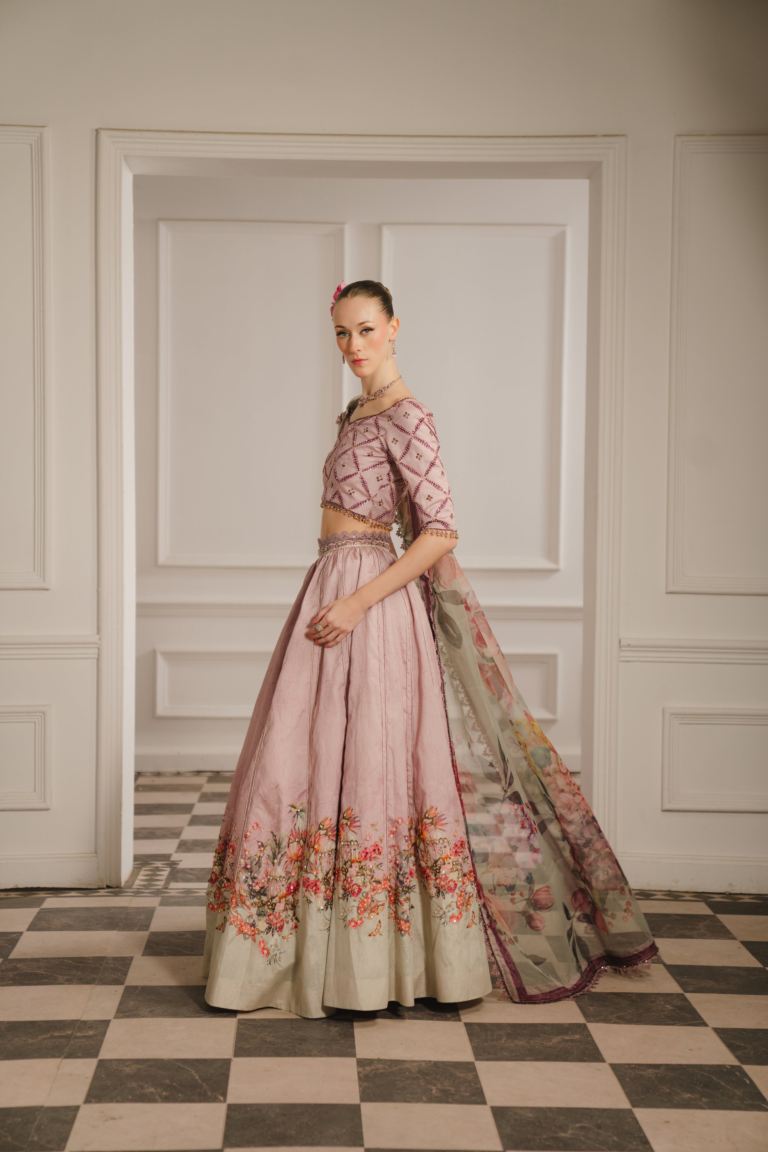 A dreamy lehenga choli in soft dusty rose that beautifully balances geometric precision with flowing florals. The choli features diamond-pattern embroidery created with mirrors and thread, creating a lattice of sparkle across the bodice. The lehenga skirt starts in dusty rose and gradually fades into a grey-mauve ombré at the hem, where trailing floral embroidery winds its way around the bottom edge. The printed dupatta ties everything together with soft pinks and greens in a delicate botanical print—creating a cohesive, Instagram-worthy color story.