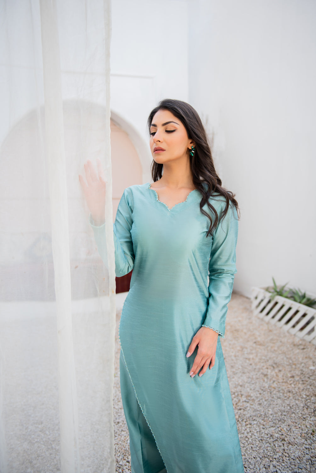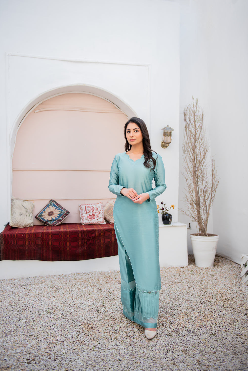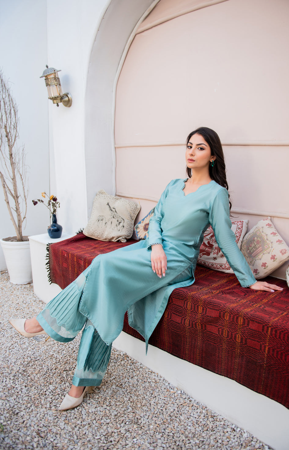• Shirt: Icy Blue & White Fabric with Side Slit Design