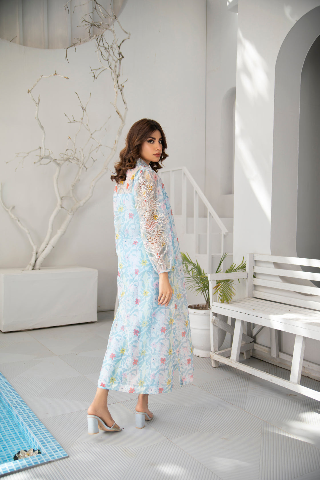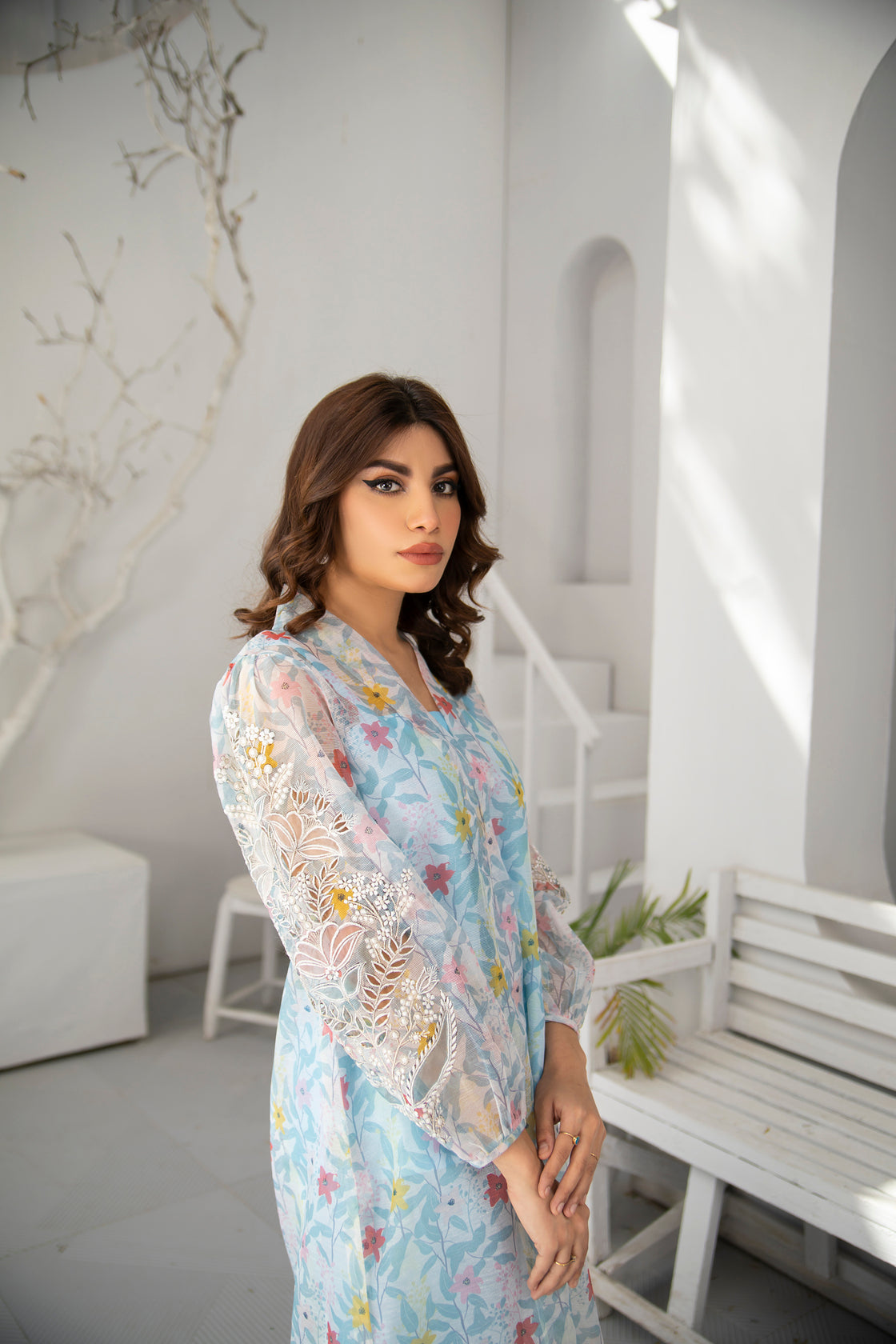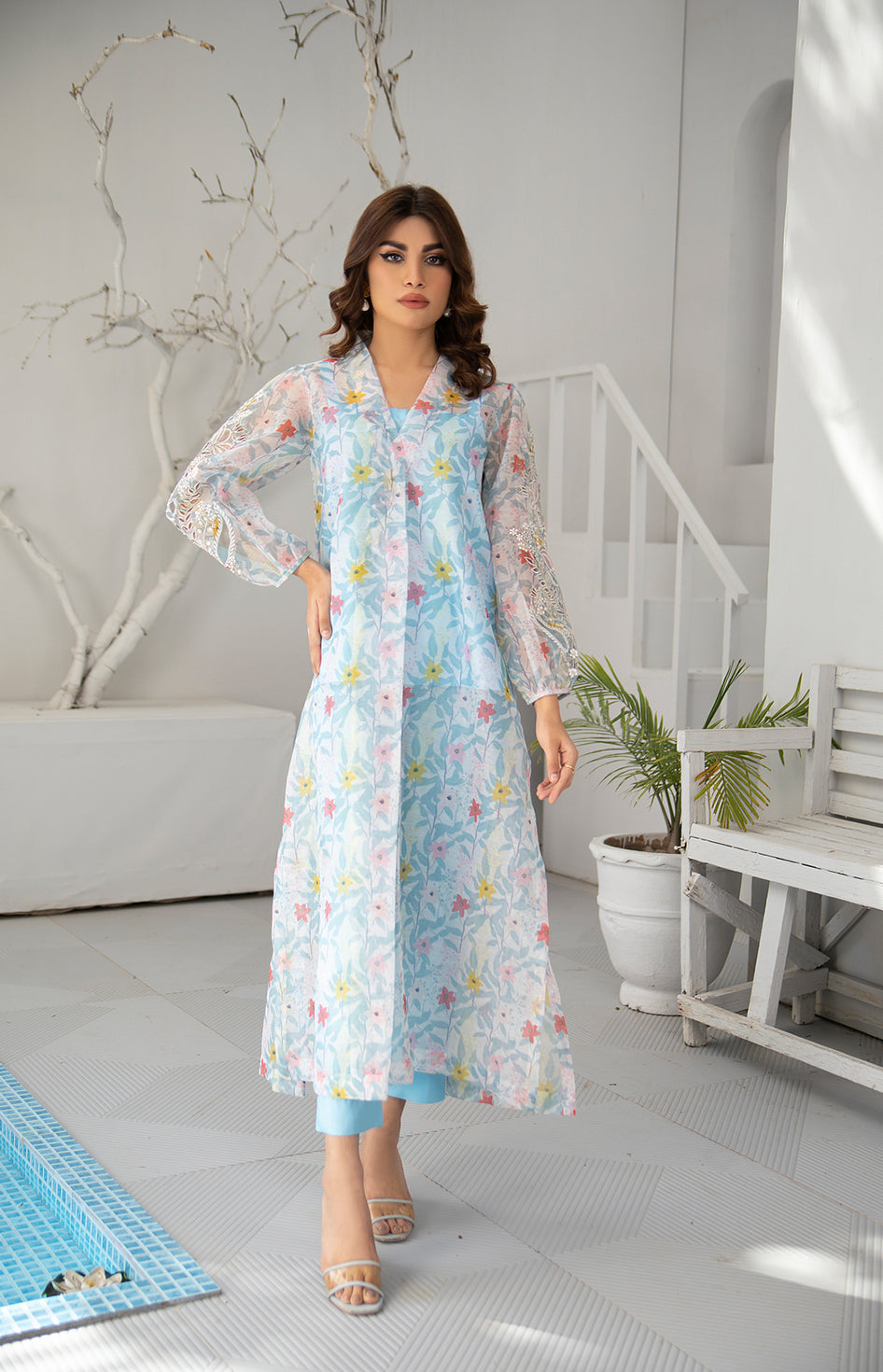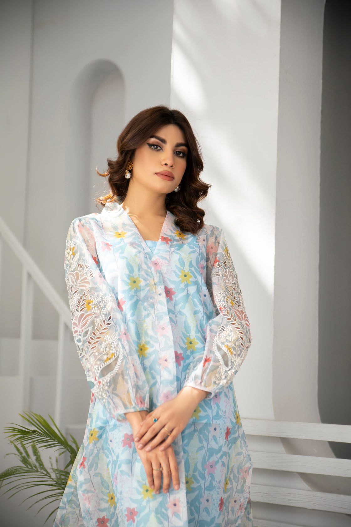 Lilly is a graceful three-piece ensemble inspired by the delicate charm of the lily flower. Crafted in a refreshing blue and white cotton net, the shirt features meticulously placed digital floral prints that radiate femininity and softness. Intricate cutwork embroidery adorns the sleeves, adding a layer of sophistication and fine craftsmanship. Paired with tailored trousers for a flattering silhouette, Lilly is the ideal choice for special occasions where timeless elegance and modern detail come together effortlessly.