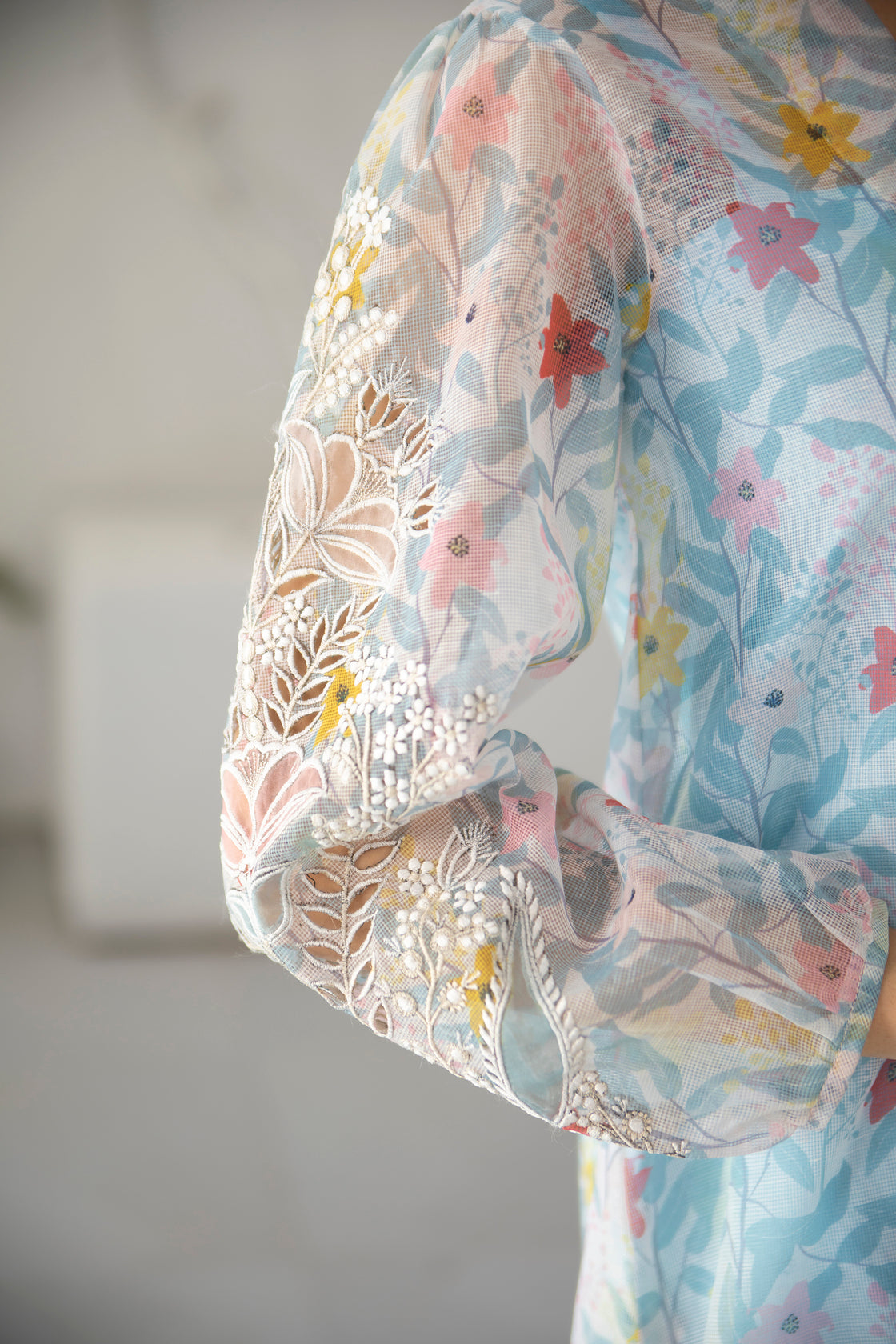 • Shirt: Cotton Net with Digital Floral Print & Cutwork Embroidery