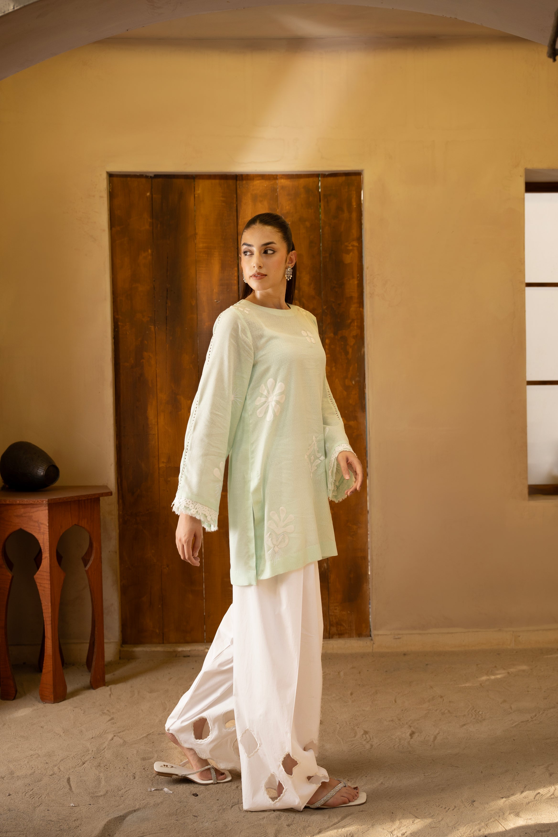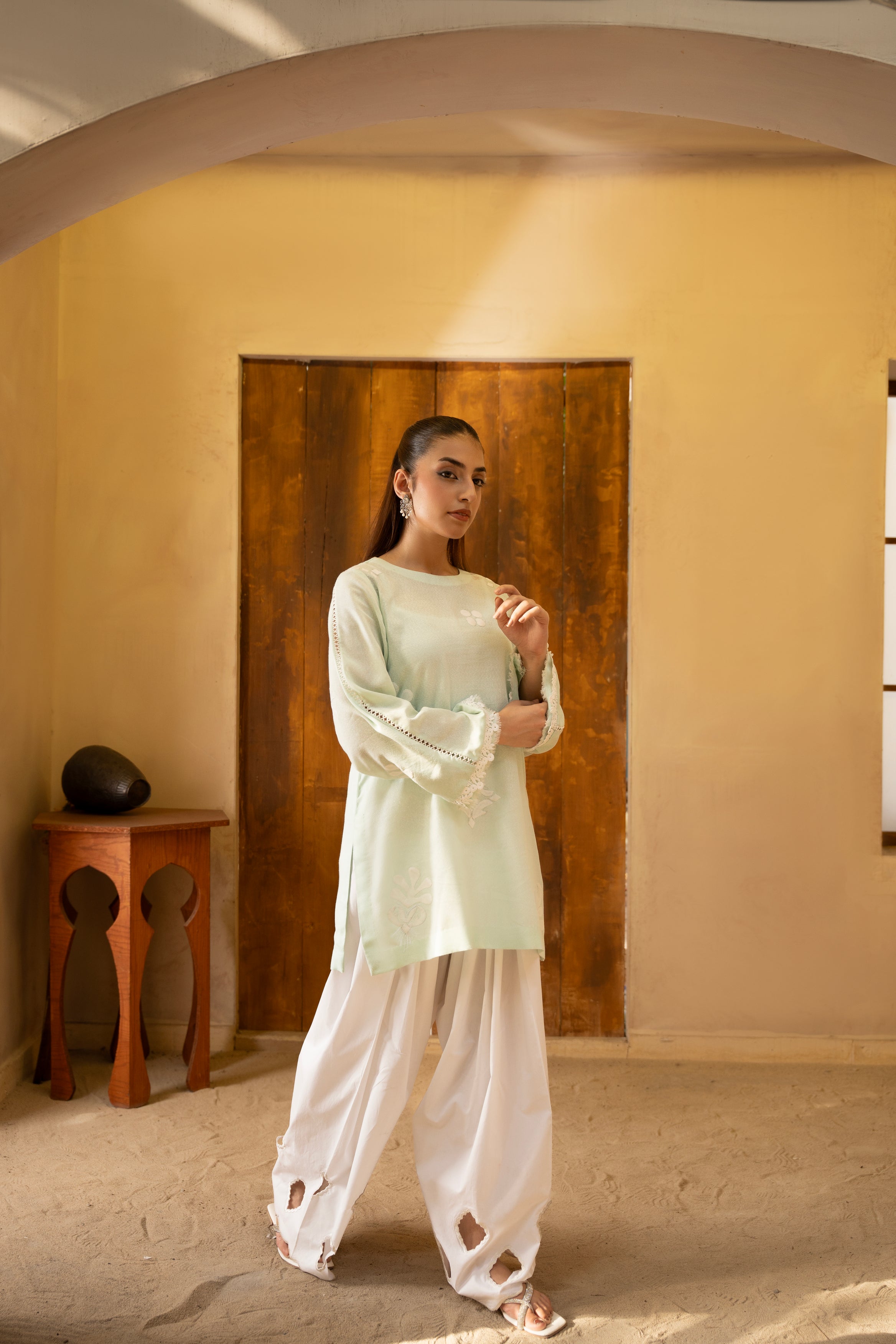 Paired with wide-leg white shalwar trousers for a breezy finish