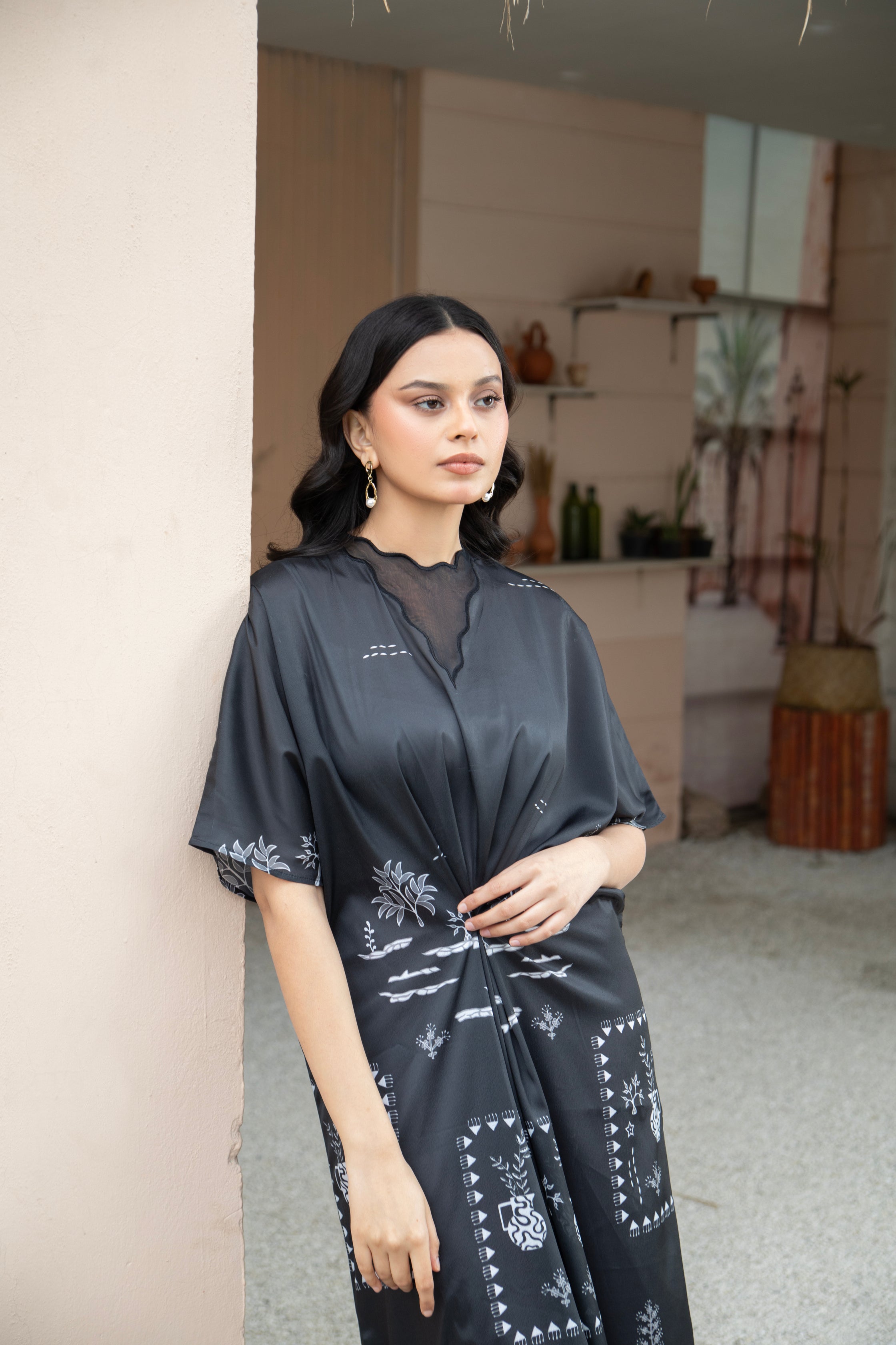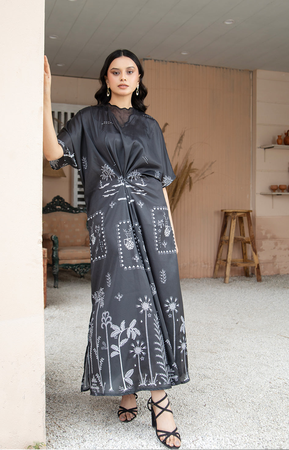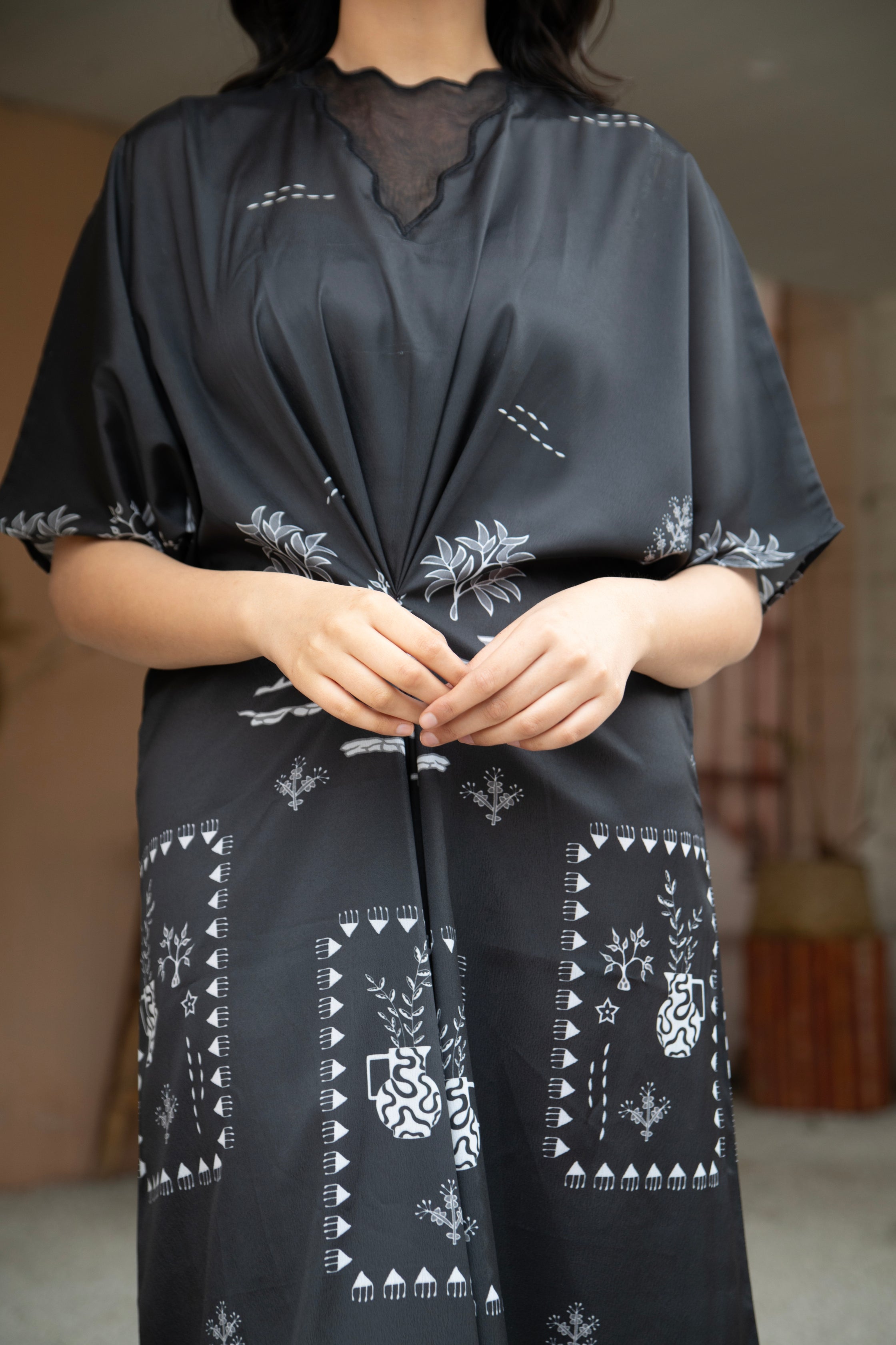 🔥 NOIR – Black Warli Art Digital Print Grip Kaftan