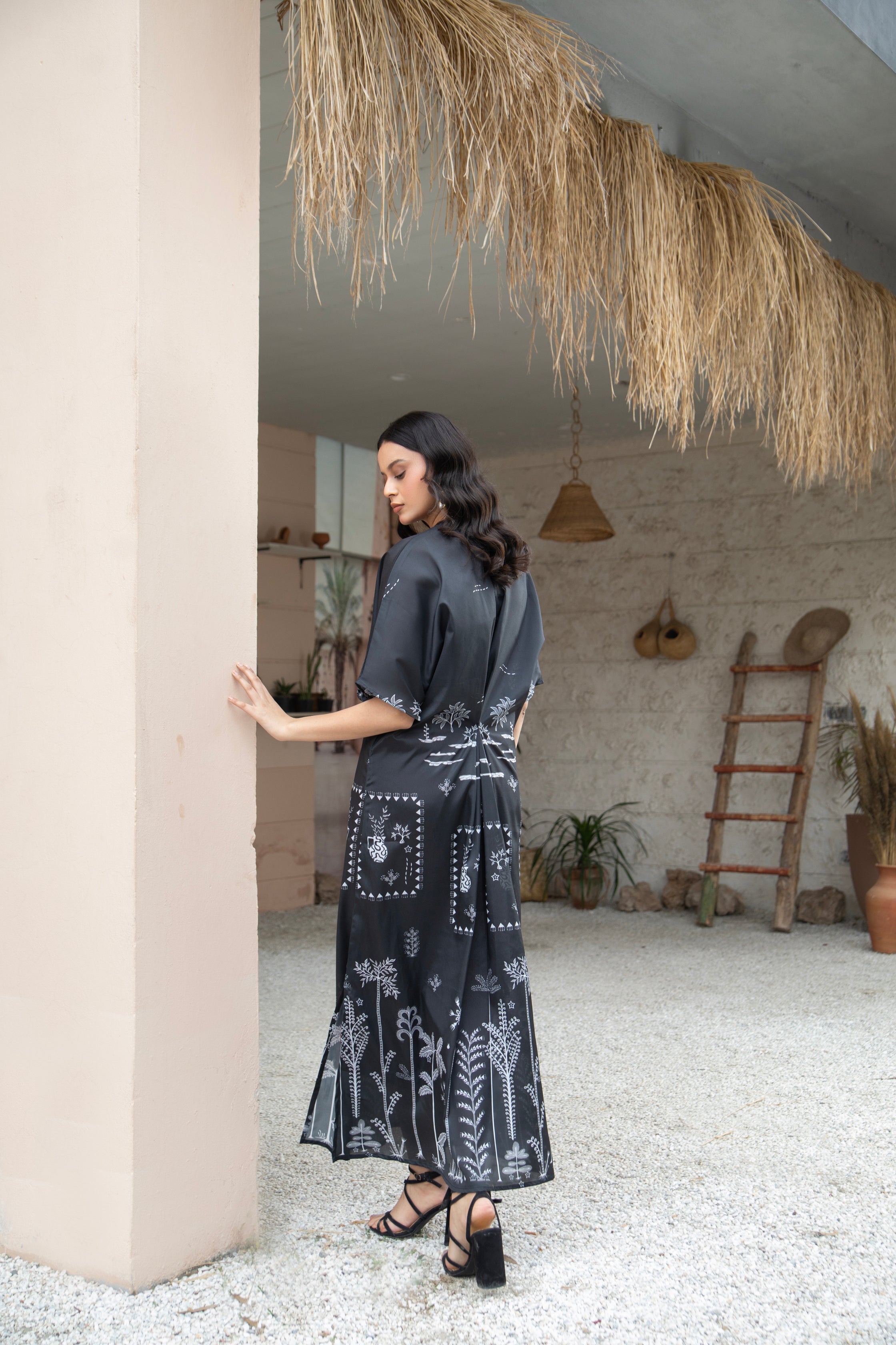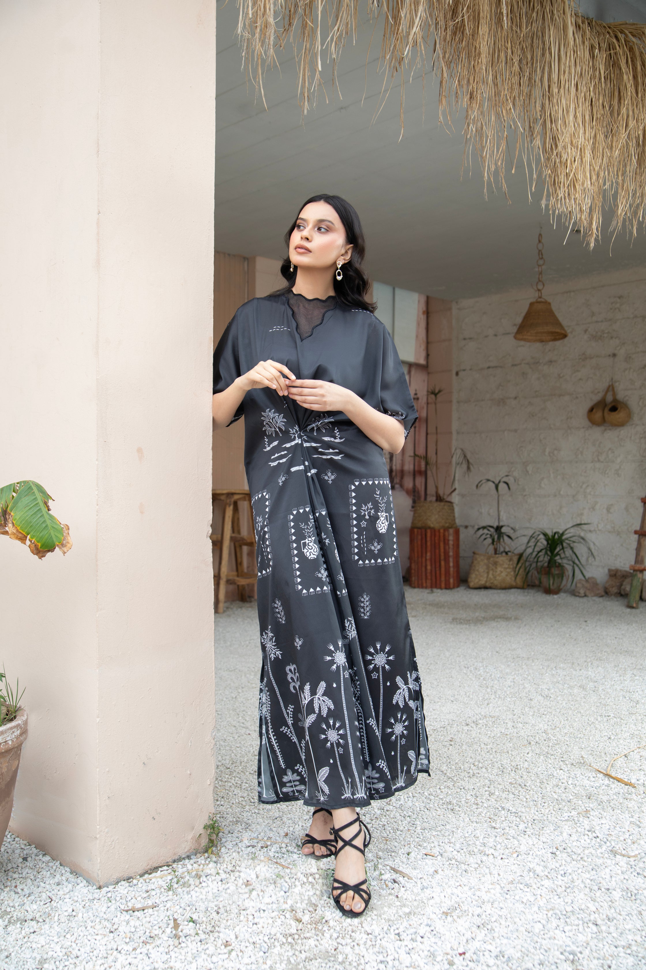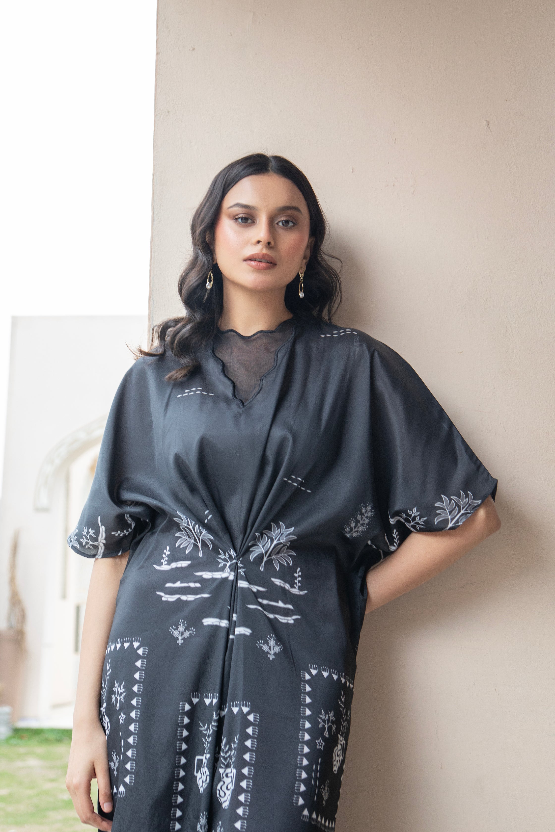 🔥 NOIR – Black Warli Art Digital Print Grip Kaftan