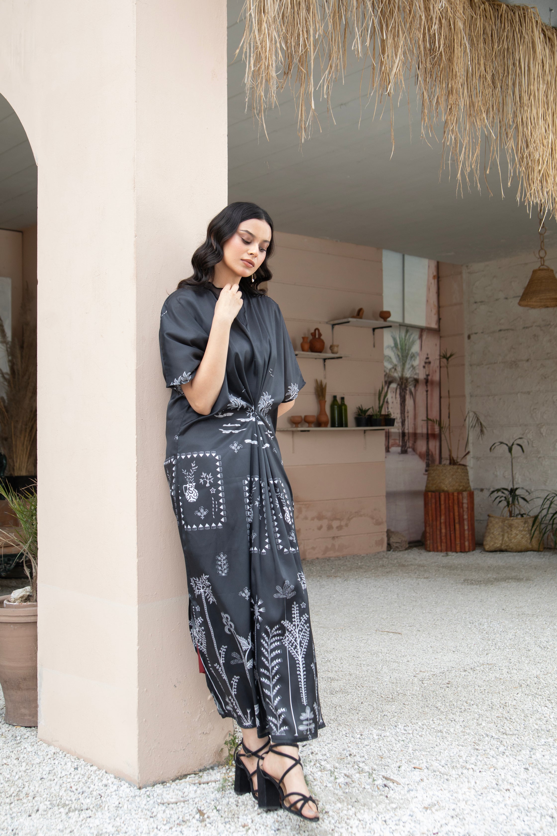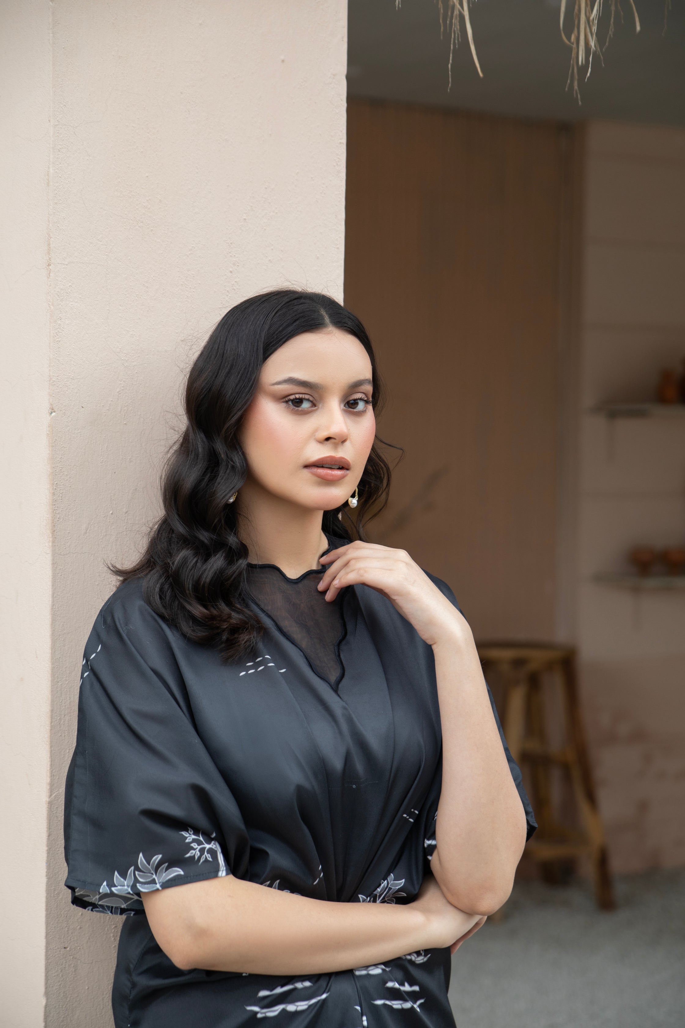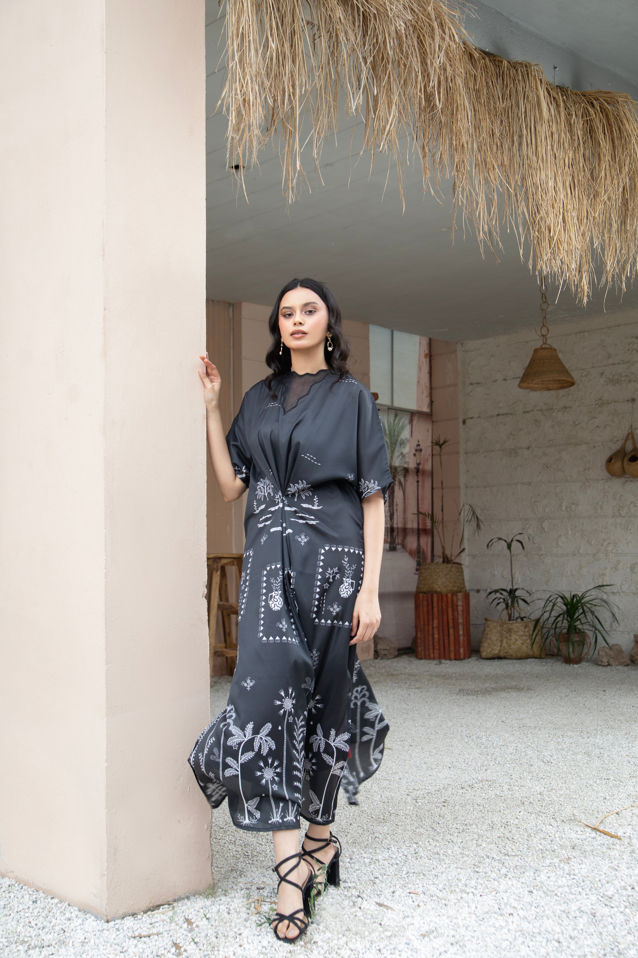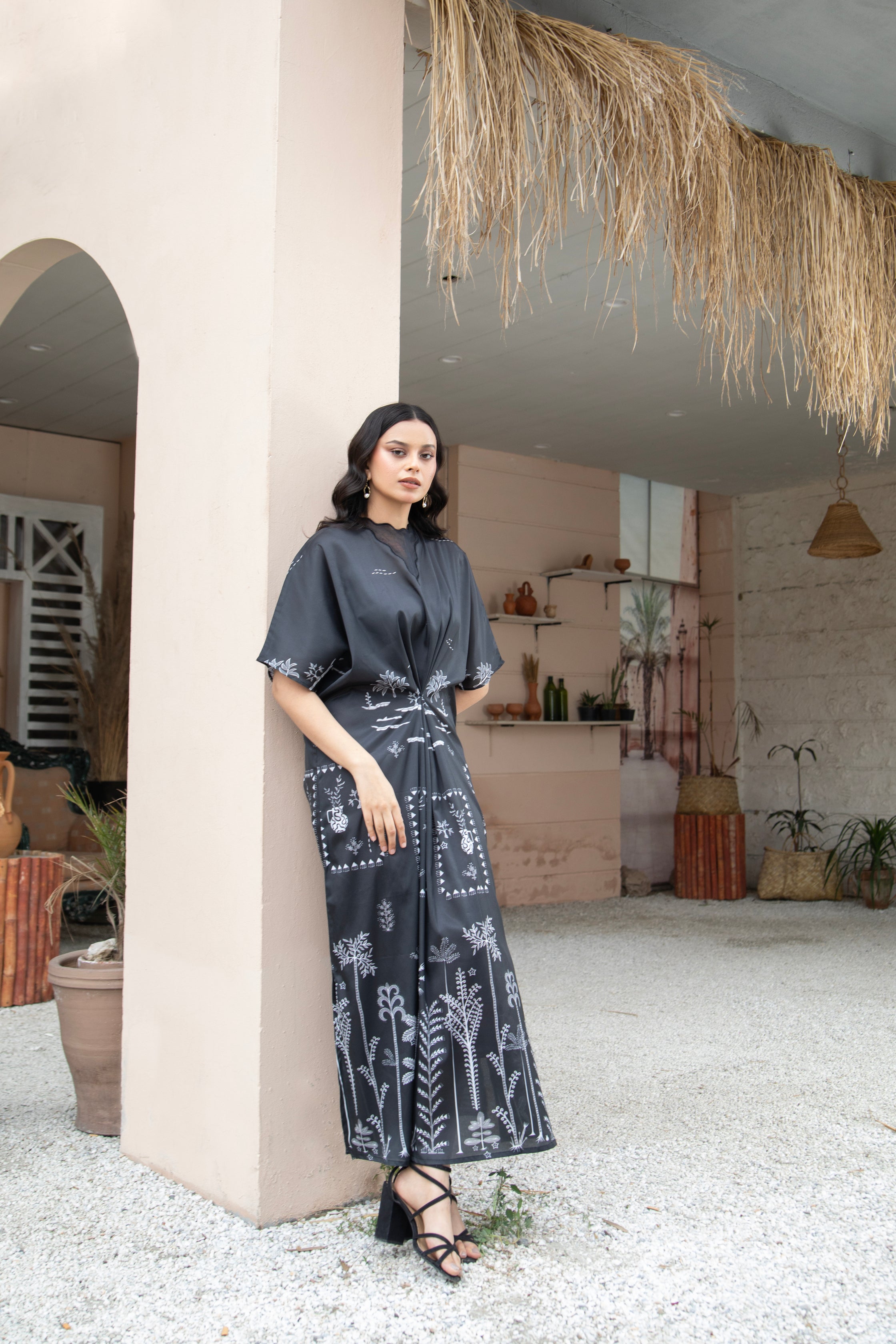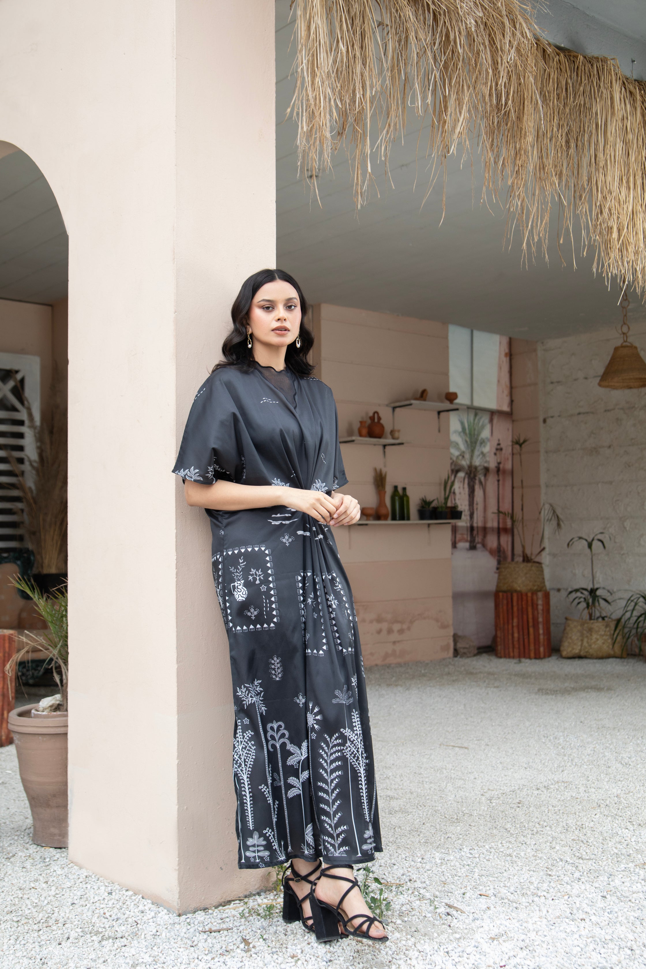 Step into timeless sophistication with NOIR, a stunning black kaftan crafted from luxurious grip fabric. Featuring a captivating digital print inspired by traditional Warli art, this piece beautifully merges cultural heritage with contemporary design. The result is an effortlessly elegant silhouette that balances simplicity, comfort, and artistic storytelling — making it a standout statement that transcends time and trends.
