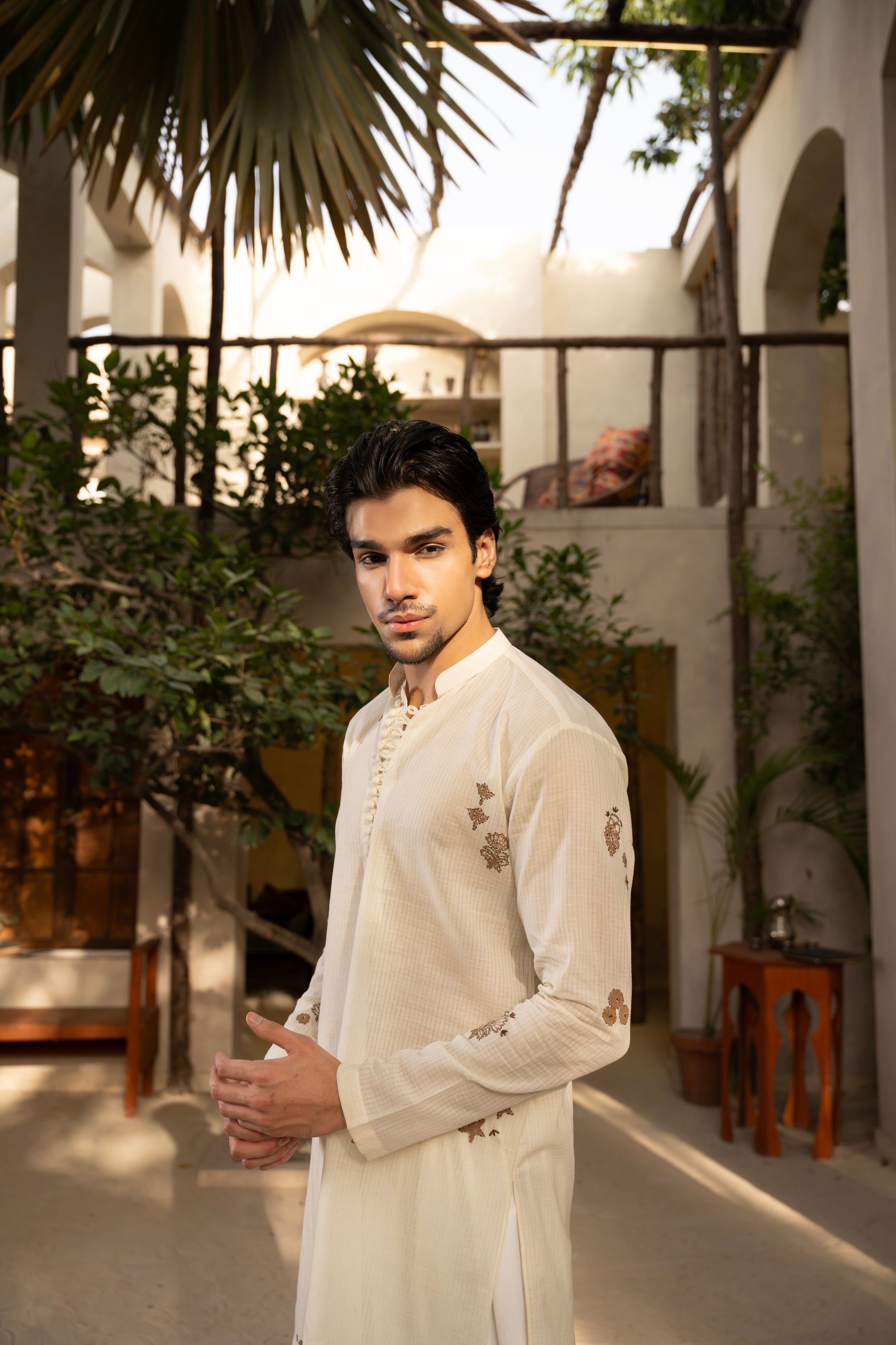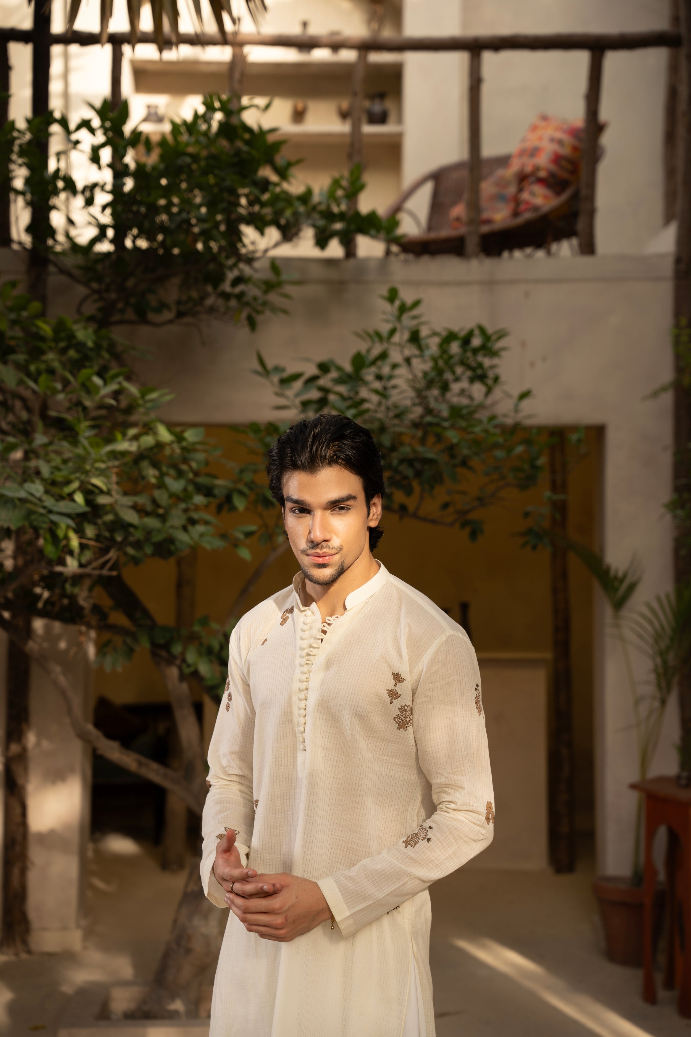 Pair with a crisp white shalwar or trousers, leather sandals, and a wristwatch for a clean, cultured look.