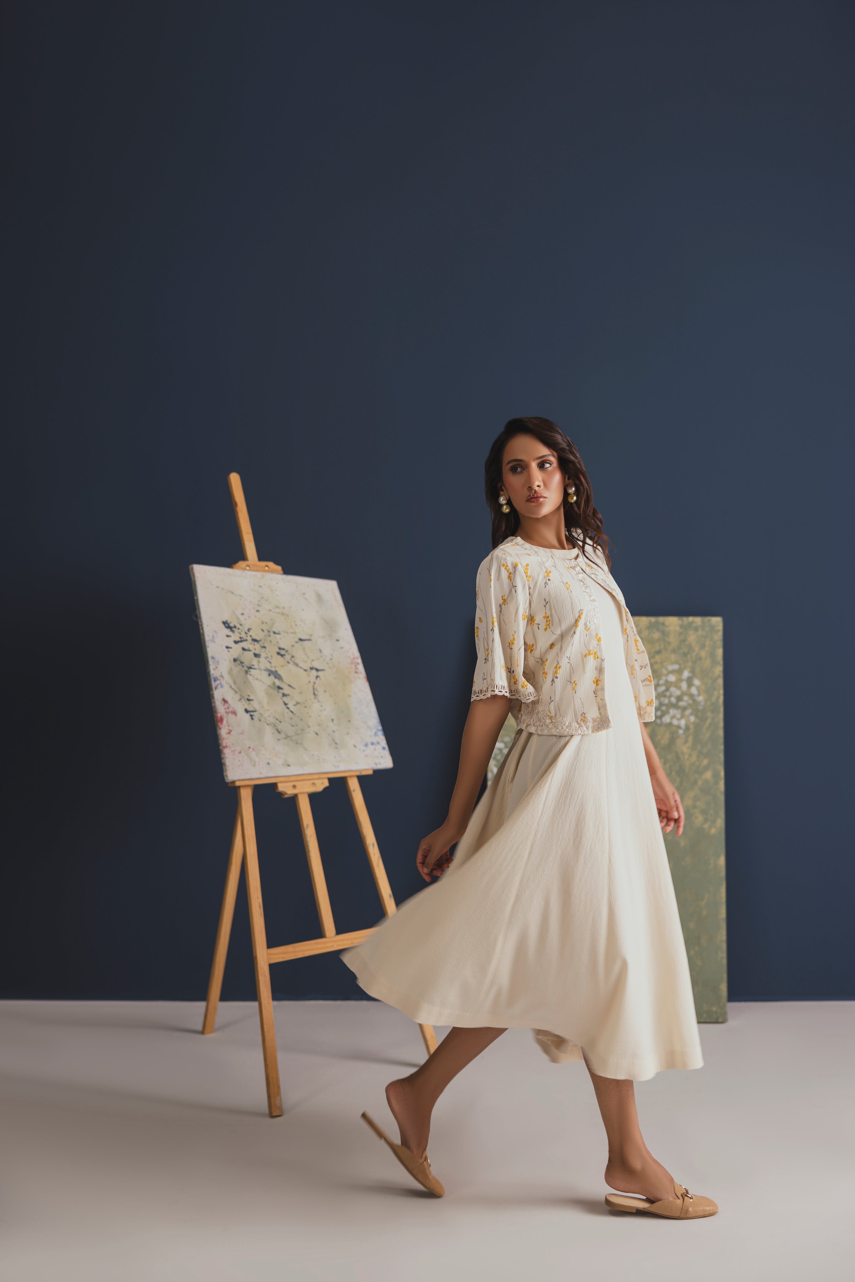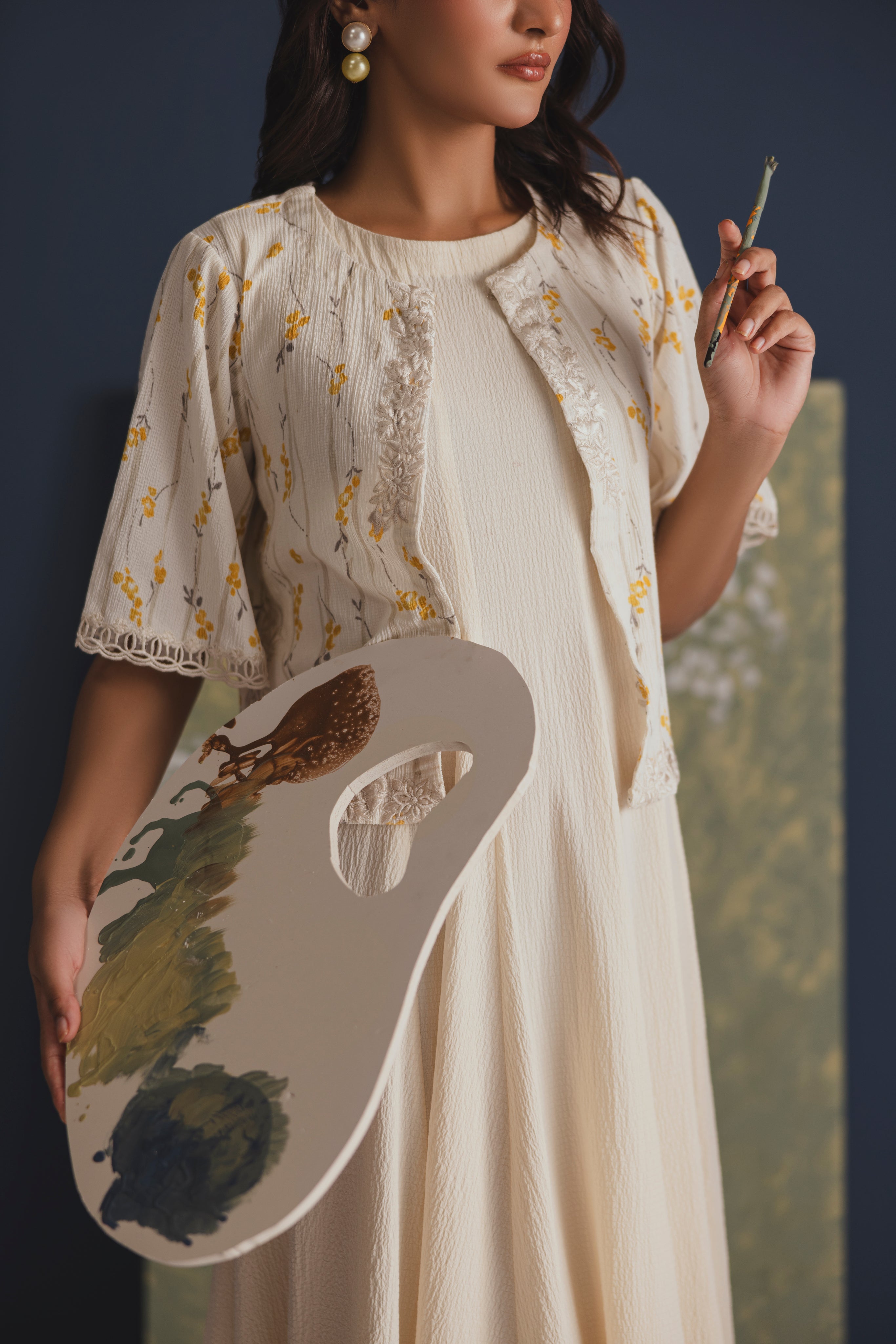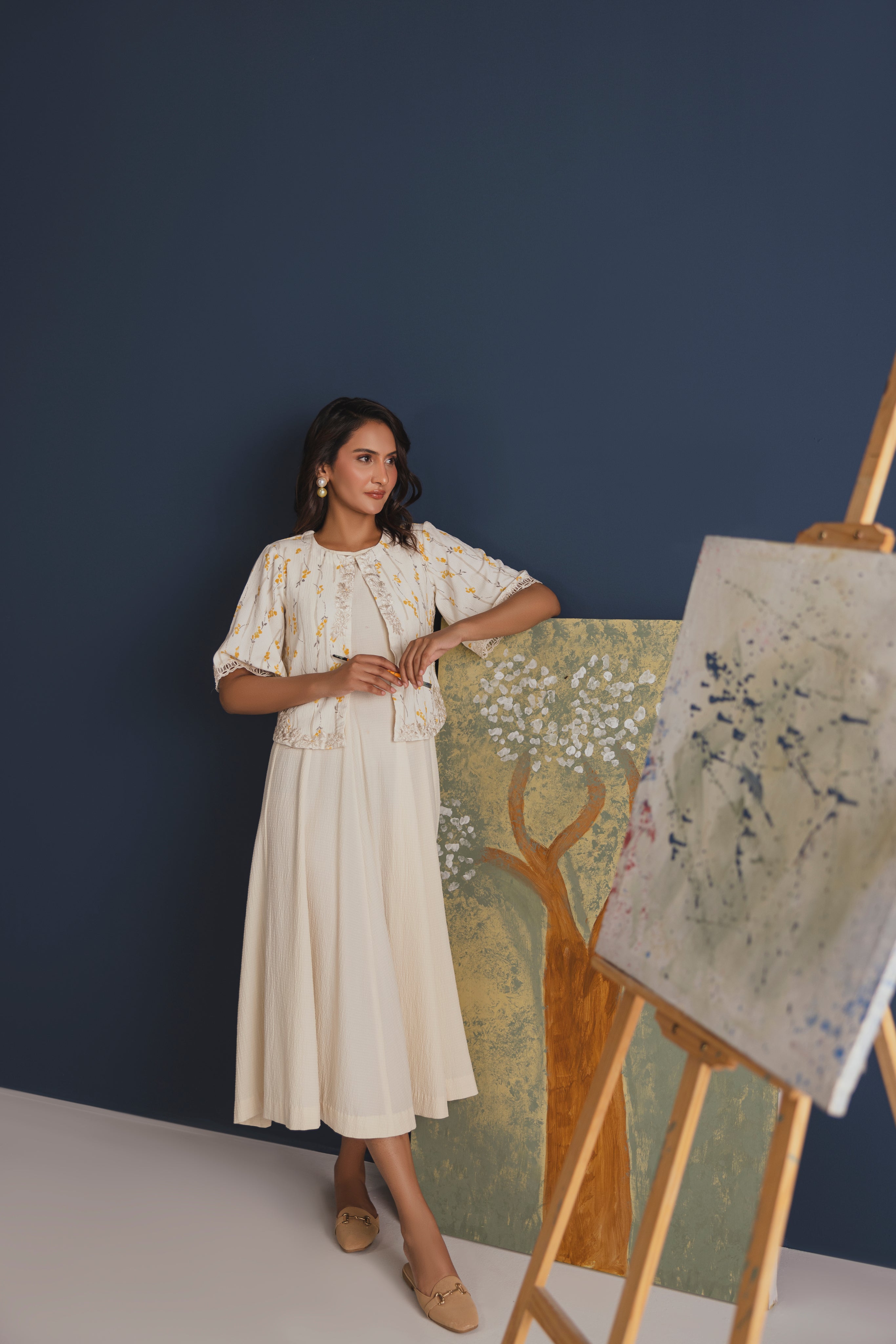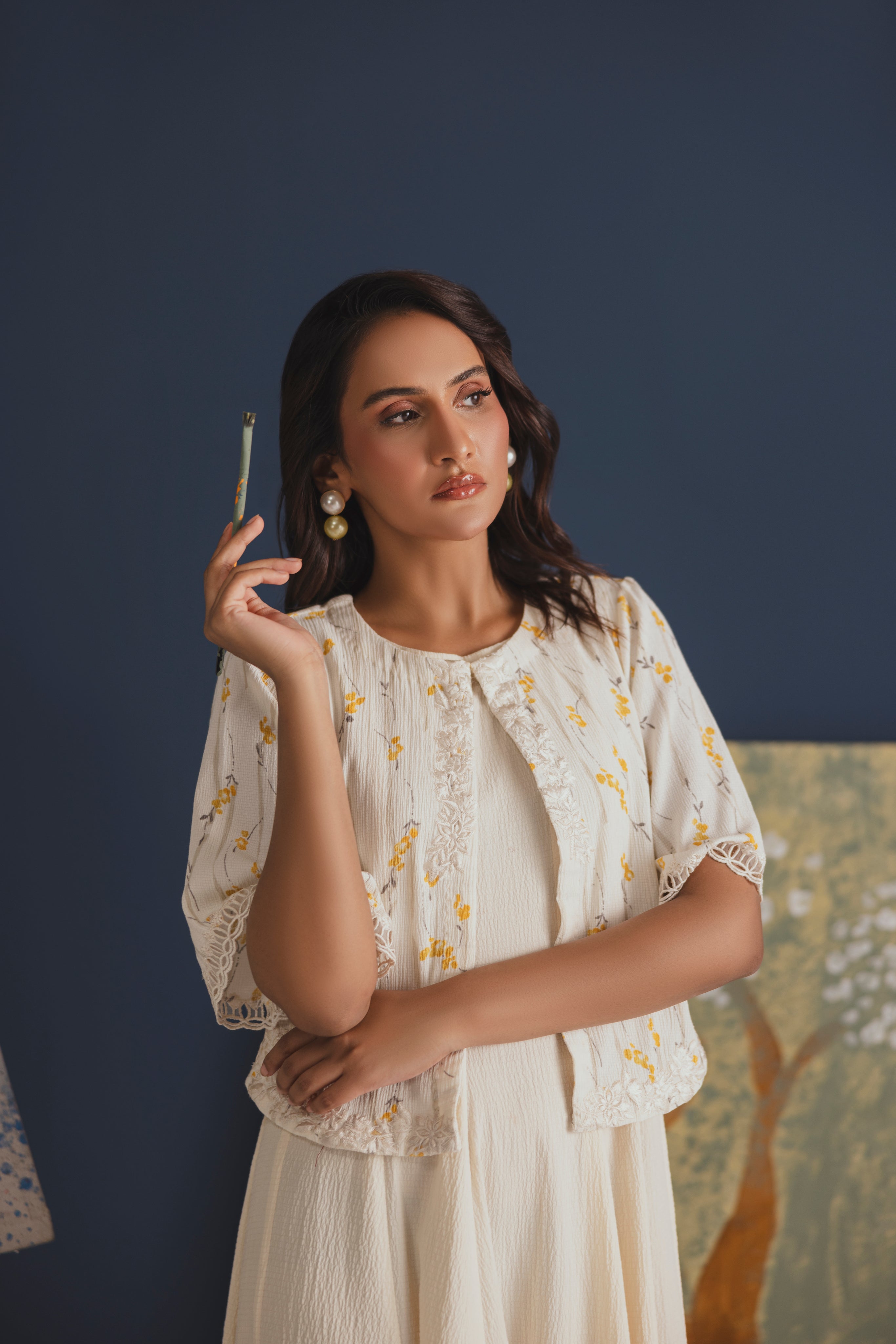 A mauve-brown co-ord in crushed CMY fabric, inspired by the delicate beauty of dried hydrangea petals