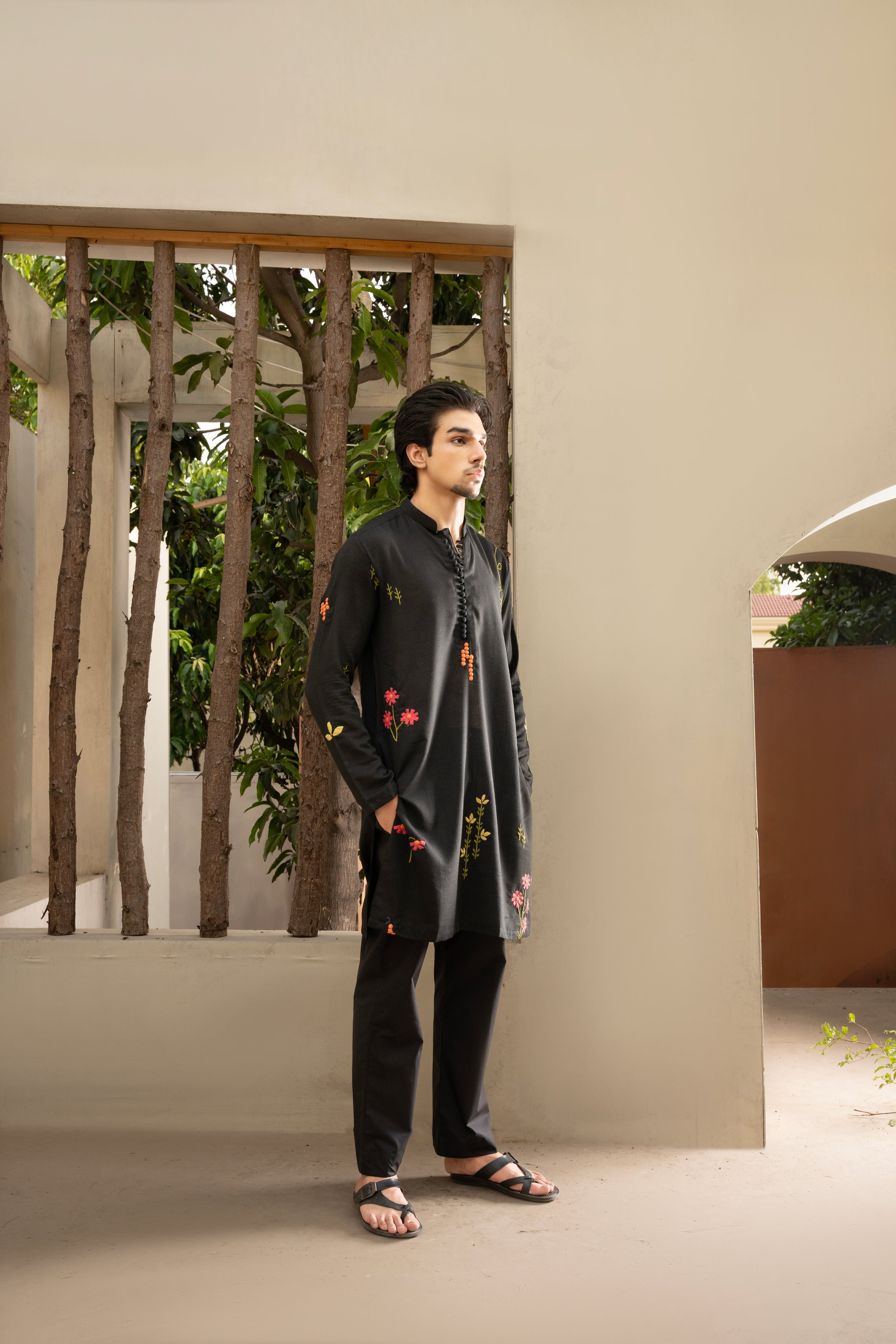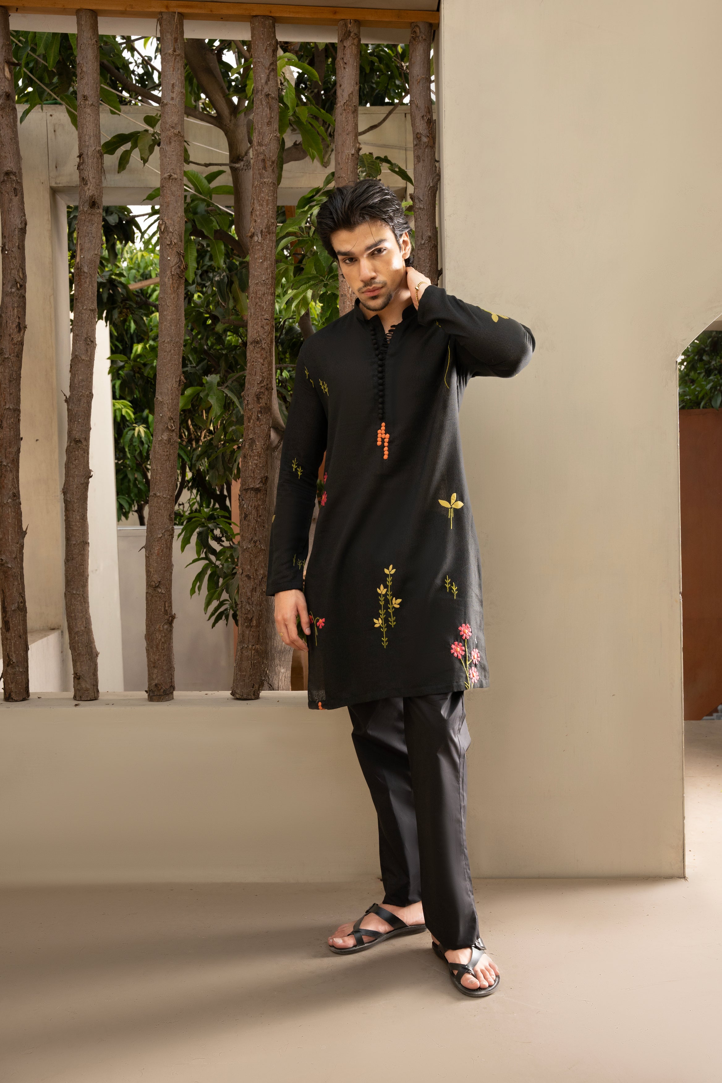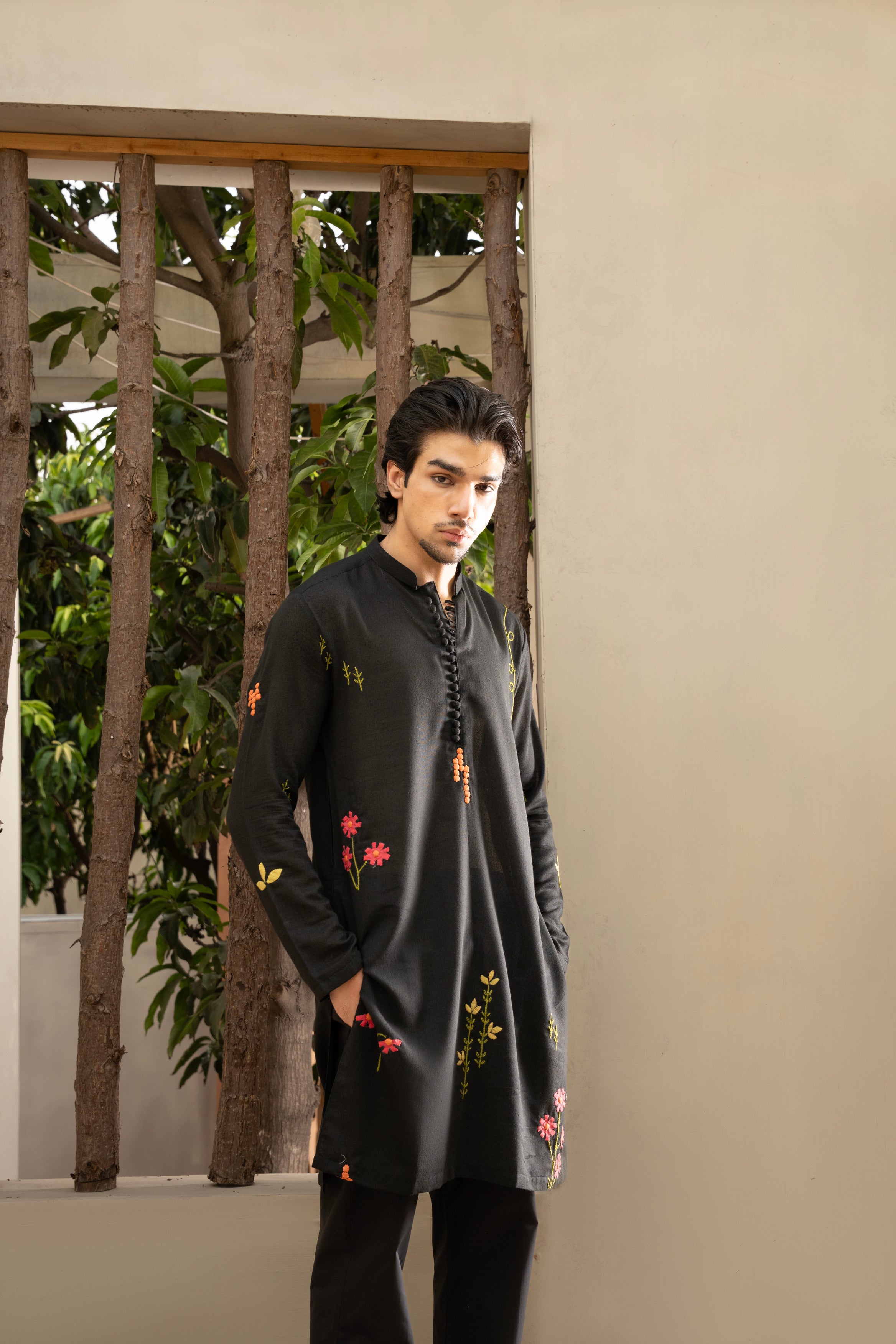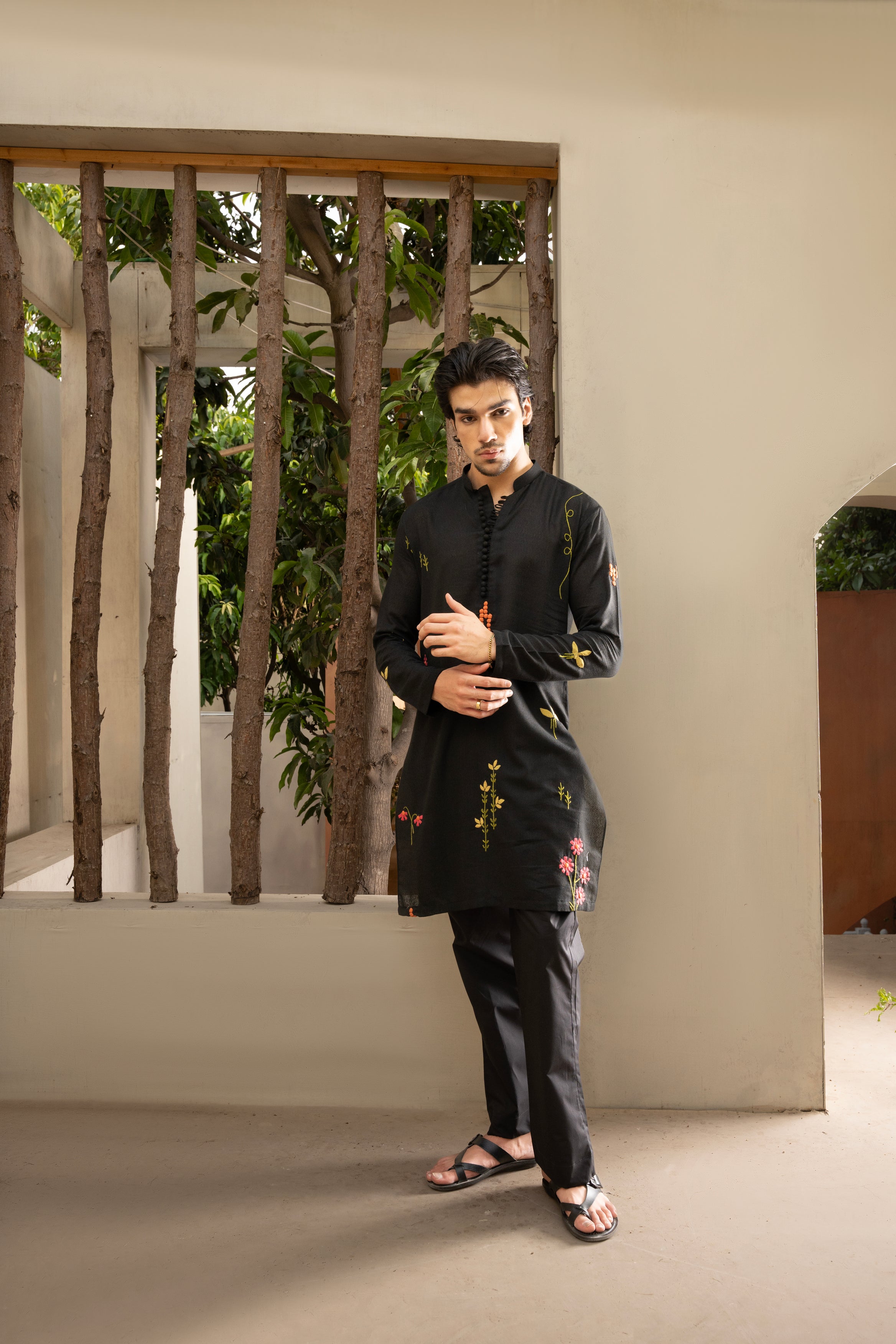Dyed jet-black kurta with vivid multicolor floral embroidery