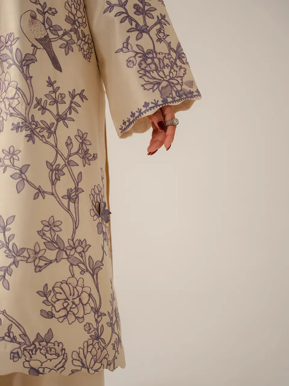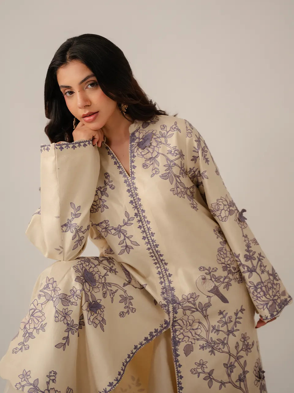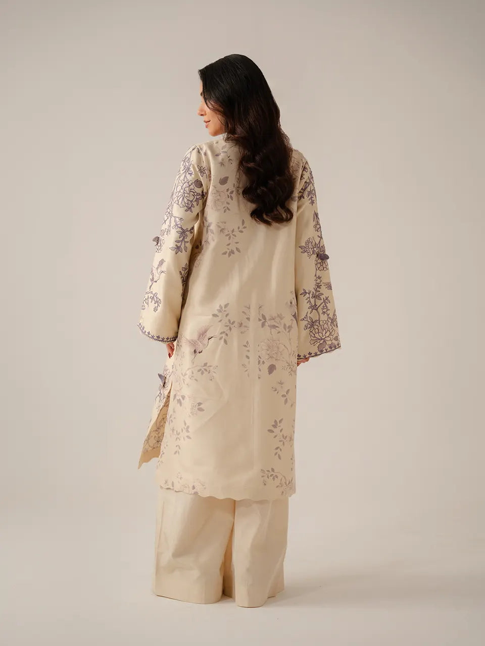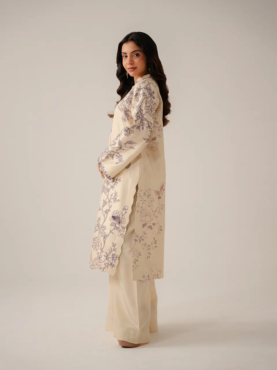 A serene off-white kurta featuring an elegant chinoiserie-inspired digital print in dusty lavender — trailing floral vines, blooming roses, cranes in flight, and perched birds meander across the ivory canvas in a flowing, asymmetric arrangement. The V-neckline is framed with a fine lavender embroidered placket trim in a delicate geometric pattern, while the collar carries a subtle 3D floral appliqué detail. Sleeves are adorned with the same flowing print throughout, finished with a fine embroidered cuff border. The scalloped hem adds a graceful, feminine finish. Paired with plain ivory wide-leg trousers and a matching off-white organza dupatta edged with a fine lavender embroidered border — light, airy, and effortlessly elegant.