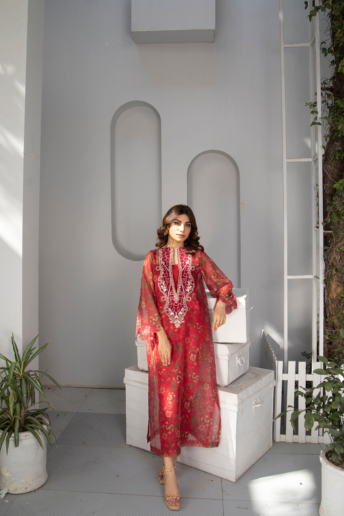 Elevate the look with ruby-toned earrings and nude heels, or add a soft shawl for an extra touch of evening elegance.