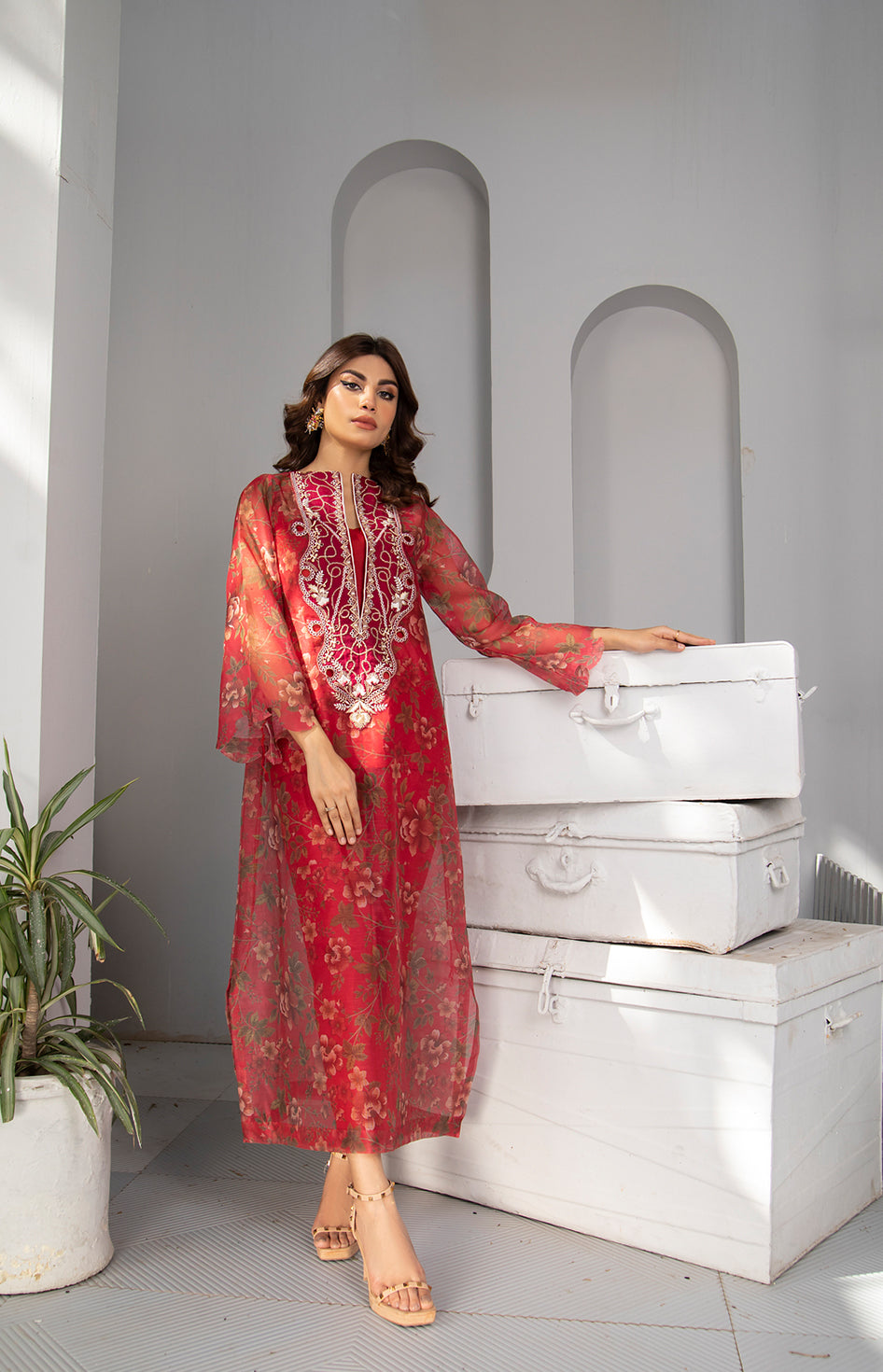🔥 Scarlet Rose – Cotton Net Shirt with Blooming Rose Digital Print & Embroidered Neckline