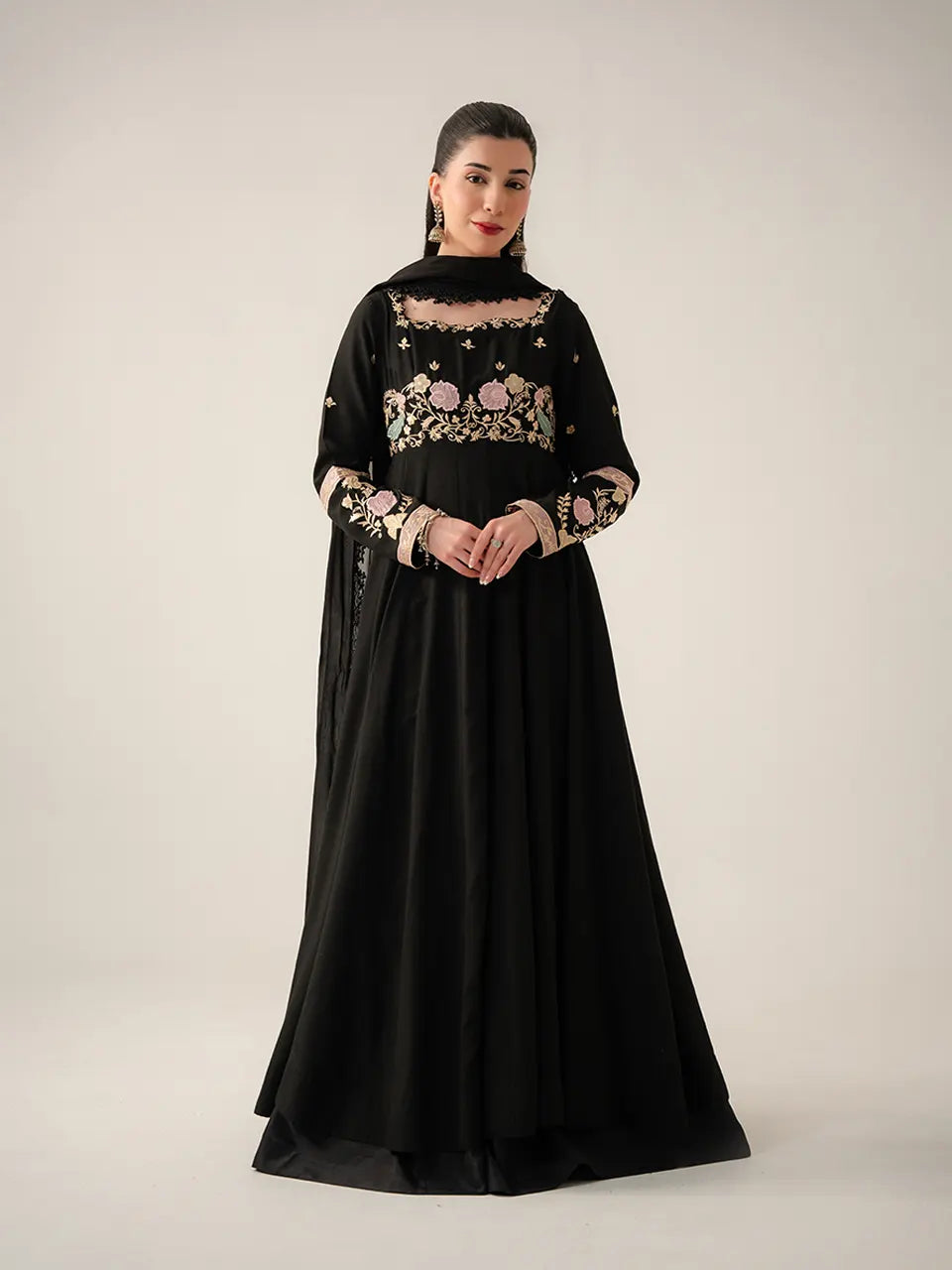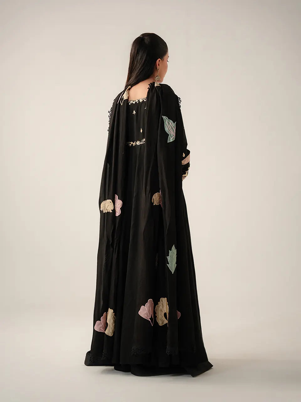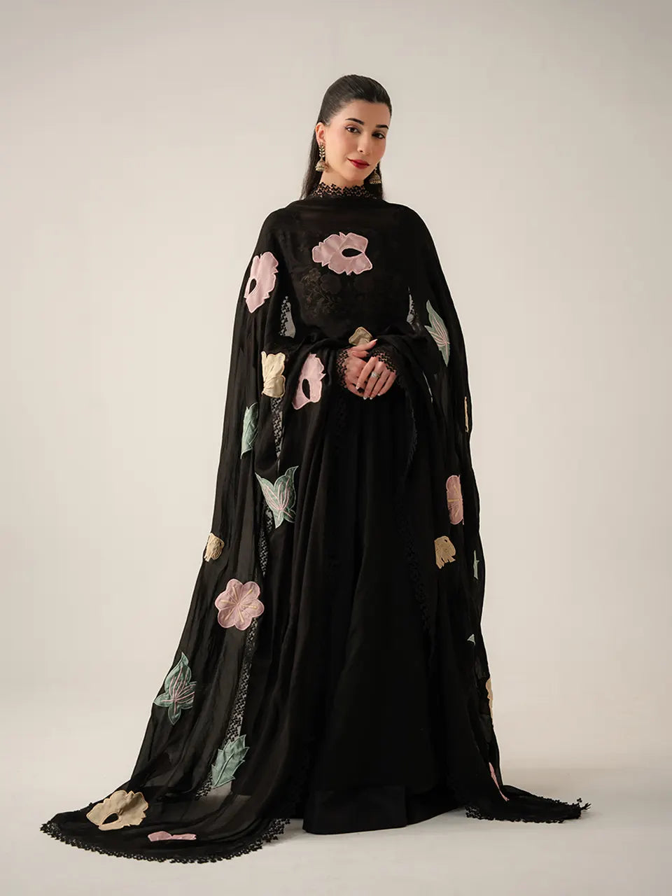 The collection's grand finale — a jet black Anarkali-style gown of quiet, commanding authority. The solid black base is elevated with a richly embroidered yoke featuring blooming roses and golden vines in rose-gold zardozi and resham, anchored by a square neckline trimmed with fine black lace. The fitted waist flows into a sweeping A-line skirt, with embroidered cuffs in a matching gold and blush floral band. Large-scale appliqué florals in blush, sage, and ivory drift across the dramatic trailing skirt — oversized lilies, rose clusters, and tropical leaves placed with painterly deliberateness. The wide-sweep black organza dupatta carries the same large appliqué blooms scattered freely across its length, finished with an intricate black lace border hem for a formal, floor-grazing finish.