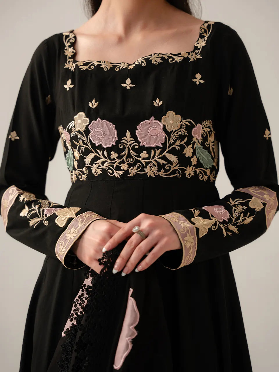 Key Details: Square neckline with lace trim, rose-gold zardozi yoke embroidery, oversized floral appliqué on skirt & dupatta, embroidered cuff band, black organza dupatta with lace hem border, A-line Anarkali silhouette.