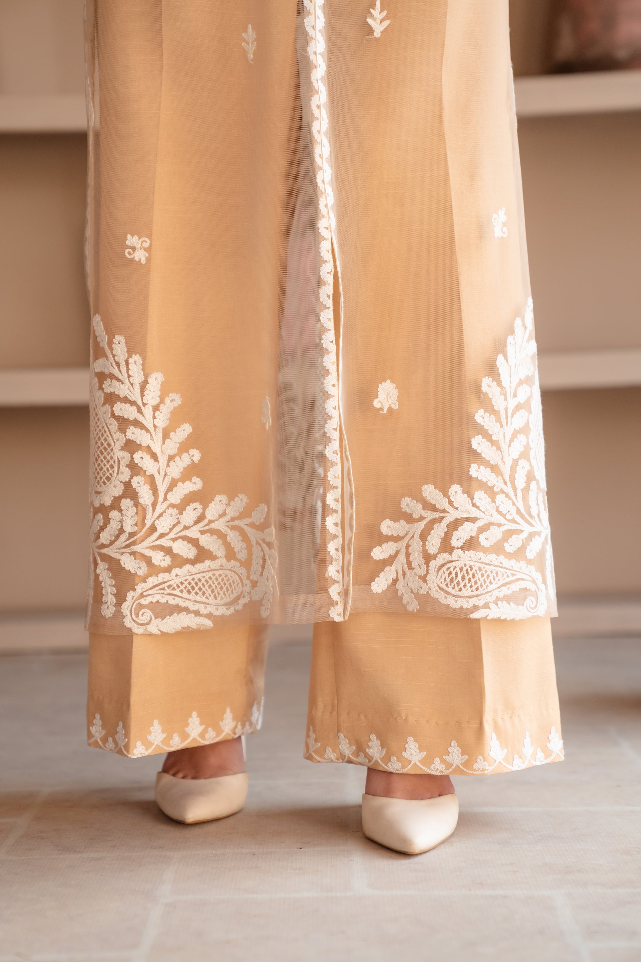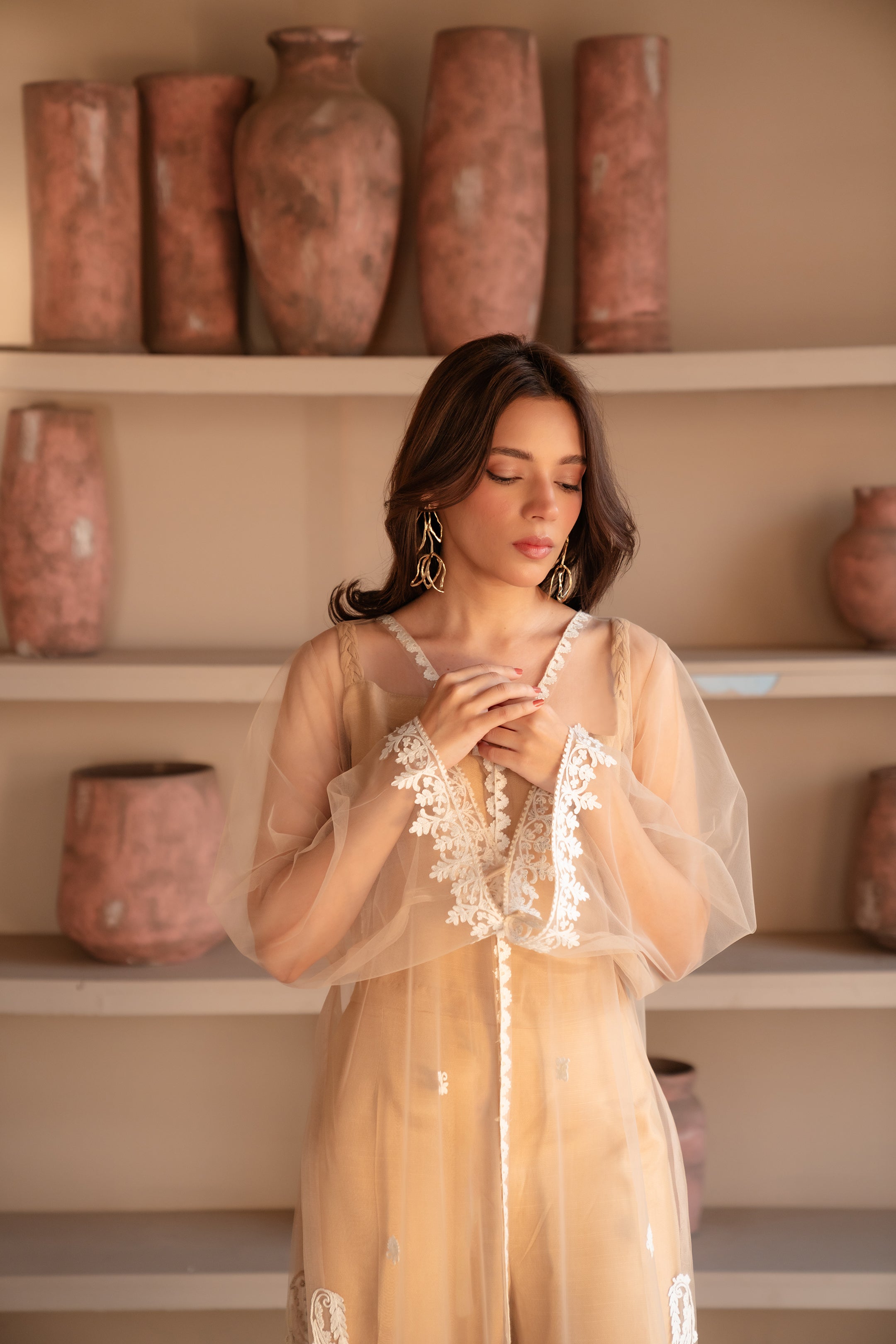 Drape yourself in the ethereal charm of Soleil, a masterpiece from our Serenè Spring/Summer ‘25 collection. Designed in a soothing beige hue, this ensemble embodies effortless grace with a delicately embroidered net gown, flowing like a whisper of luxury. The sheer net fabric, dyed in a soft beige, is adorned with intricate embroidery along the hemline and sleeves, adding a touch of timeless sophistication.