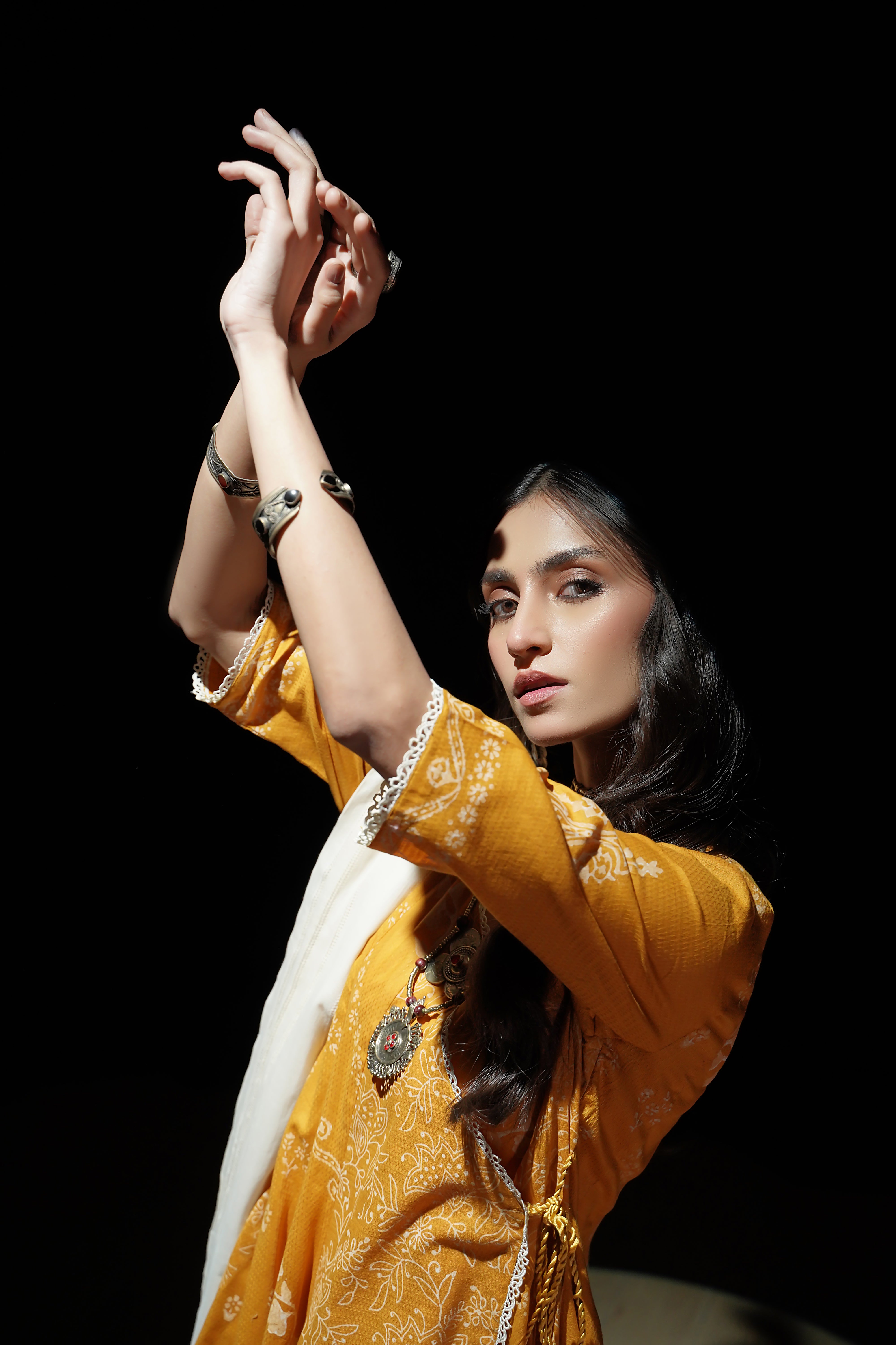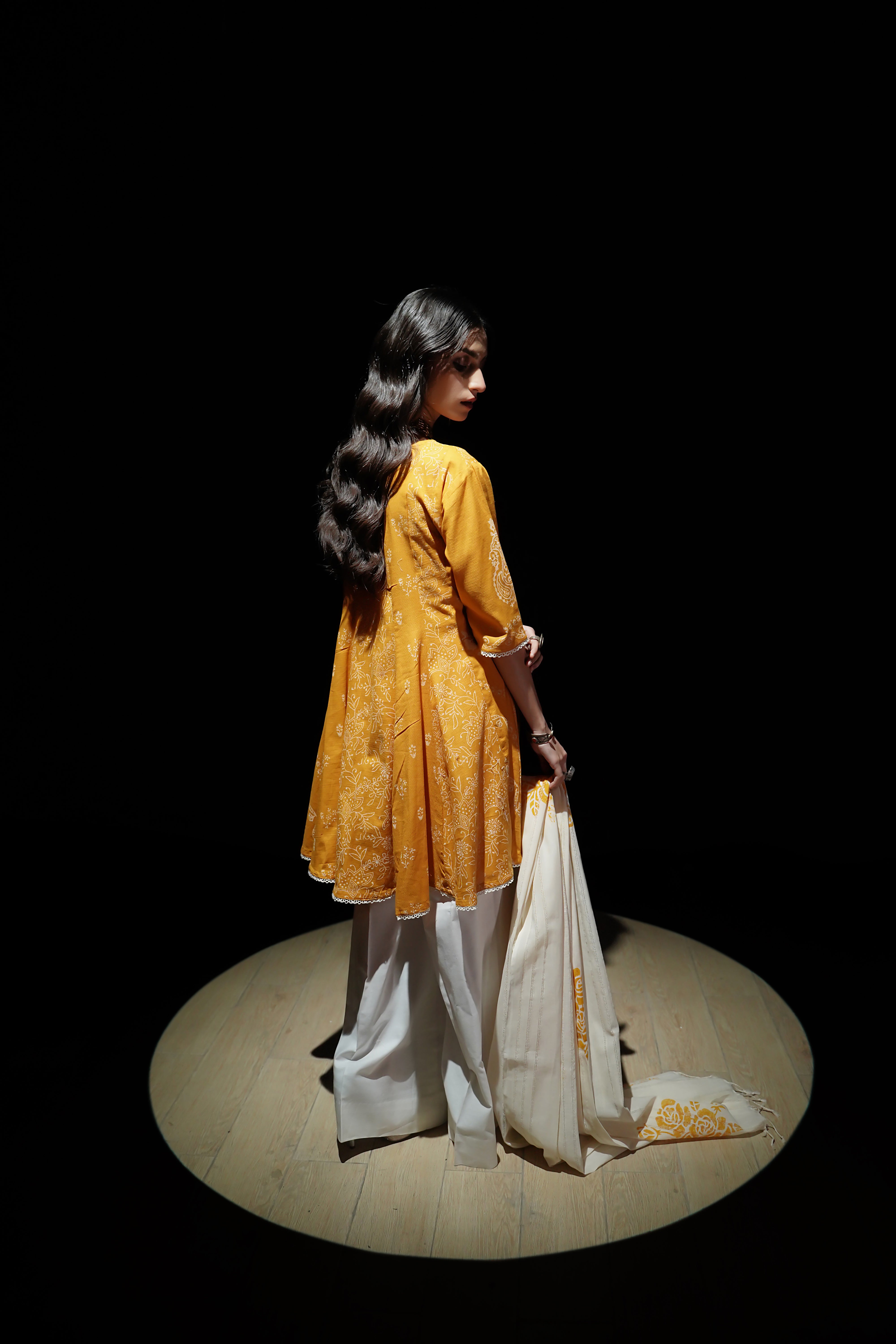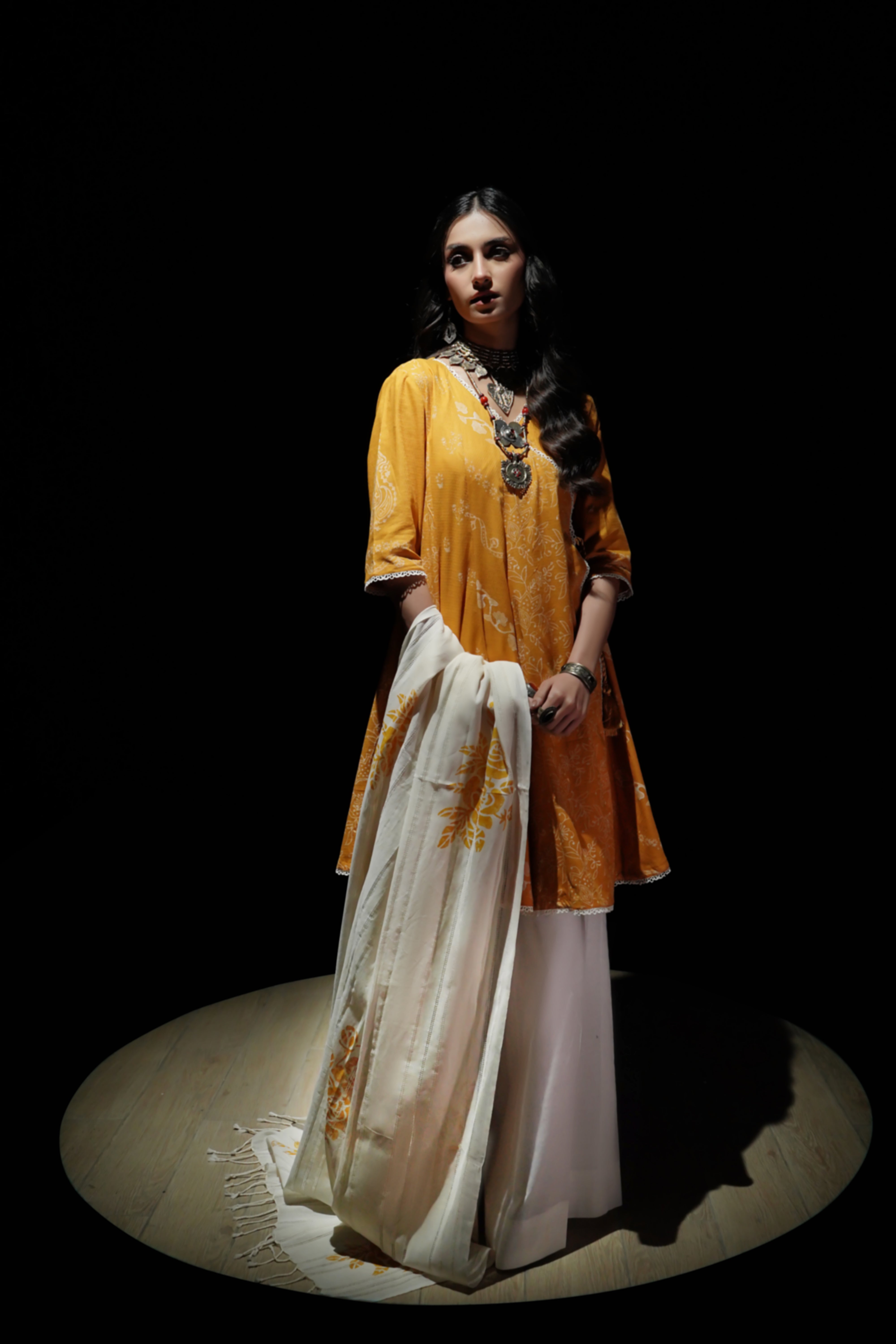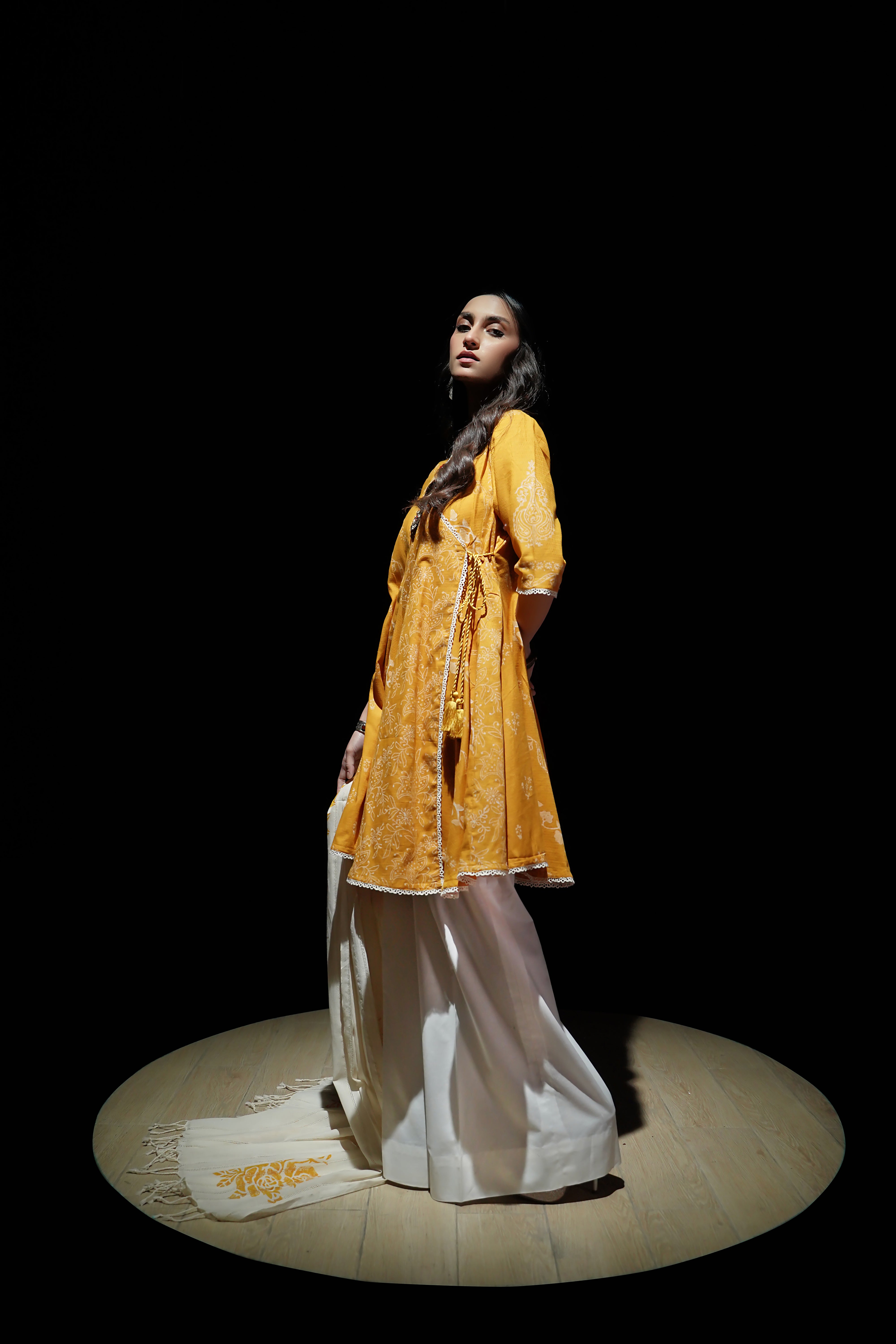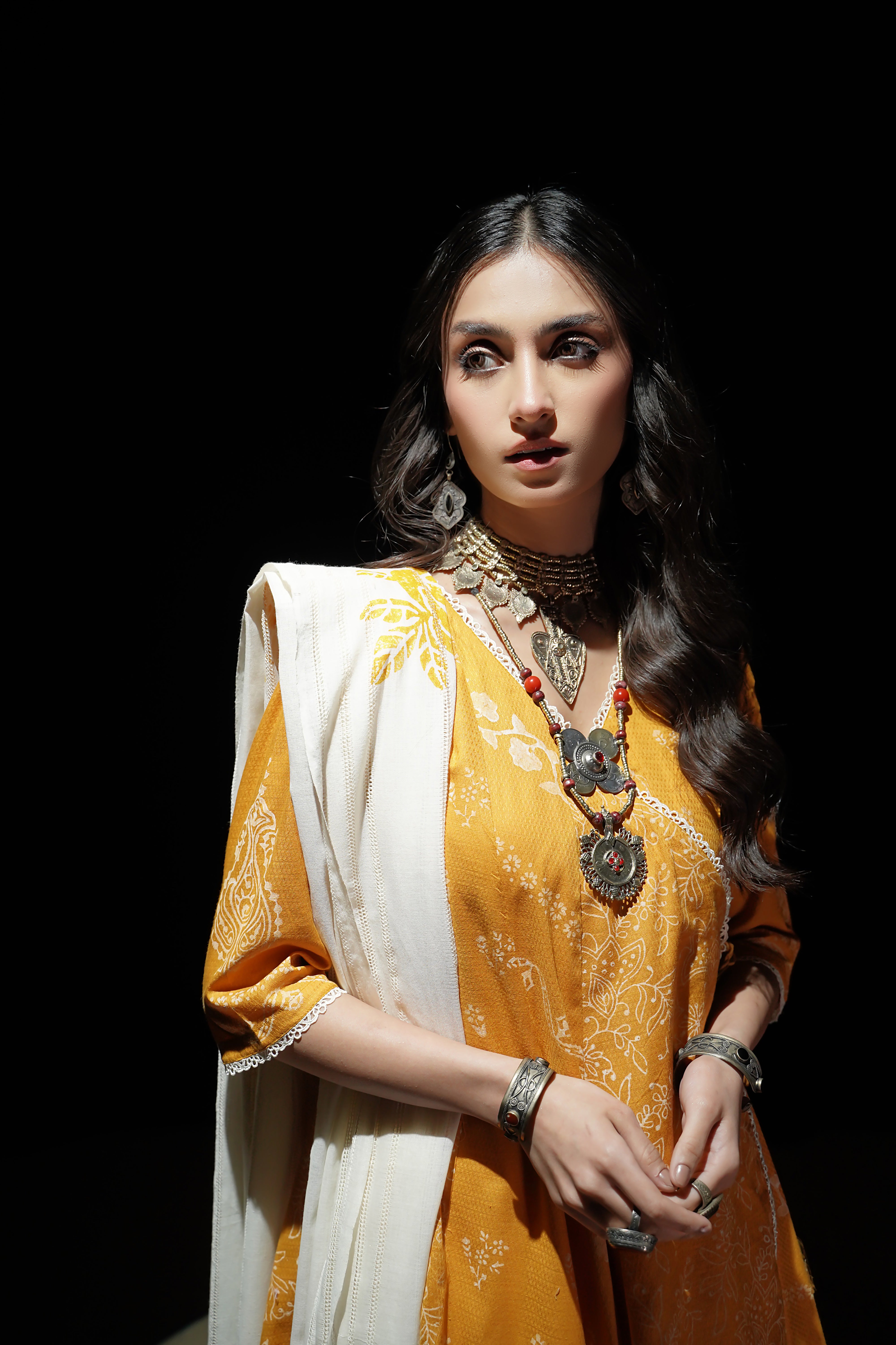 Radiate timeless charm with Sonehri Kiran, a mustard 3-piece ensemble designed in a graceful angrakha style with a mid-length hemline that flatters the silhouette. The dress features intricately block-printed panels that bring elegance and visual richness to the look. Paired with loose-fitting pants for comfort and ease, the outfit is beautifully completed with a Doria drape adorned in a stunning mustard floral block print — a perfect blend of sophistication and cultural artistry.