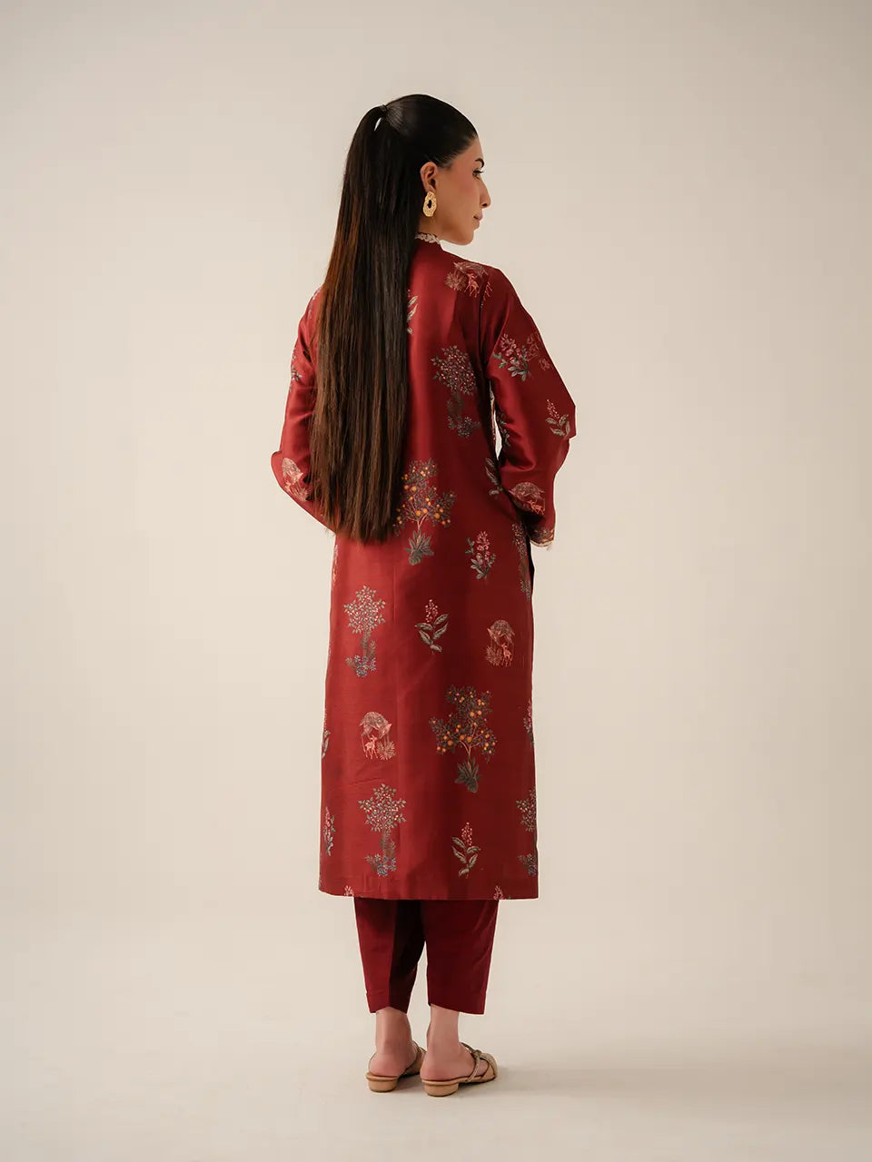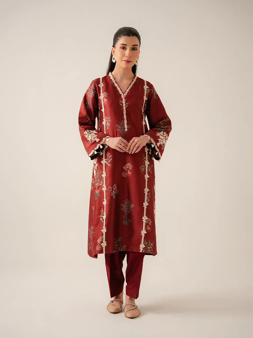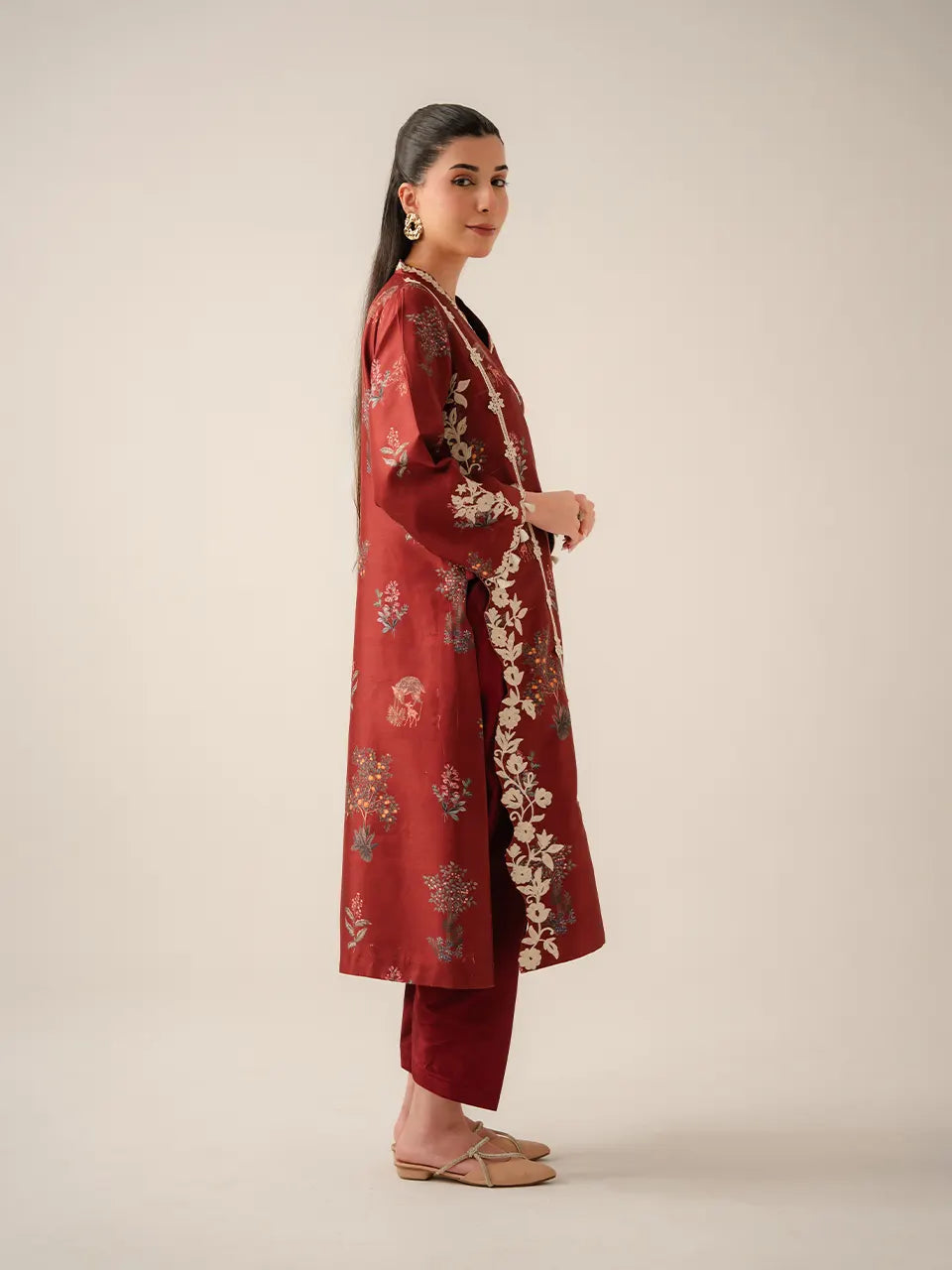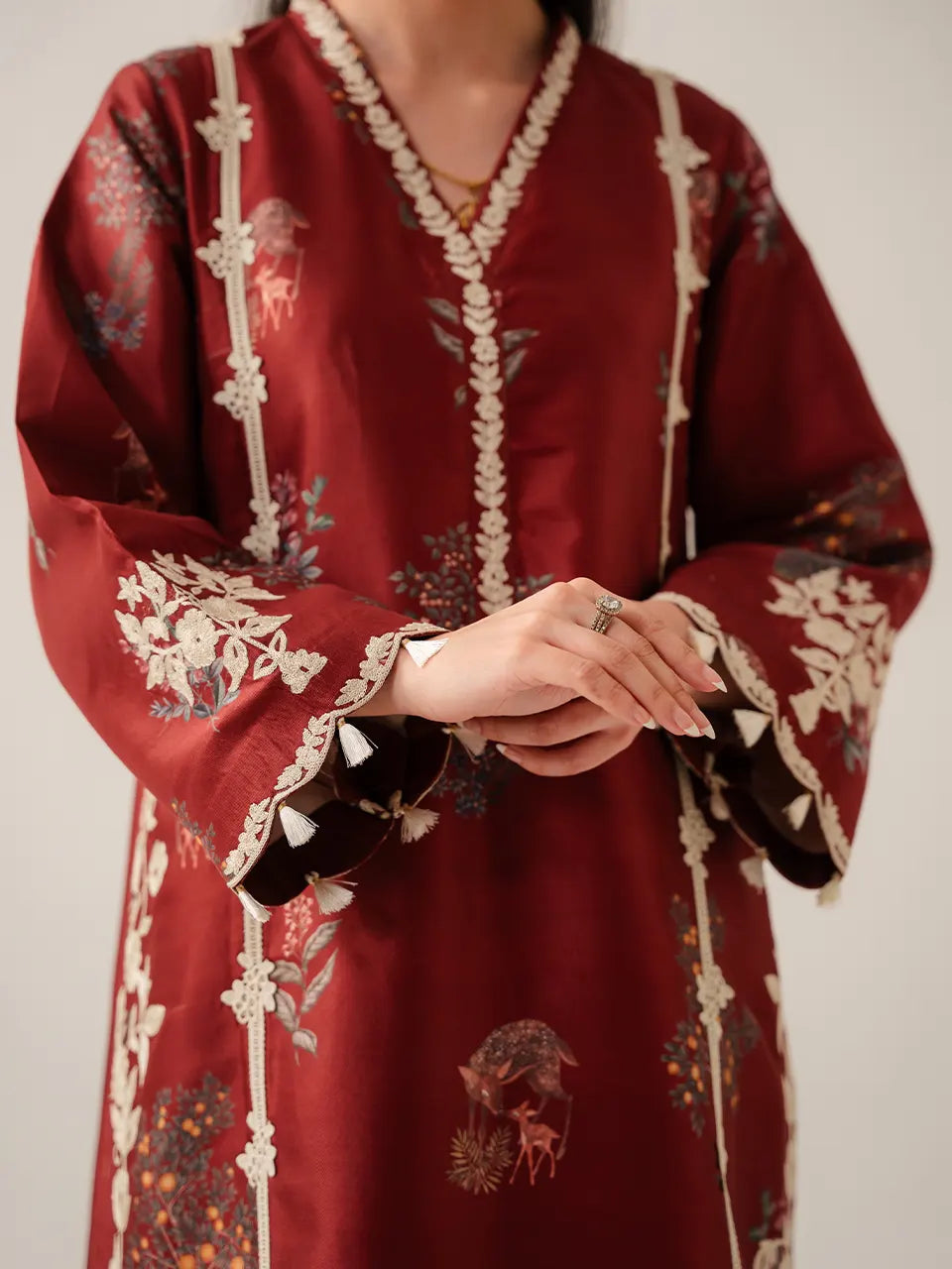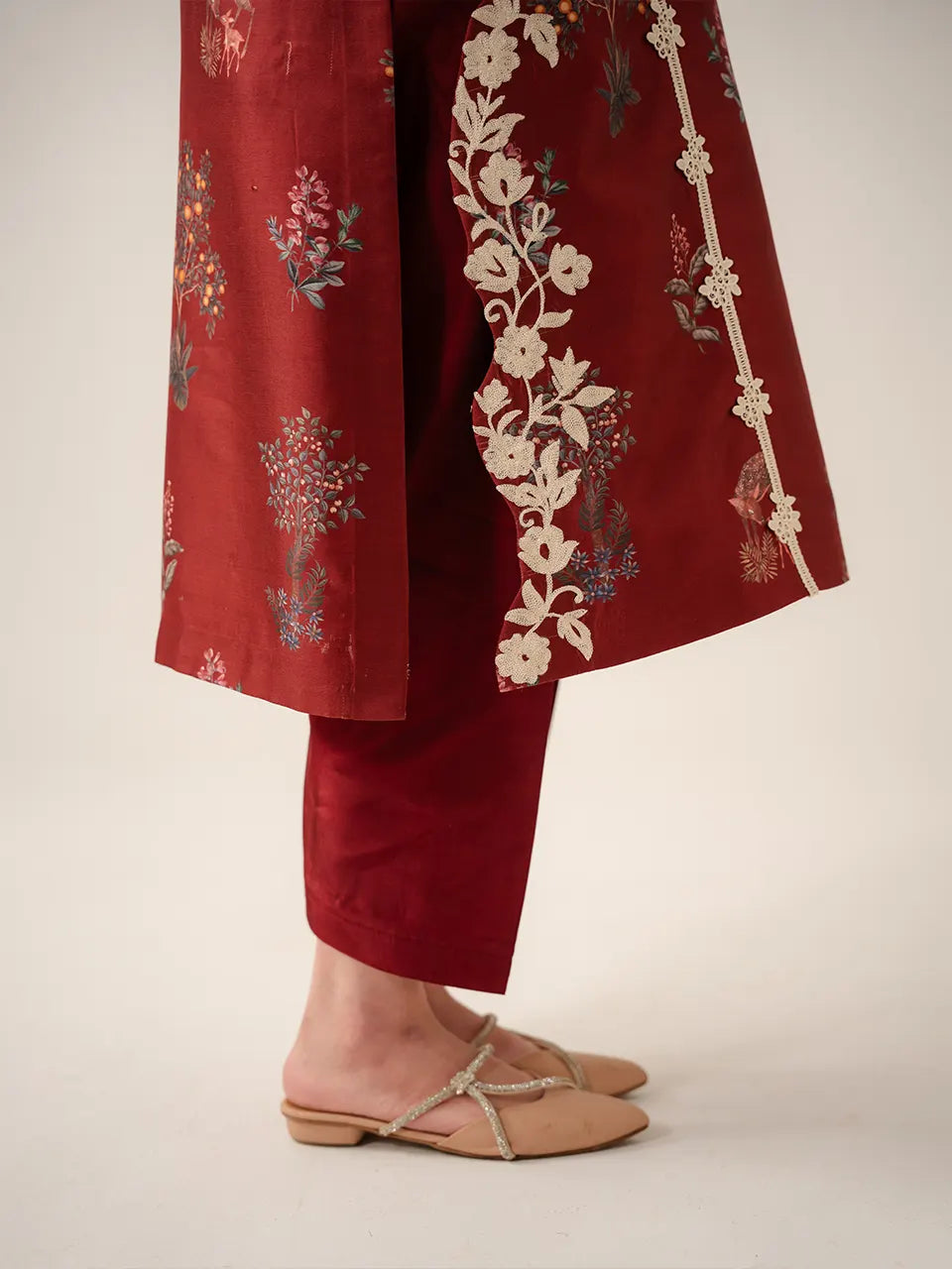 A rich maroon kurta adorned with an all over botanical and wildlife digital print featuring scattered wildflower clusters, deer, and forest foliage in muted teal, blush, and amber tones. Vertical cream floral appliqué vines run the full length of the kurta on both sides, creating a striking panel effect that elongates the silhouette. The V-neckline is framed with delicate cream leaf embroidery, while the bell sleeves are finished with white floral appliqué at the cuffs and a charming tassel trim edge. A large trailing floral appliqué vine cascades down the side slit, adding movement and drama. Paired with slim-cut matching maroon trousers.
