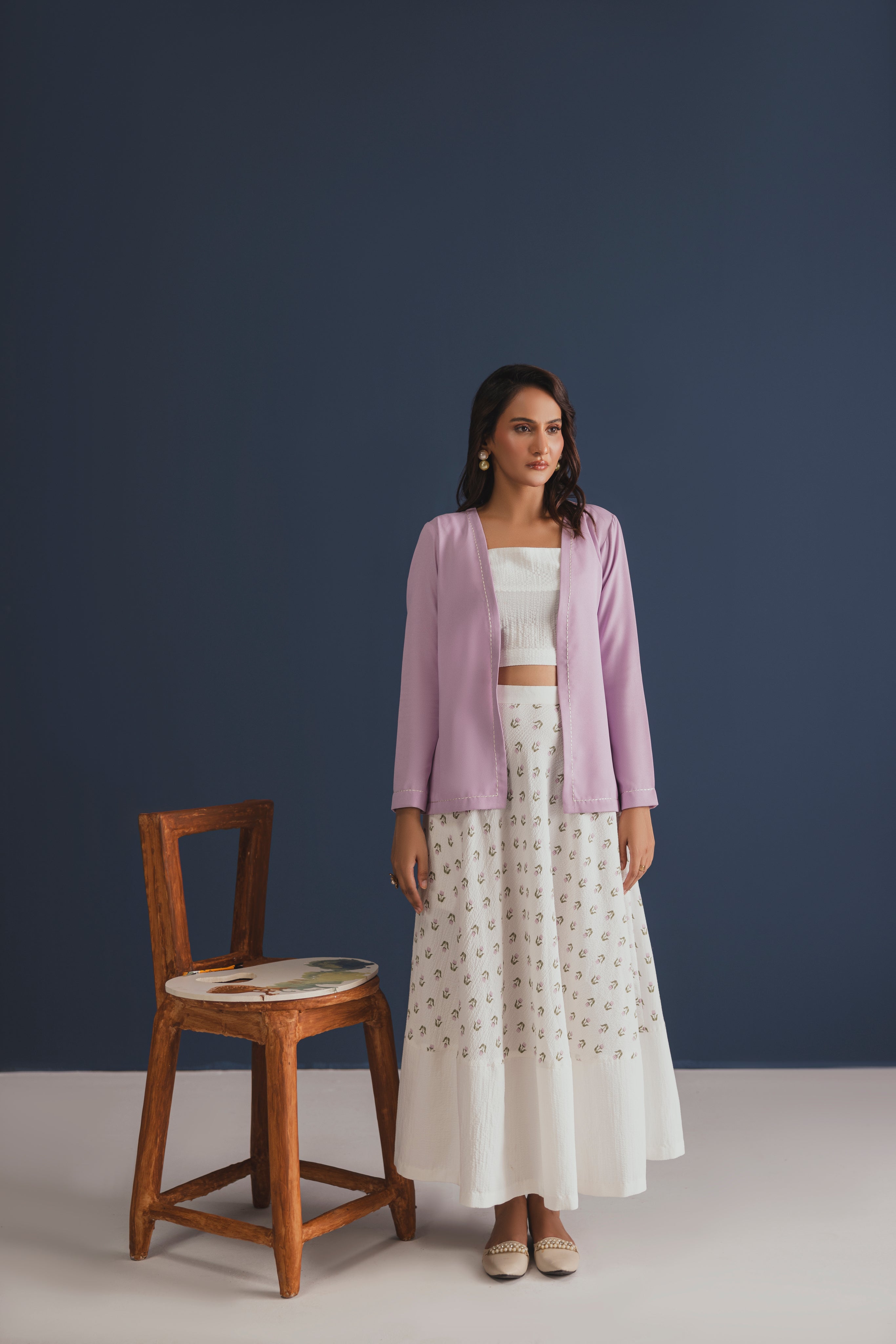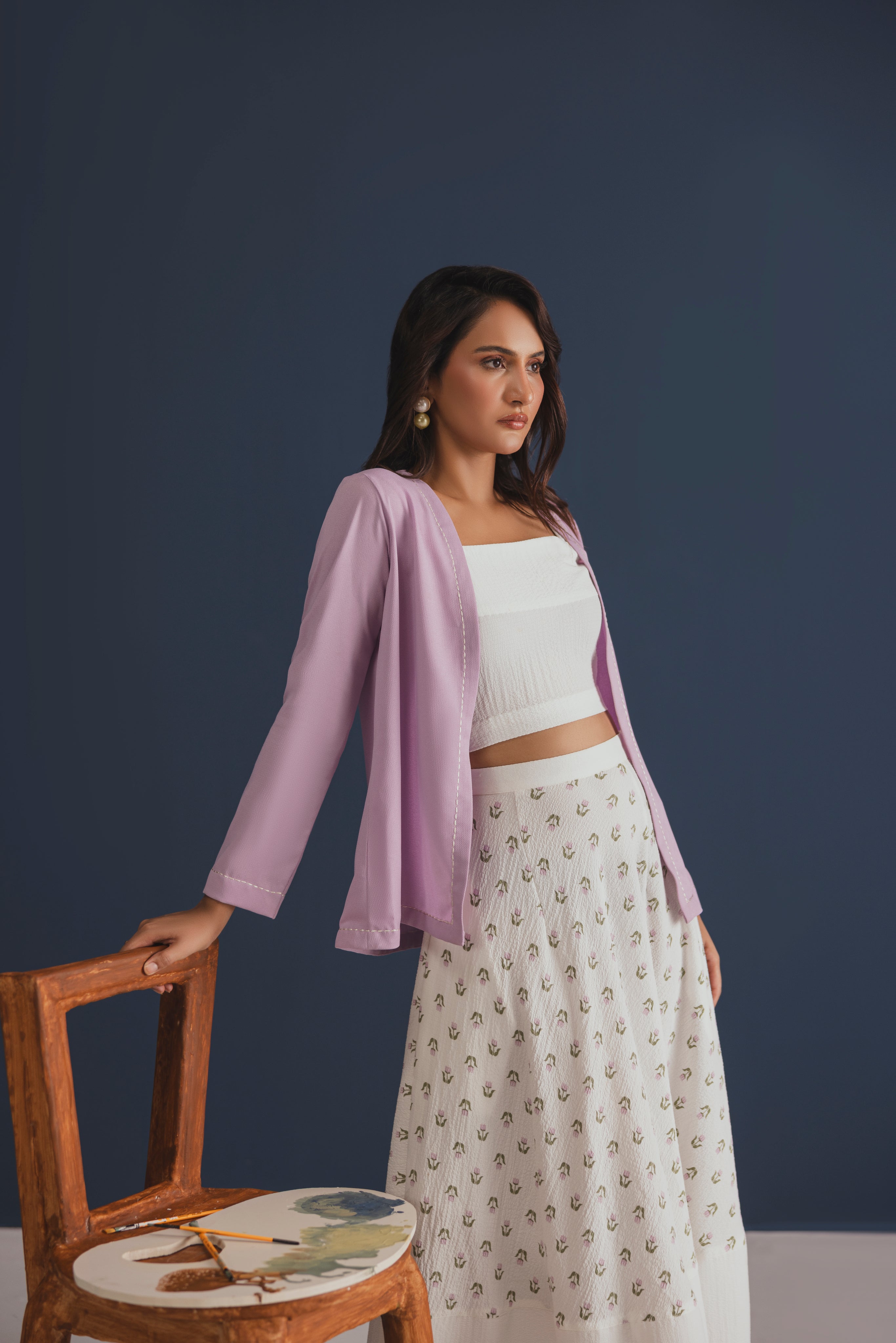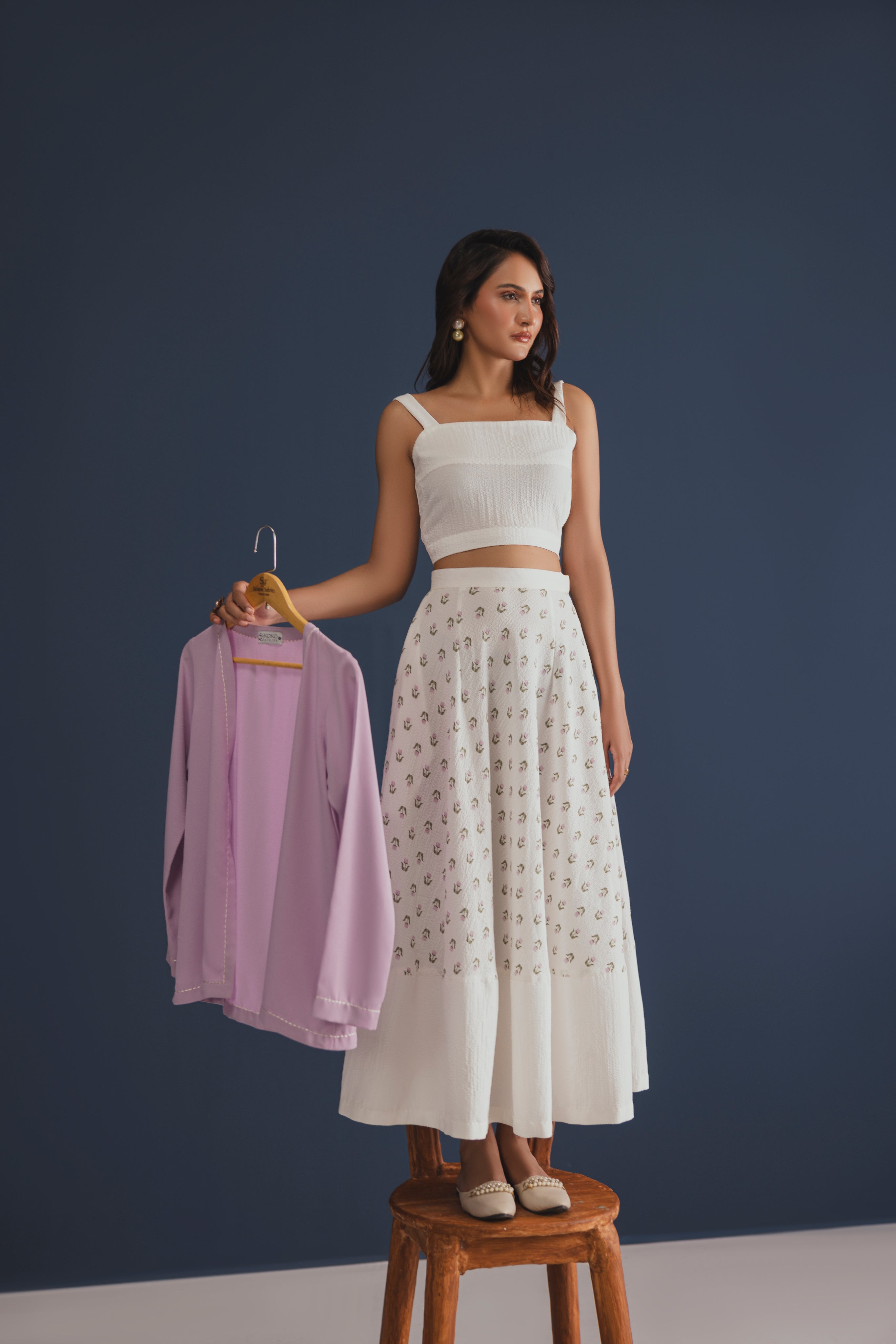 Flowy ivory skirt adorned with delicate lilac floral motifs
