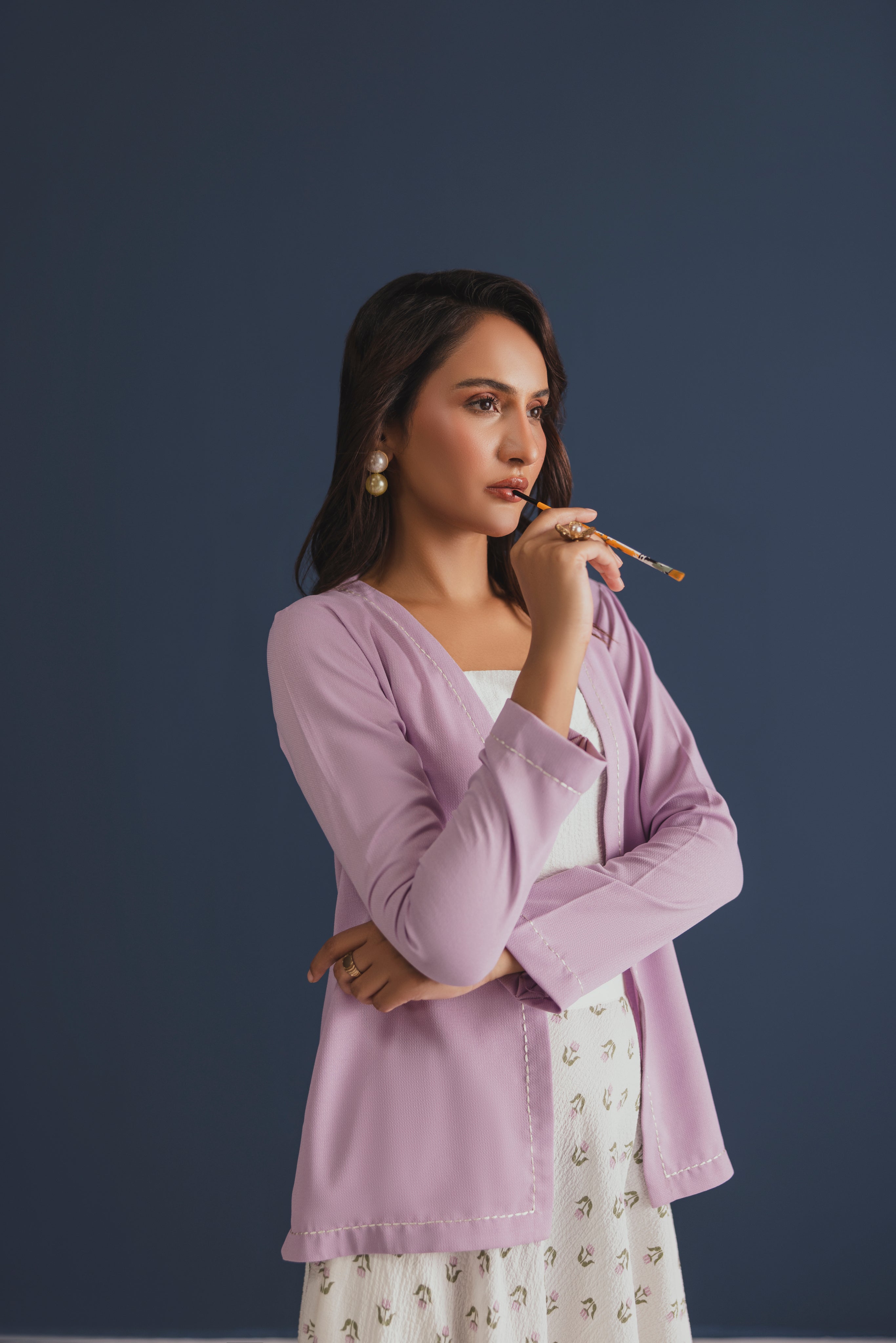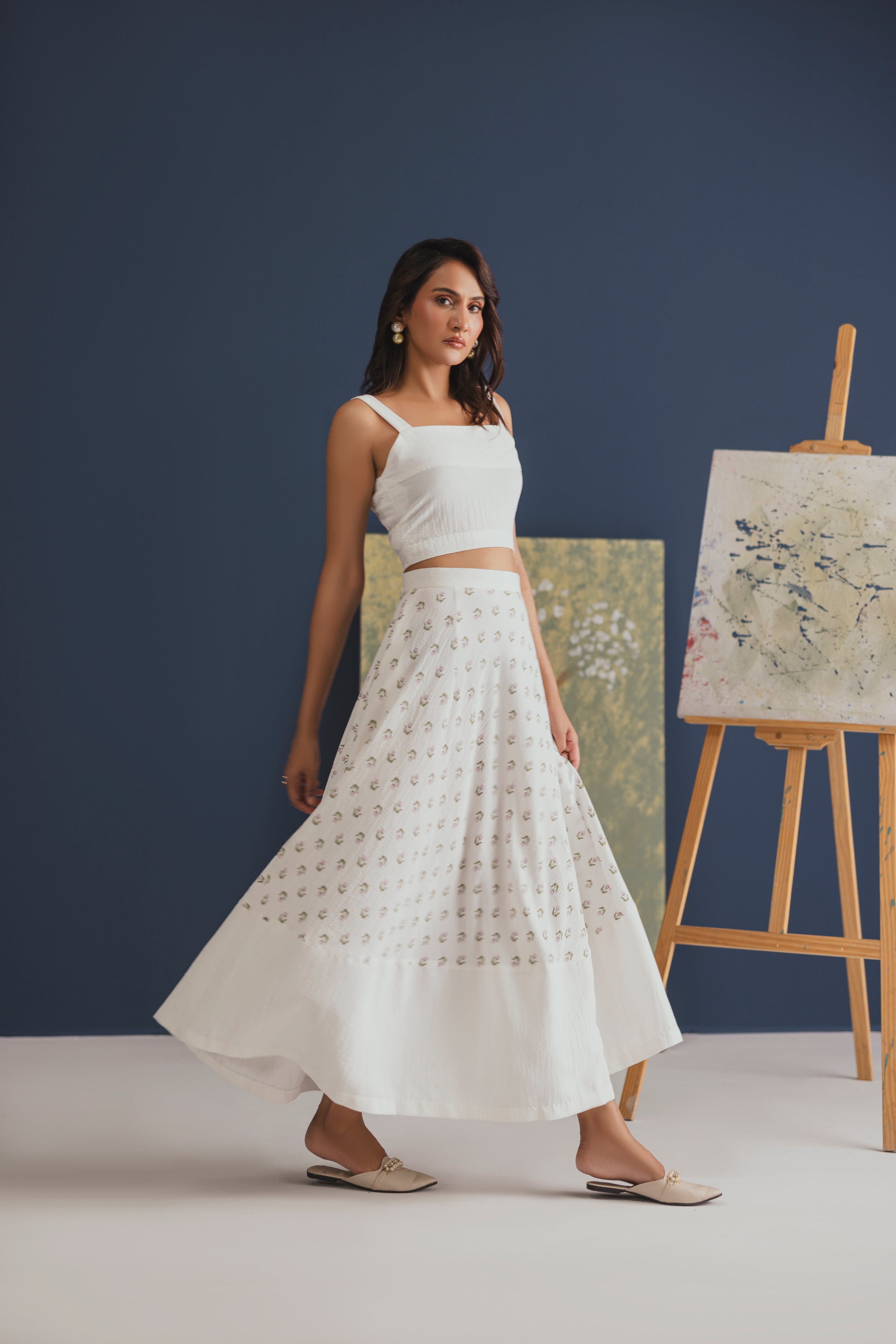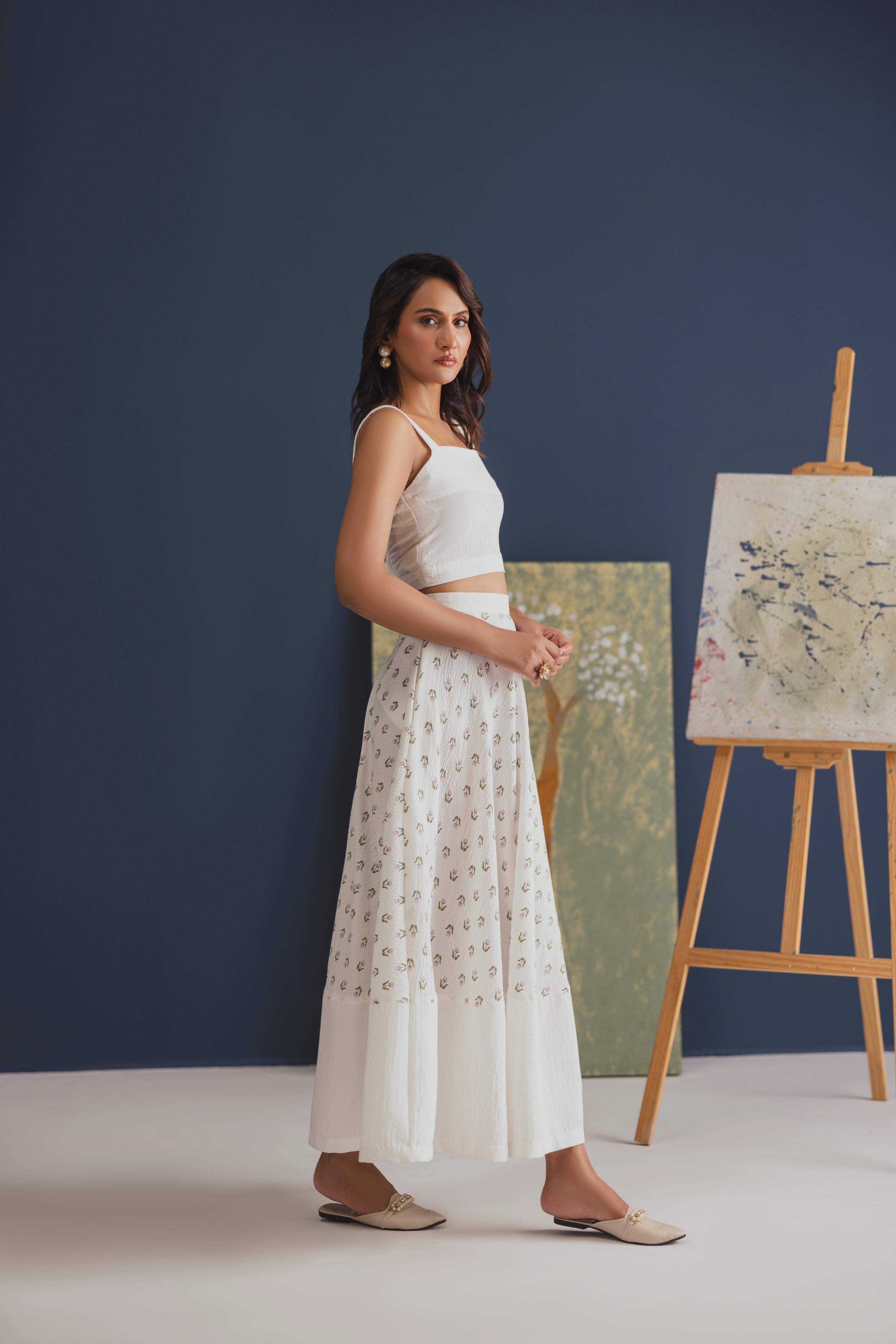 Flowy ivory skirt adorned with delicate lilac floral motifs