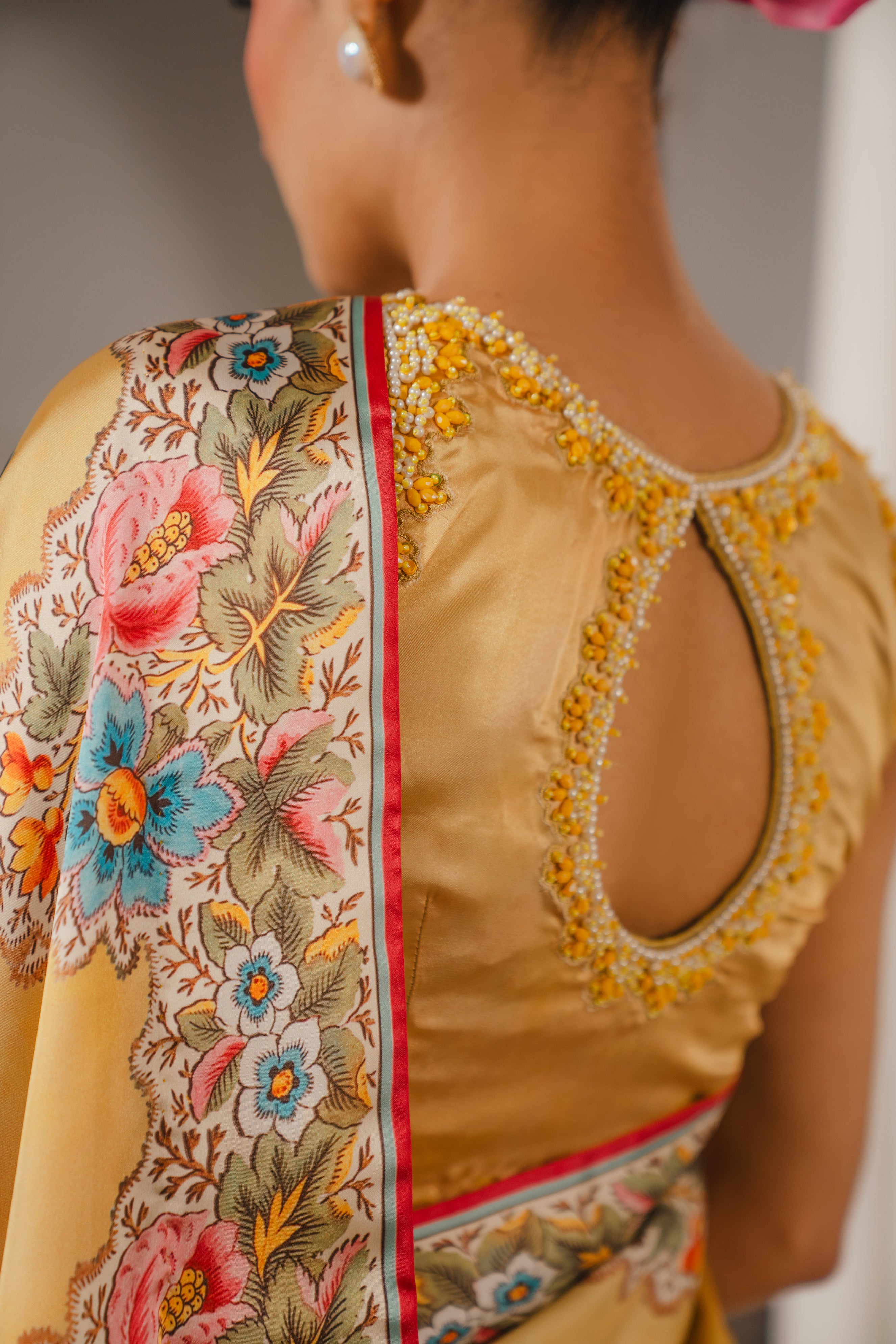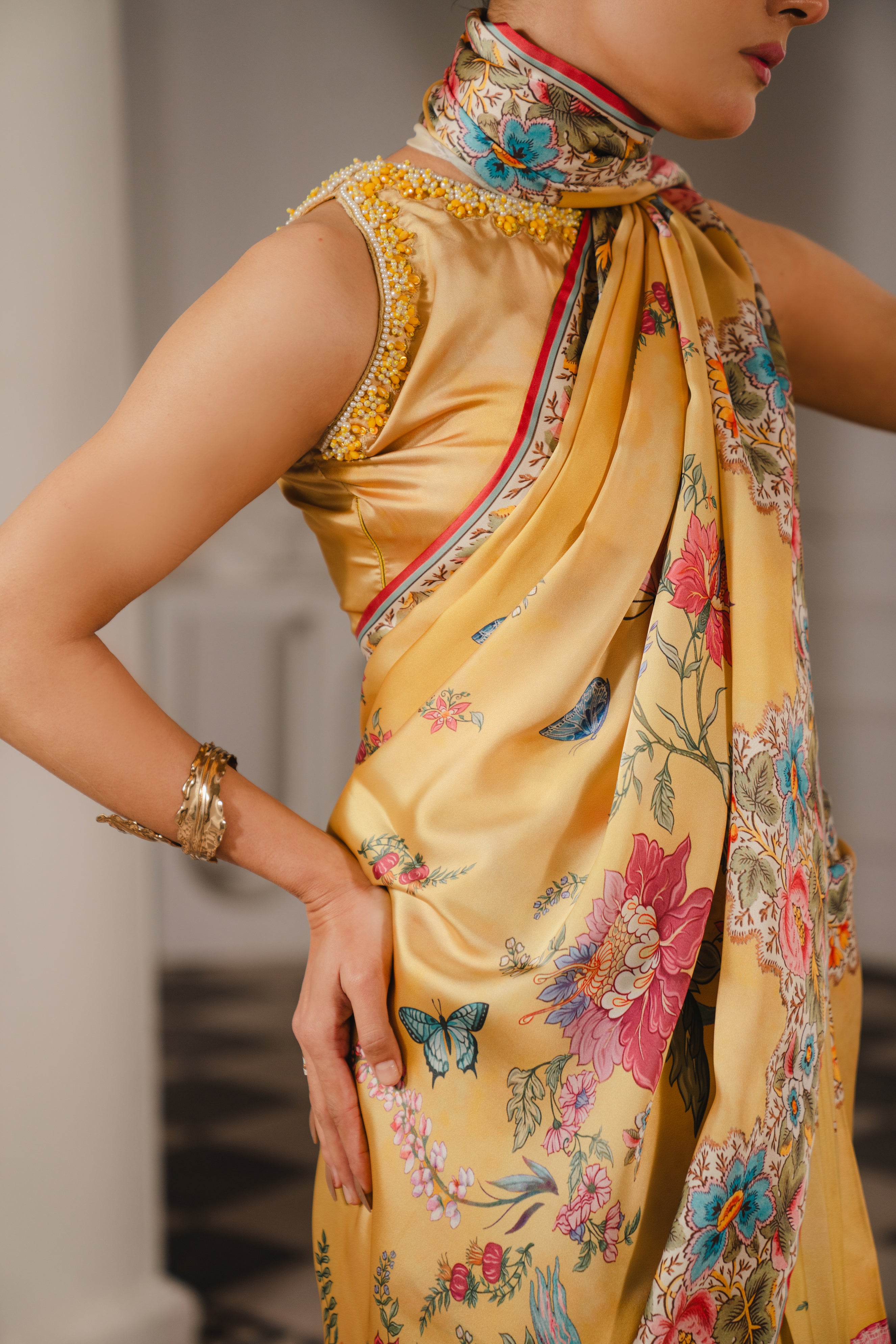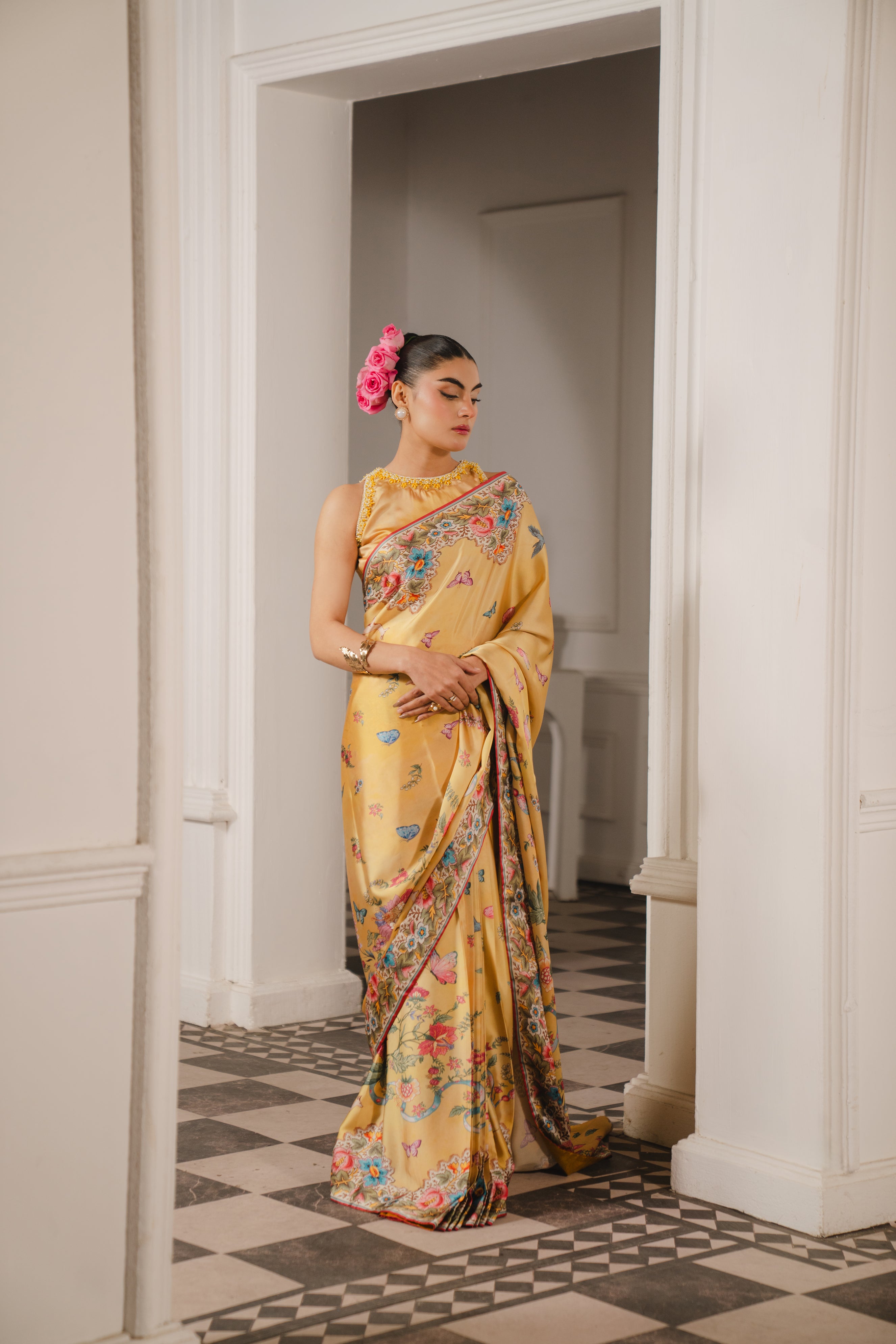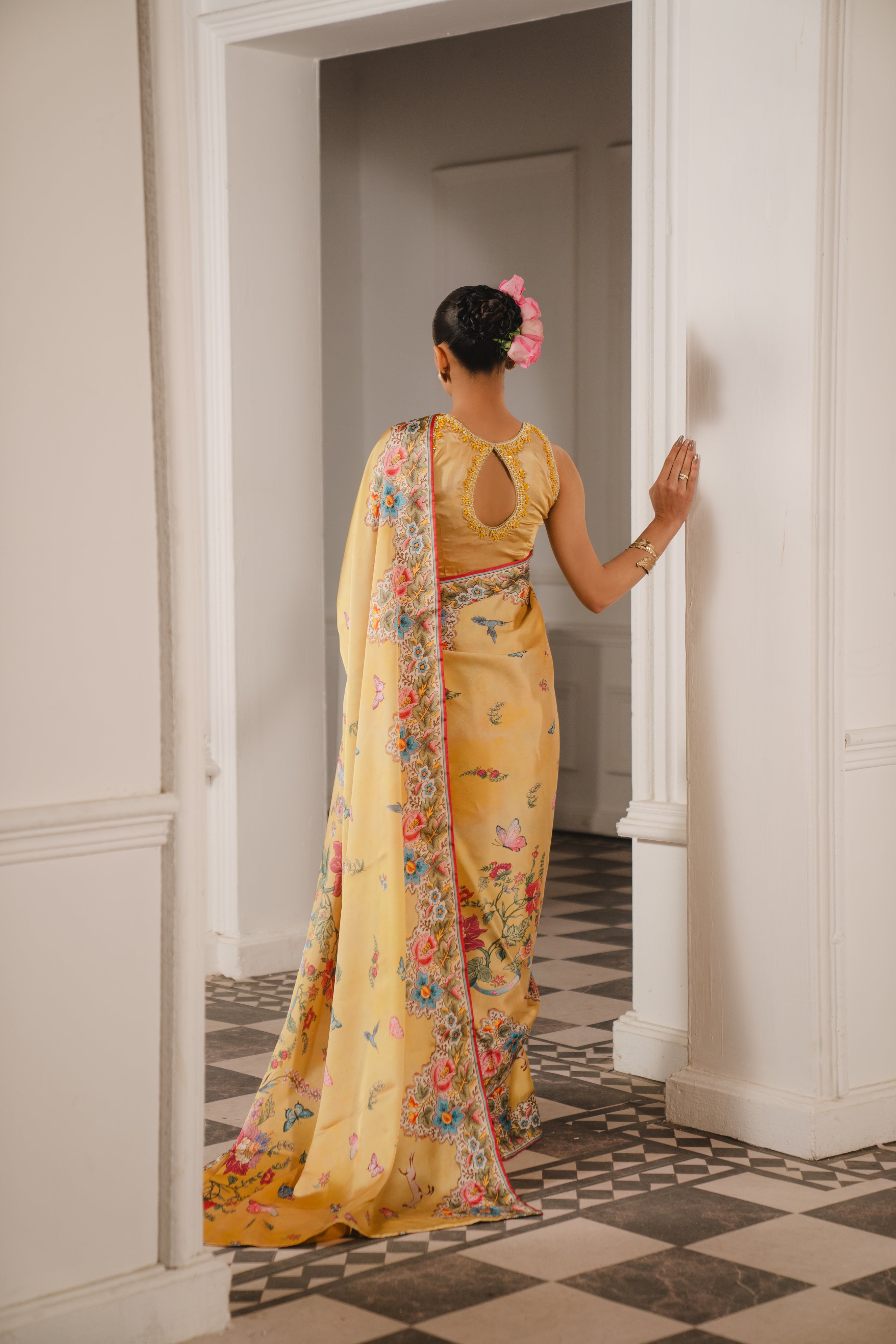 A joyous sunlit yellow saree that's impossible to ignore. Across the silk, hand-embroidered butterflies and blossoms flutter in shades of coral pink, cobalt blue, and jade green—creating a garden in motion across the yellow canvas. The border is where things get truly spectacular: dense floral embroidery packed with detail and highlighted with golden zari work that catches every ray of light. The matching blouse is fully embellished with coordinating embroidery and finished with gold detailing at the edges. This is six yards of pure celebration.